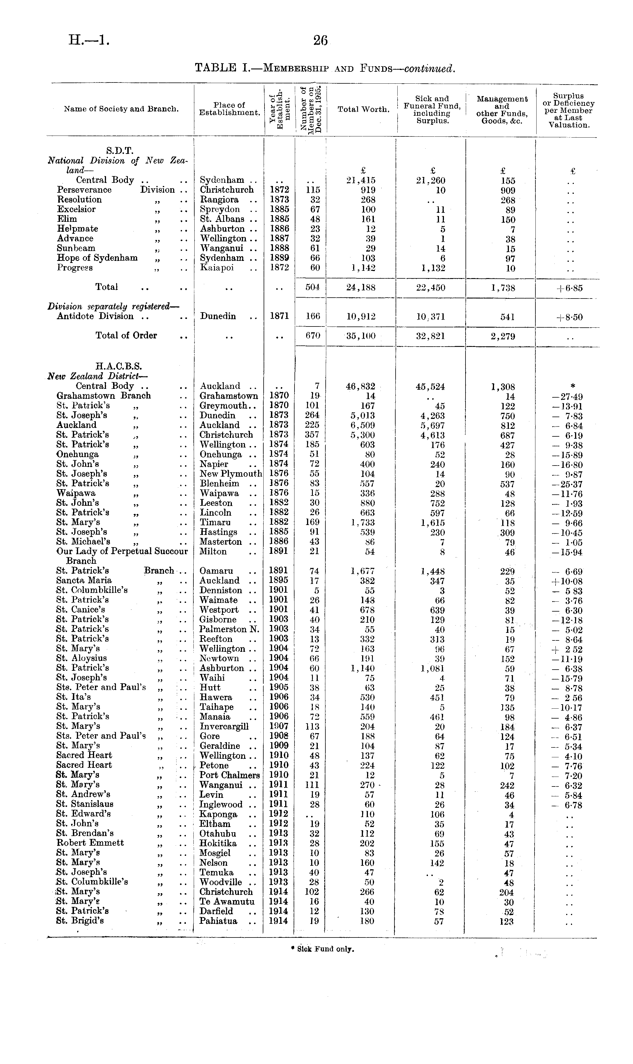* I *0 J o .2 -m * « § | Sick and | Management v 5fL u «v us Name of Society and Branch. Bst abh S liment. | |Is Total Worth. F ™ e c ™J,f n u g nd . | other al^ unaBi per Member W» H §9g I Surplus. | Goods, &c. vJi +• El) <a ® Valuation. 1 a " | S.D.T. National Division of New Zealand — £ £ £ £ Central Body .. .. Sydenham .. .. .. 21,415 . 21,260 155 Perseverance Division .. Christ church 1872 115 919 10 909 Resolution „ ,. Rangiora .. 1S73 32 268 .. 268 Excelsior „ .. Spreydon .. 1885 67 100 11 89 Elim „ .. St. Albans .. 1885 48 161 11 150 Helpmate „ .. Ashburton .. 1886 23 12 5 7 Advance „ .. Wellington .. 1887 32 39 1 38 Sunbeam „ .. Wanganui .. 1888 61 29 14 15 Hope of Sydenham „ .. Sydenham .. 1889 66 103 6 97 Progress „ .. Kaiapoi .. 1872 60 1,142 1,132 10 Total .. .. .. .. 504 24,188 22,450 1,738 +6-85 Division separately registered— Antidote Division .. .. Dunedin .. 1871 166 10,912 10,371 541 +8-50 Total of Order .. .. .. 670 35,100 32,821 2,279 H.A.C.B.S. New Zealand District— Centra] Body .. .. Auckland .. .. 7 46,832 45,524 1,308 * Grahamstown Branch .. Grahamstown 1870 1!) 14 .. 14 -27-49 St. Patrick's „ .. Greymouth.. 1870 101 167 45 122 -13-91 St. Joseph's „ .. Dunedin .. 1873 264 5,013 4,263 750 — 7-83 Auckland „ .. Auckland .. 1873 225 6,509 5,697 812 — 6-84 St. Patrick's „ .. Christchurch 1873 357 5,300 4,613 687 — 6-19 St. Patrick's „ .. Wellington .. 1874 185 603 176 427 — 9-38 Onehunga „ .. Onehunga .. 1874 51 80 52 28 —15-89 St. John's „ .. Napier .. 1874 72 400 240 160 -16-80 St. Joseph's „ .. New Plymouth 1876 55 104 14 90 — 9-87 St. Patrick's „ .. Blenheim .. 1876 83 557 20 537 —25-37 Waipawa „ .. Waipawa .. 1876 15 336 288 48 -11-76 St. John's „ .. Leeston .. 1882 30 880 752 128 — 1 -93 St. Patrick's „ ... Lincoln .. 1882 26 663 597 66 —12-59 St. Mary's „ .. Timaru .. 1882 169 1,733 1,615 118 — 9-66 St. Joseph's „ .. Hastings .. 1885 91 .539 230 309 -10-45 St. Michael's „ .. Masterton .. 1886 43 86 7 79 — 1-05 Our Lady of Perpetual Succour Milton .. 1891 21 54 8 46 -15-94 Branch St. Patrick's Branch .. Oamaru .. 1891 74 1,677 .1,448 229 — 6-69 Sancta Maria „ .. Auckland .. 1895 17 382 347 35 +10-08 St. Columbkille's „ .. Denniston .. 1901 5 55 3 52 — 5 83 St. Patrick's ,. .. Waimate .. 1901 26 148 66 82 — 3-76 St. Canice's „ .. Westport .. 1901 41 678 639 39 — 6-30 St. Patrick's „ .. Gisborne .. 1903 40 210 129 81 —12-18 St. Patrick's „ .. Palmerston N. 1903 34 55 40 15 — 5-02 St. Patrick's „ .. Reefton .. 1903 13 332 313 19 — 8-64 St. Mary's „ : . j Wellington .. 1904 72 163 96 67 -f 2 52 St. Aloysius „ j.. Newtown .. 1904 66 191 39 152 -11-19 St. Patrick's „ .. Ashburton .. 1904 60 1,140 1,081 59 — 6-38 St. Joseph's „ :.. I Waihi .. 1904 11 75 4 7.1 —15-79 Sts. Peter and Paul's „ .. j Hutt .. 1905 38 63 25 38 — 8-78 St. Ita's „ 1 .. j Hawera .. 1906 34 530 451 79 — 2 56 St. Mary's „ ;.. Taihape .. 1906 18 140 5 135 -10-17 St. Patrick's „ ;.. Manaia .. 1906 72 559 461 98 — 4-86 St. Mary's „ .. Invercargill 1907 113 204 20 1.84 — 6-37 Sts. Peter and Paul's „ j.. Gore .. 1908 67 188 64 124 — 6-51 St. Mary's „ '.. | Geraldine .. 1909 21 104 87 17 — 5-34 Sacred Heart ,, .. Wellington .. 1910 48 137 62 75 — 4-10 Sacred Heart „ .. I Petone .. 1910 43 224 122 102 — 7-76 St. Mary's „ .. j Port Chalmers 1910 21 12 5 7 — 7-20 St. Mary's „ j Wanganui .. 1911 111 270 - 28 242 — 6-32 St. Andrew's „ .. Levin .. 1911 19 57 11 46 — 5-84 St. Stanislaus „ .. Inglewood .. 1911 28 60 26 34 — 6-78 St. Edward's „ .. Kaponga ..1912 .. 110 106 4 St. John's „ .. i Eltham .. 1912 19 52 35 17 St. Brendan's „ .. j Otahubu .. 1913 32 112 69 43 Robert Emmett „ ... j Hokitika .. 1913 28 202 155 47 St. Mary's „ .. Mosgiel .. 1913 10 83 26 57 St. Mary's „ .. | Nelson .. 1913 10 160 142 18 St. Joseph's „ .. | Temuka .. 1913 40 47 .. 47 St. Columbkille's „ .. j Woodville .. 1913 28 50 2 48 ;St. Mary's „ .. j Christchurch 1914 102 266 62 204 St. Mary's „ .. j Te Awamutu 1914 16 40 10 30 St. Patrick's „ .. j Darfield .. 1914 12 130 78 52 St. Brigid's „ .. j Pahiatua .. 1914 19 180 57 123 * Sick Fund only.