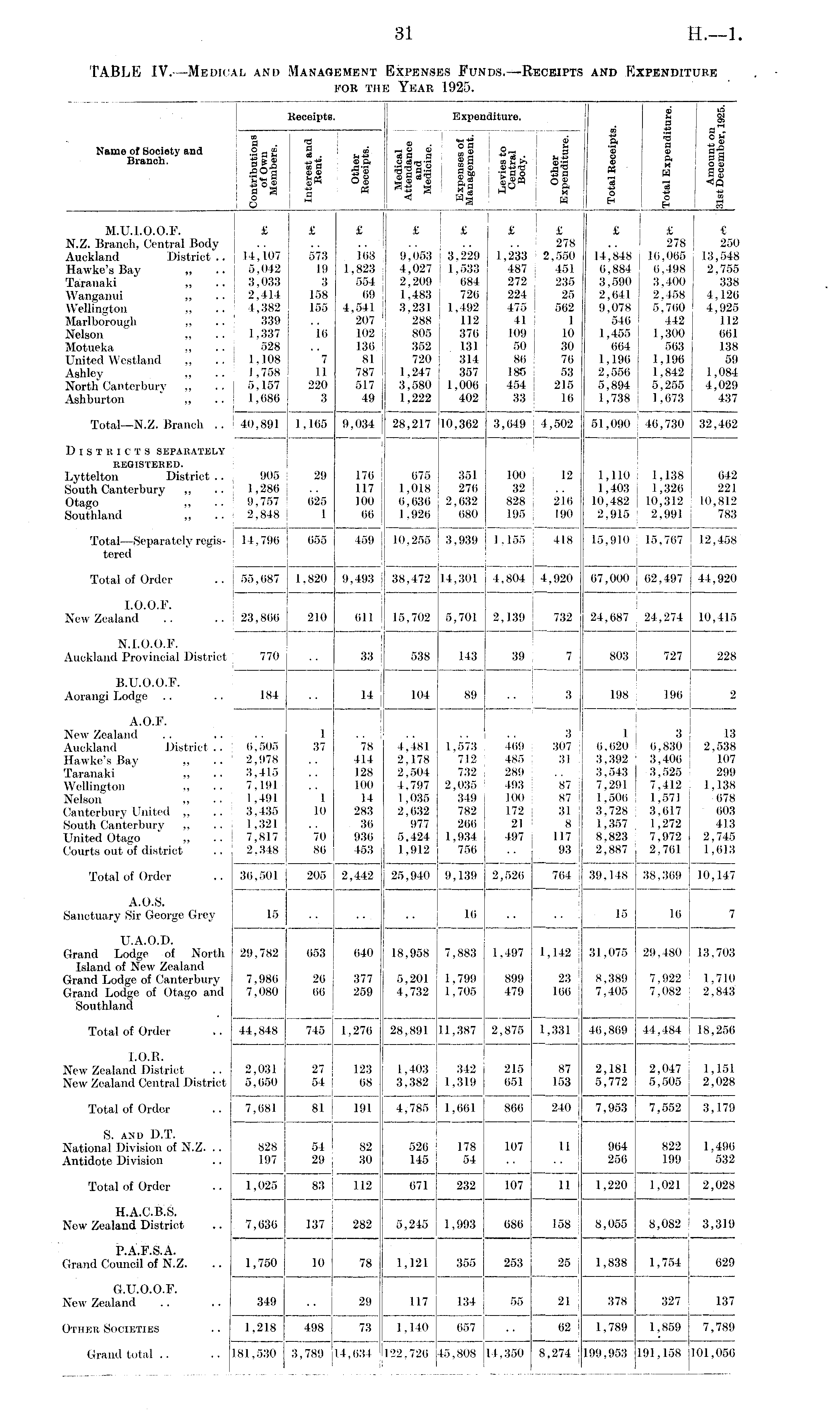 TABLE IV.—Medical and Management Expenses Funds.—Receipts and Expenditure for the Year 1925.
