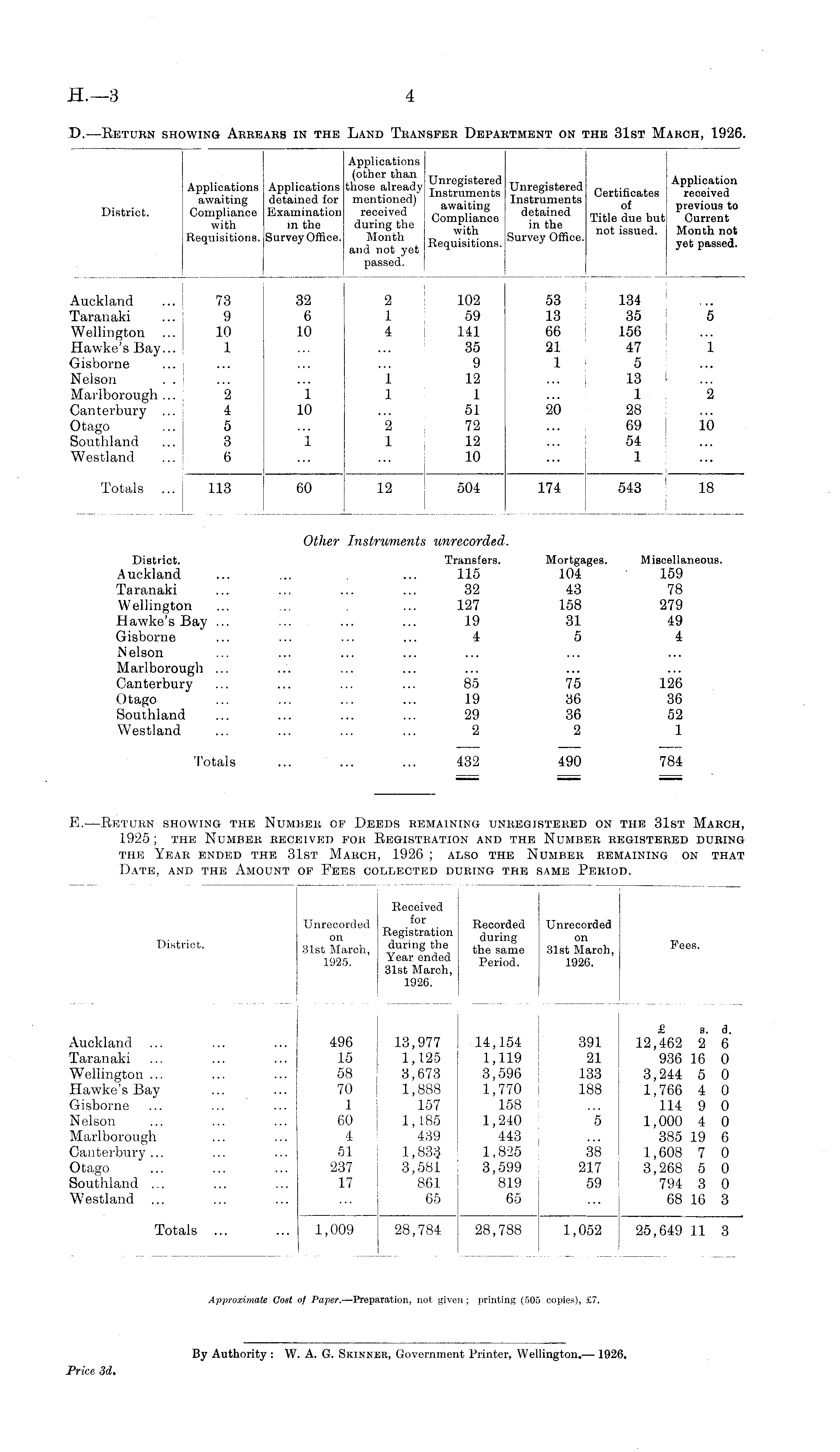 D. —Return showing Arrears in the Land Transfer Department on the 31st March, 1926.