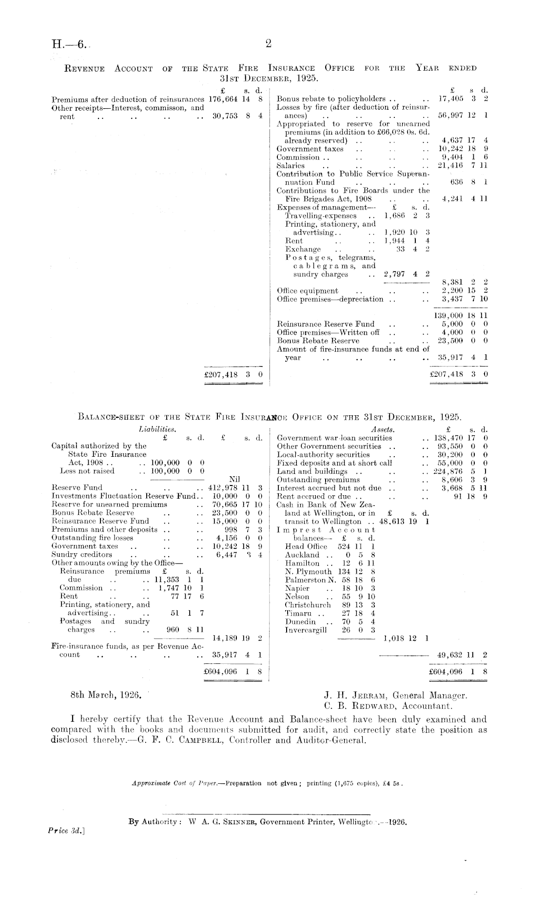 Revenue Account of the State Fire Insurance Office for the Year ended 31st December, 1925. £ s. d. £ s d. Premiums after deduction of reinsurances 176,664 14 8 Bonus rebate to policyholders .. .. 17,405 3 2 Other receipts—lnterest, commisson, and Losses by fire (after deduction of reinsurrent .. .. .. .. 30,753 8 4 ances) .. .. .. .. 56,997 12 1 Appropriated to reserve for unearned premiums (in addition to £66,028 os. 6d. already reserved) .. .. .. 4,637 17 4 Government taxes .. .. .. 10,242 18 9 Commission .. .. . . .. 9,404 1 6 Salaries .. .. .. .. 21,416 7 11 ' Contribution to Public Service Superannuation Fund .. .. .. 636 8 1 Contributions to Fire Boards under the Fire Brigades Act, 1908 .. .. 4,241 411 Expenses of management— £ s. d. Travelling-expenses .. 1, 686 2 3 Printing, stationery, and advertising.. .. 1,920 10 3 Rent .. .. 1,944 1 4 Exchange .. .. 33 4 2 Postages, telegrams, ; cablegrams, and sundry charges .. 2,797 4 2 8,381 2 2 Office equipment .. .. .. 2,200 15 2 Office premises—depreciation .. .. 3,437 7 10 139,000 18 11 Reinsurance Reserve Fund .. .. 5,000 0 0 Office premises—Written off .. .. 4,000 0 0 Bonus Rebate Reserve .. .. 23,500 0 0 Amount of fire-insurance funds at end of year .. .. .. .. 35,917 4 1 £207,418 3 0 £207,418 3 0 1 i 1 111 Balance-sheet of the State Fire Insurance Office on the 31st December, 1925. Liabilities. Assets. £ s. d. £ s. d. £ s. d. Government war loan securities .. 138,470 17 0 Capital authorized by the Other Government securities .. .. 93,550 0 0 State Fire Insurance Local-authority securities .. .. 30,200 0 0 Act, 1908 .. .. 100,000 0 0 Fixed deposits and at short call .. 55,000 0 0 Less not raised .. 100,000 0 0 Land and buildings .. .. .. 224,876 5 1 ■ Nil Outstanding premiums .. .. 8,606 3 9 Reserve Fund .. .. .. 412,978 11 3 Interest accrued but not due .. .. 3,668 511 Investments Fluctuation Reserve Fund.. 10,000 0 0 Rent accrued or due .. .. .. 91 18 9 Reserve for unearned premiums .. 70,665 17 10 Cash in Bank of New ZeaBonus Rebate Reserve .. .. 23,500 0 0 land at Wellington, or in £ s. d. Reinsurance Reserve Fund .. .. 15,000 0 0 transit to Wellington .. 48,613 19 1 Premiums and other deposits .. .. 998 7 3 Imprest Account Outstanding fire losses .. .. 4,156 0 0 balances— £ s. d. Government taxes .. .. .. 10,242 18 9 Head Office 524 11 1 Sundry creditors .. .. .. 6,447 3 4 Auckland .. 0 5 8 Other amounts owing by the Office— Hamilton .. 12 611 Reinsurance premiums £ s. d. N. Plymouth 134 12 8 due .. .. 11,353 1 1 PalmerstonN. 58 18 6 Commission .. .. 1,747 10 1 Napier .. 18 10 3 Rent . . .. 77 17 6 Nelson .. 55 9 10 Printing, stationery, and Christchurch 89 13 3 advertising.. .. 51 1 7 Timaru .. 27 18 4 Postages and sundry Dunedin .. 70 5 4 charges .. .. 960 811 Invercargill 26 0 3 ; — 14,189 19 2 1,018 12 1 Fire-insurance funds, as per Revenue Account .. .. .. .. 35,917 4 1 49,632 11 2 £604,096 1 8 £604,096 1 8 Bth March, 1926. J. H. Jerram, General Manager. C. B. Redward, Accountant. I hereby certify that the Revenue Account and Balance-sheet have been duly examined and compared with the books and documents submitted for audit, and correctly state the position as disclosed thereby.-—G. F. C. Campbell, Controller and Auditor-General.