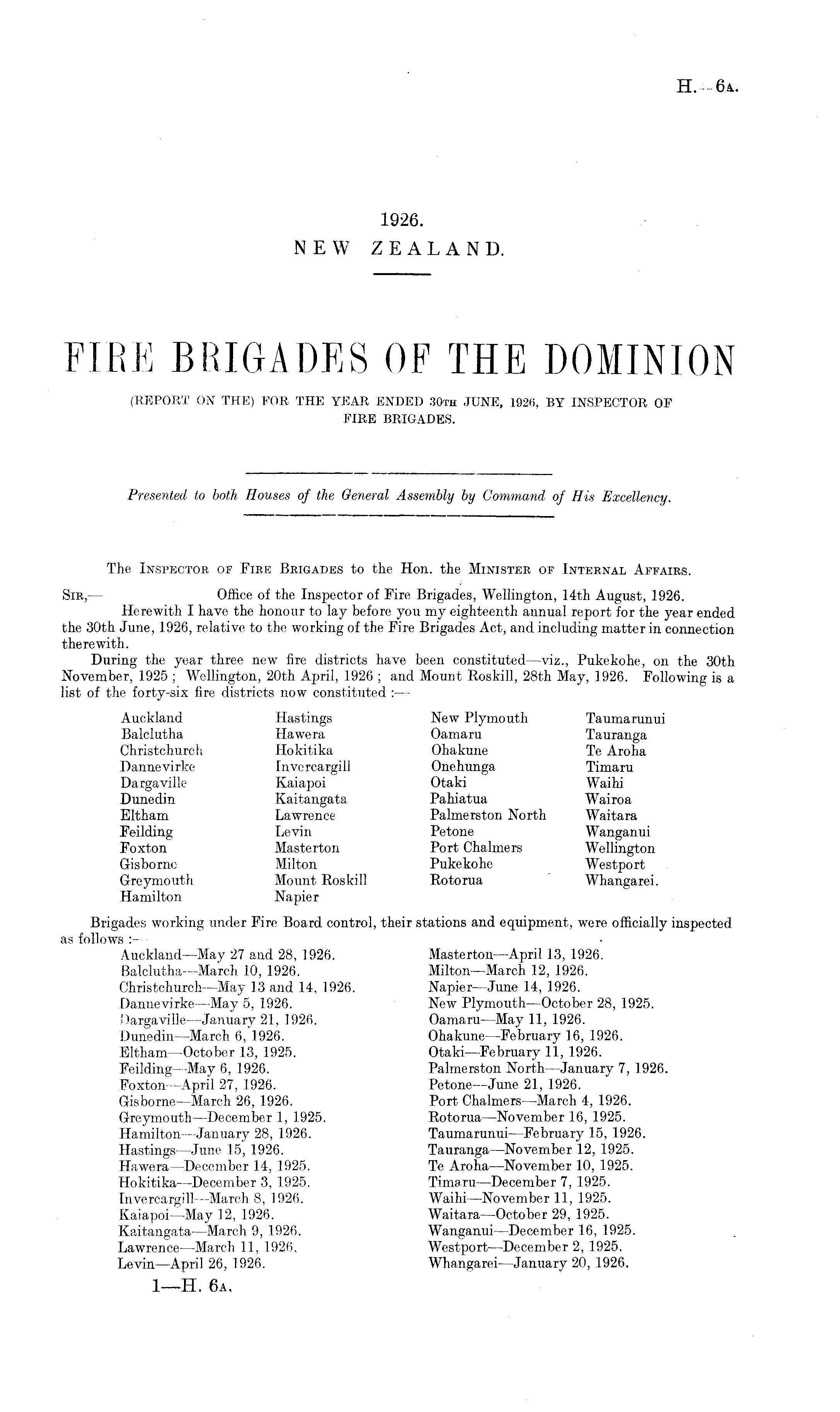 The Inspector of Fire Brigades to the Hon. the Minister op Internal Apfairs. Sir, — Office of the Inspector of Fire Brigades, Wellington, 14th August, 1926. Herewith I have the honour to lay before you my eighteenth annual report for the year ended the 30th June, 1926, relative to the working of the Fire Brigades Act, and including matter in connection therewith. During the year three new fire districts have been constituted —viz., Pukekohe, on the 30th November, 1925 ; Wellington, 20th April, 1926 ; and Mount Roskill, 28th May, 1926. Following is a list of the forty-six fire districts now constituted : — Auckland Hastings New Plymouth Taumarunui Balclutha Hawera Oamaru Tauranga Christchurch Hokitika Ohakune Te Aroha Dannevirke Invercargill Onehunga Timaru Dargaville Kaiapoi Otaki Waihi Dunedin Kaitangata Pahiatua Wairoa Eltham Lawrence Palmerstori North Waitara Feilding Levin Petone Wanganui Foxton Masterton Port Chalmers Wellington Gisborne Milton Pukekohe Westport Greymouth Mount Roskill Rotorua Whangarei. Hamilton Napier Brigades working under Fire Board control, their stations and equipment, were officially inspected as follows Auckland —May 27 and 28, 1926. Masterton —April 13, 1926. Balclutha —March 10, 1926. Milton —March 12, 1926. Christchurch —May 13 and 14, 1926. Napier —June 14, 1926. Dannevirke —May 5, 1926. New Plymouth —October 28, 1925. Dargaville —January 21, 1926. Oamaru —May 11, 1926. Dunedin —March 6, 1926. Ohakune —February 16, 1926. Eltham —October 13, 1925. Otaki —February 11, 1926. Feilding —May 6, 1926. Palmerston North —January 7, 1926. Foxton —April 27, 1926. Petone —June 21, 1926. Gisborne —March 26, 1926. Port Chalmers —March 4, 1926. Greymouth —December 1, 1925. Rotorua—November 16, 1925. Hamilton —January 28, 1926. Taumarunui —February 15, 1926. Hastings —June 15, 1926. Tauranga —November 12, 1925. Hawera—December 14, 1925. Te Aroha —November 10, 1925. Hokitika —December 3, 1925. Timaru —December 7, 1925. Invercargill —March 8, 1926. Waihi —November 11, 1925. Kaiapoi —May 12, 1926. Waitara —October 29, 1925. Kaitangata —March 9, 1926. Wanganui —December 16, 1925. Lawrence —March 11, 1926, Westport—December 2, 1925. Levin —April 26, 1926. Whangarei —January 20, 1926.