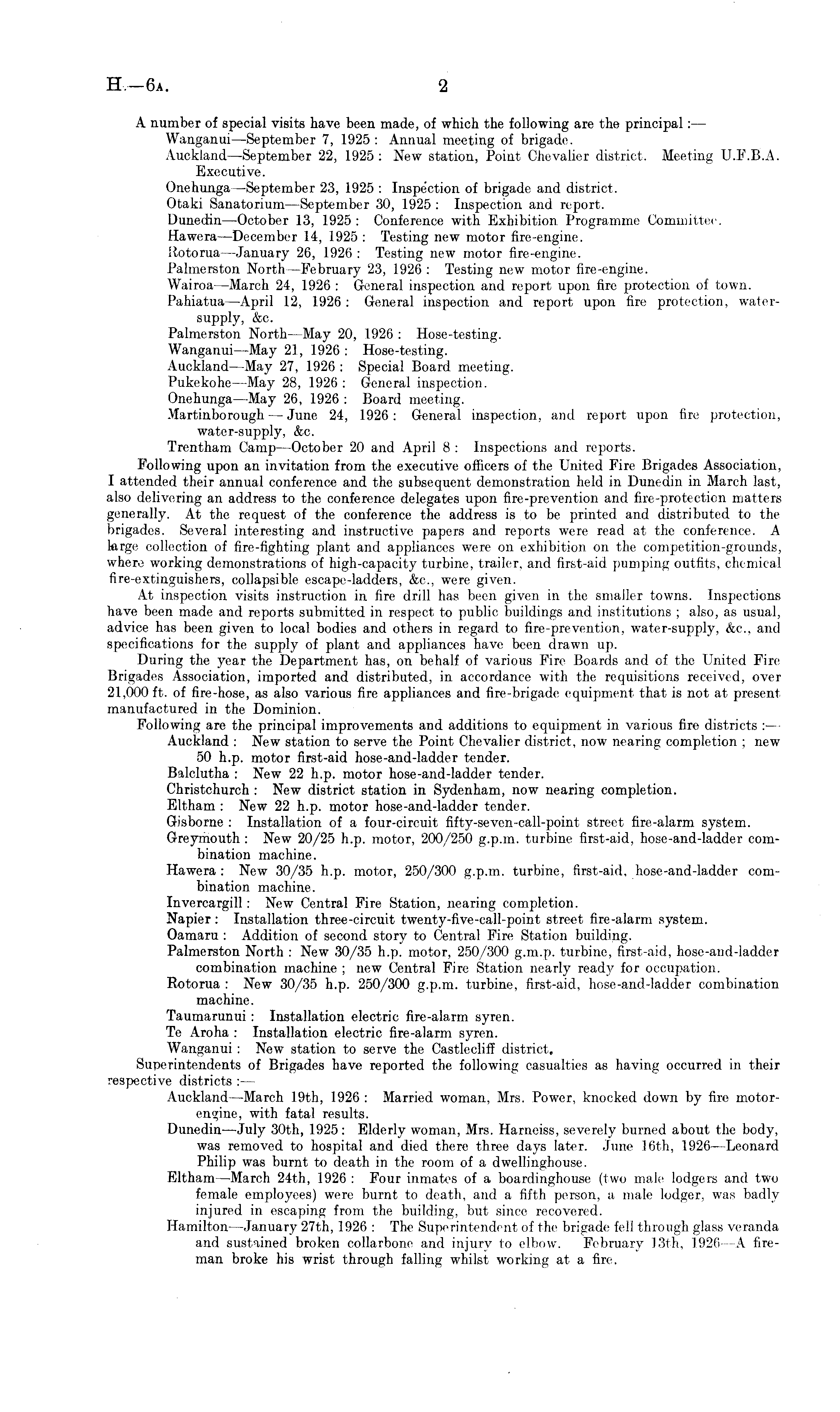 A number of special visits have been made, of which the following are the principal: — Wanganui—September 7, 1925 : Annual meeting of brigade. Auckland—-September 22, 1925 : New station, Point Chevalier district. Meeting U.F.B.A. Executive. Onehunga—September 23, 1925 : Inspe'ction of brigade and district. Otaki Sanatorium —September 30, 1925 : Inspection and report. Dunedin—October 13, 1925 : Conference with Exhibition Programme Committee. Hawera—December 14, 1925 : Testing new motor fire-engine. Rotorua —January 26, 1926 : Testing new motor fire-engine. Palmerston North—February 23, 1926 : Testing new motor fire-engine. Wairoa—March 24, 1926 : General inspection and report upon fire protection of town. Pahiatua—April 12, 1926: General inspection and report upon fire protection, watersupply, &c. Palmerston North—May 20, 1926 : Hose-testing. Wanganui- —May 21, 1926 : Hose-testing. Auckland—May 27, 1926 : Special Board meeting. Pukekohe—May 28, 1926 : General inspection. Onehunga—May 26, 1926 : Board meeting. Martinborough — June 24, 1926: General inspection, and report upon fire protection, water-supply, &c. Trentham Camp—October 20 and April 8 : Inspections and reports. Following upon an invitation from the executive officers of the United Fire Brigades Association, I attended their annual conference and the subsequent demonstration held in Dunedin in March last, also delivering an address to the conference delegates upon fire-prevention and fire-protection matters generally. At the request of the conference the address is to be printed and distributed to the brigades. Several interesting and instructive papers and reports were read at the conference. A large collection of fire-fighting plant and appliances were on exhibition on the competition-grounds, where working demonstrations of high-capacity turbine, trailer, and first-aid pumping outfits, chemical fire-extinguishers, collapsible escape-ladders, &c., were given. At inspection visits instruction in fire drill has been given in the smaller towns. Inspections have been made and reports submitted in respect to public buildings and institutions ; also, as usual, advice has been given to local bodies and others in regard to fire-prevention, water-supply, &c., and specifications for the supply of plant and appliances have been drawn up. During the year the Department has, on behalf of various Fire Boards and of the United Fire Brigades Association, imported and distributed, in accordance with the requisitions received, over 21,000 ft. of fire-hose, as also various fire appliances and fire-brigade equipment that is not at present manufactured in the Dominion. Following are the principal improvements and additions to equipment in various fire districts :■ — Auckland : New station to serve the Point Chevalier district, now nearing completion ; new 50 h.p. motor first-aid hose-and-ladder tender. Balclutha : New 22 h.p. motor hose-and-ladder tender. Christchurch : New district station in Sydenham, now nearing completion. Eltham : New 22 h.p. motor hose-and-ladder tender. Gisborne : Installation of a four-circuit fifty-seven-call-point street fire-alarm system. Greymouth : New 20/25 h.p. motor, 200/250 g.p.m. turbine first-aid, hose-and-ladder combination machine. Hawera : New 30/35 h.p. motor, 250/300 g.p.m. turbine, first-aid, hose-and-ladder combination machine. Invercargill: New Central Fire Station, nearing completion. Napier: Installation three-circuit twenty-five-call-point street fire-alarm system. Oamaru : Addition of second story to Central Fire Station building. Palmerston North : New 30/35 h.p. motor, 250/300 g.m.p. turbine, first-aid, hose-and-ladder combination machine ; new Central Fire Station nearly ready for occupation. Rotorua : New 30/35 h.p. 250/300 g.p.m. turbine, first-aid, hose-and-ladder combination machine. Taumarunui: Installation electric fire-alarm syren. Te Aroha : Installation electric fire-alarm syren. Wanganui : New station to serve the Castlecliff district. Superintendents of Brigades have reported the following casualties as having occurred in their respective districts : — Auckland —March 19th, 1926 : Married woman, Mrs. Power, knocked down by fire motorengine, with fatal results. Dunedin—July 30th, 1925: Elderly woman, Mrs. Harneiss, severely burned about the body, was removed to hospital and died there three days later. June 16th, 1926 —Leonard Philip was burnt to death in the room of a dwellinghouse. Eltham—March 24th, 1926 : Four inmates of a boardinghouse (two male lodgers and two female employees) were burnt to death, and a fifth person, a male lodger, was badly injured in escaping from the building, but since recovered. Hamilton —January 27th, 1926 : The Superintendent of the brigade fell through glass veranda and sustained broken collarbone and injury to elbow. February 13th, 1926 —A fireman broke his wrist through falling whilst working at a fire,