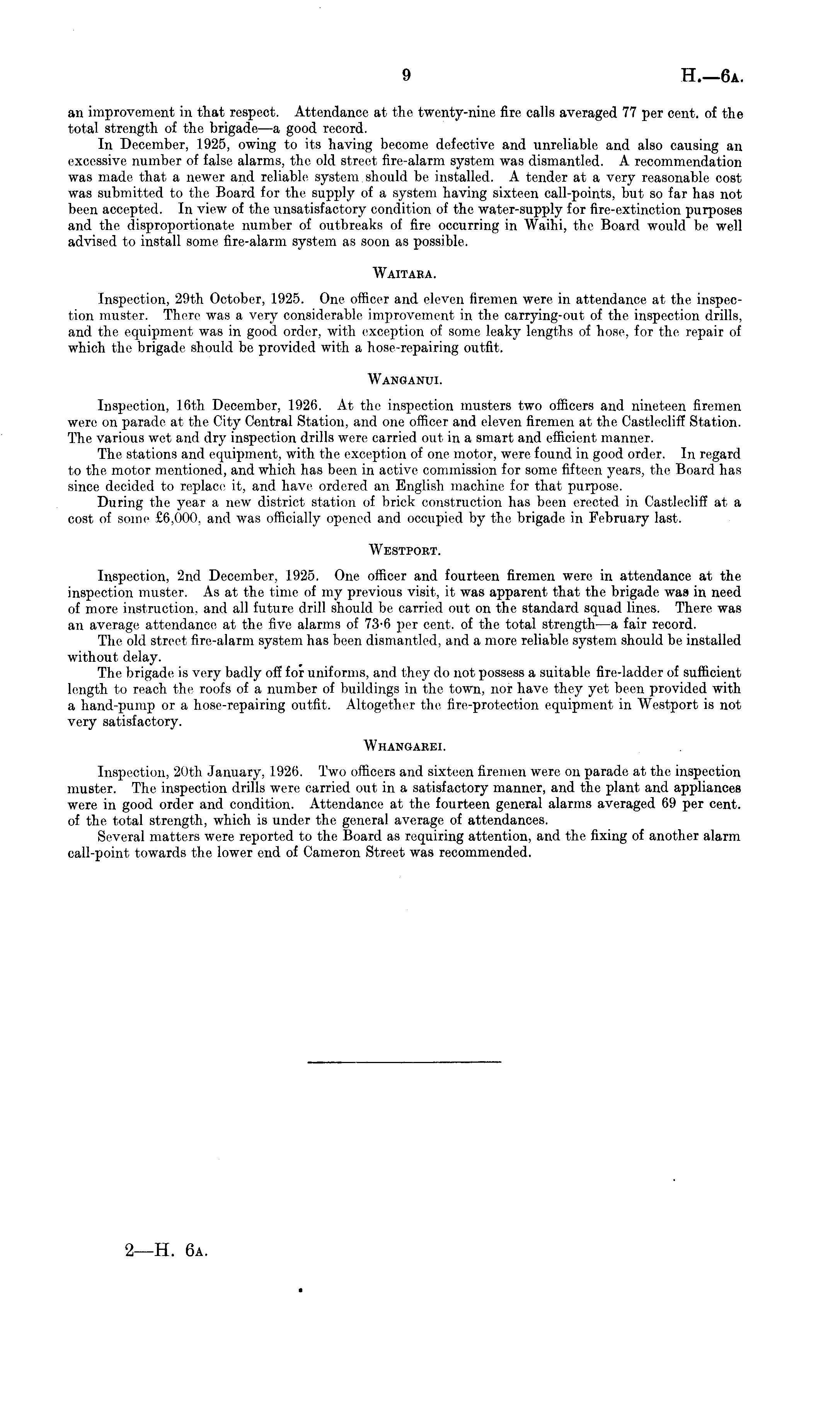 an improvement in that respect. Attendance at the twenty-nine fire calls averaged 77 per cent, of the total strength of the brigade—a good record. In December, 1925, owing to its having become defective and unreliable and also causing an excessive number of false alarms, the old street fire-alarm system was dismantled. A recommendation was made that a newer and reliable system. should be installed. A tender at a very reasonable cost was submitted to the Board for the supply of a system having sixteen call-points, but so far has not been accepted. In view of the unsatisfactory condition of the water-supply for fire-extinction purposes and the disproportionate number of outbreaks of fire occurring in Waihi, the Board would be well advised to install some fire-alarm system as soon as possible. Waitara. Inspection, 29th October, 1925. One officer and eleven firemen were in attendance at the inspection muster. There was a very considerable improvement in the carrying-out of the inspection drills, and the equipment was in good order, with exception of some leaky lengths of hose, for the repair of which the brigade should be provided with a hose-repairing outfit. Wanganui. Inspection, 16th December, 1926. At the inspection musters two officers and nineteen firemen were on parade at the City Central Station, and one officer and eleven firemen at the Castlecliff Station. The various wet and dry inspection drills were carried out in a smart and efficient manner. The stations and equipment, with the exception of one motor, were found in good order. In regard to the motor mentioned, and which has been in active commission for some fifteen years, the Board has since decided to replace it, and have ordered an English machine for that purpose. During the year a new district station of brick construction has been erected in Castlecliff at a cost of some £6,000, and was officially opened and occupied by the brigade in February last. Westport. Inspection, 2nd December, 1925. One officer and fourteen firemen were in attendance at the inspection muster. As at the time of my previous visit, it was apparent that the brigade was in need of more instruction, and all future drill should be carried out on the standard squad lines. There was an average attendance at the five alarms of 73-6 per cent, of the total strength —a fair record. The old street fire-alarm system has been dismantled, and a more reliable system should be installed without delay. The brigade is very badly off for uniforms, and they do not possess a suitable fire-ladder of sufficient length to reach the roofs of a number of buildings in the town, nor have they yet been provided with a hand-pump or a hose-repairing outfit. Altogether the fire-protection equipment in Westport is not very satisfactory. Whangarei. Inspection, 20th January, 1926. Two officers and sixteen firemen were on parade at the inspection muster. The inspection drills were carried out in a satisfactory manner, and the plant and appliances were in good order and condition. Attendance at the fourteen general alarms averaged 69 per cent, of the total strength, which is under the general average of attendances. Several matters were reported to the Board as requiring attention, and the fixing of another alarm call-point towards the lower end of Cameron Street was recommended.