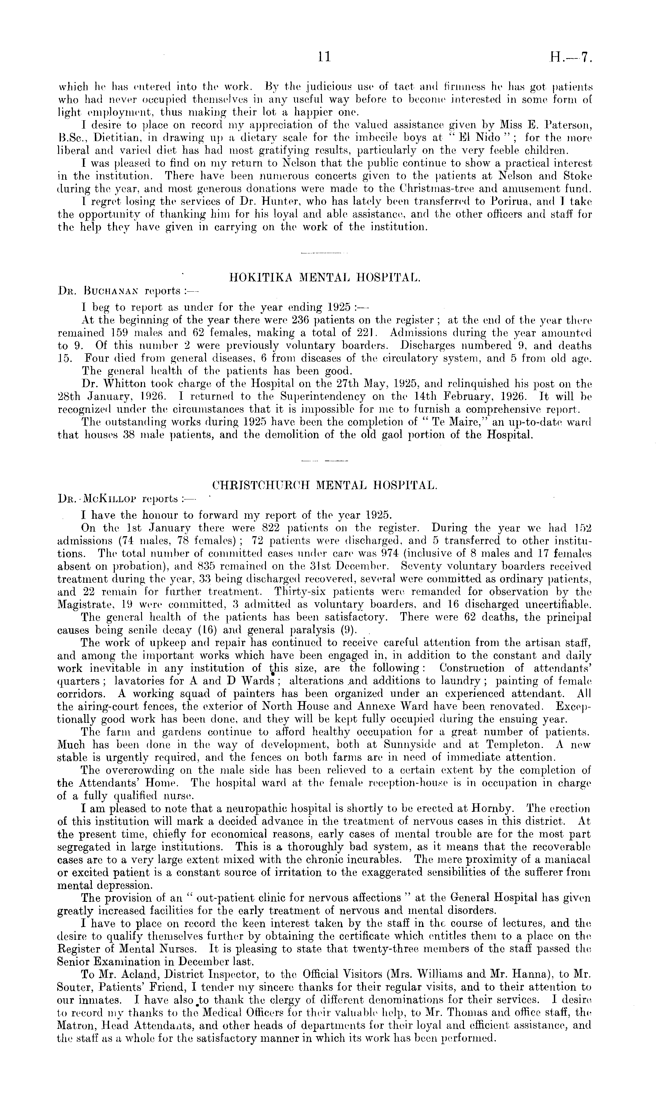which he has entered into the work. By the judicious use of tact and firmness he has got patients who had never occupied themselves in any useful way before to become interested in some form of light employment, thus making their lot a happier one. I desire to place on record my appreciation of the valued assistance given by Miss E. Paterson, B.Sc., Dietitian, in drawing up a dietary scale for the imbecile boys at "El Nido " ; for the more liberal and varied diet has had most gratifying results, particularly on the very feeble children. I was pleased to find on my return to Nelson that the public continue to show a practical interest in the institution. There have been numerous concerts given to the patients at Nelson and Stoke during the year, and most generous donations were made to the Christmas-tree and amusement fund. I regret losing the services of Dr. Hunter, who has lately been transferred to Porirua, and I take the opportunity of thanking him for his loyal and able assistance, and the other officers and staff for the help they have given in carrying on the work of the institution. HOKITIKA MENTAL HOSPITAL. Dr. Buchanan reports : — I beg to report as under for the year ending 1925 : — At the beginning of the year there were, 236 patients on the register ; at the end of the year there remained 159 males and 62 females, making a total of 221. Admissions during the year amounted to 9. Of this number 2 were previously voluntary boarders. Discharges numbered 9, and deaths 15. Pour died from general diseases, 6 from diseases of the circulatory system, and 5 from old age. The general health of the patients has been good. Dr. Whitton took charge of the Hospital on the 27th May, 1925, and relinquished his post on the 28th January, 1926. I returned to the Superintendency on the 14th February, 1926. It will be recognized under the circumstances that it is impossible for me to furnish a comprehensive report. The outstanding works during 1925 have been the completion of " Te Maire," an up-to-date ward that houses 38 male patients, and the demolition of the old gaol portion of the Hospital. CHRISTCHURCH MENTAL HOSPITAL. Dr. McKillop reports: — ' I have the honour to forward my report of the year 1925. On the Ist January there were 822 patients on the register. During the year we had 152 admissions (74 males, 78 females) ; 72 patients were discharged, and 5 transferred to other institutions. The total number of committed cases under care was 974 (inclusive of 8 males and 17 females absent on probation), and 835 remained on the 31st December. Seventy voluntary boarders received treatment during the year, 33 being discharged recovered, several were committed as ordinary patients, and 22 remain for further treatment. Thirty-six patients were remanded for observation by the Magistrate, 19 were committed, 3 admitted as voluntary boarders, and 16 discharged uncertifiable. The general health of the patients has been satisfactory. There were 62 deaths, the principal causes being senile decay (16) and general paralysis (9). The work of upkeep and repair has continued to receive careful attention from the artisan staff, and among the important works which have been engaged in, in addition to the constant and daily work inevitable in any institution of this size, are the following: Construction of attendants' quarters ; lavatories for A and D Wards ; alterations .and additions to laundry ; painting of female corridors. A working squad of painters has been organized under an experienced attendant. All the airing-court fences, the exterior of North House and Annexe AVard have been renovated. Exceptionally good work has been done, and they will be kept fully occupied during the ensuing year. The farm and gardens continue to afford healthy occupation for a great number of patients. Much has been done in the way of development, both at Sunnyside and at Templeton. A new stable is urgently required, and the fences on both farms are in need of immediate attention. The overcrowding on the male side has been relieved to a certain extent by the completion of the Attendants' Home. The hospital ward at the female reception-house is in occupation in charge of a fully qualified nurse. lam pleased to note that a neuropathic hospital is shortly to be erected at Hornby. The erection of this institution will mark a decided advance in the treatment of nervous cases in this district. At the present time, chiefly for economical reasons, early cases of mental trouble are for the most part segregated in large institutions. This is a thoroughly bad system, as it means that the recoverable cases are to a very large extent mixed with the chronic incurables. The mere proximity of a maniacal or excited patient is a constant source of irritation to the exaggerated sensibilities of the sufferer from mental depression. The provision of an " out-patient clinic for nervous affections " at the General Hospital has given greatly increased facilities for the early treatment of nervous and mental disorders. I have to place on record the keen interest taken by the staff in the course of lectures, and the desire to qualify themselves further by obtaining the certificate which entitles them to a place on the Register of Mental Nurses. It is pleasing to state that twenty-three members of the staff passed the Senior Examination in December last. To Mr. Acland, District Inspector, to the Official Visitors (Mrs. Williams and Mr. Hanna), to Mr. Souter, Patients' Friend, I tender my sincere thanks for their regular visits, and to their attention to our inmates. I have also # to thank the clergy of different denominations for their services. I desire to record my thanks to the Medical Officers for their valuable help, to Mr. Thomas and office staff, the Matron, Head Attendants, and other heads of departments for their loyal and efficient assistance, and the staff as a whole for the satisfactory manner in which its work has been performed.