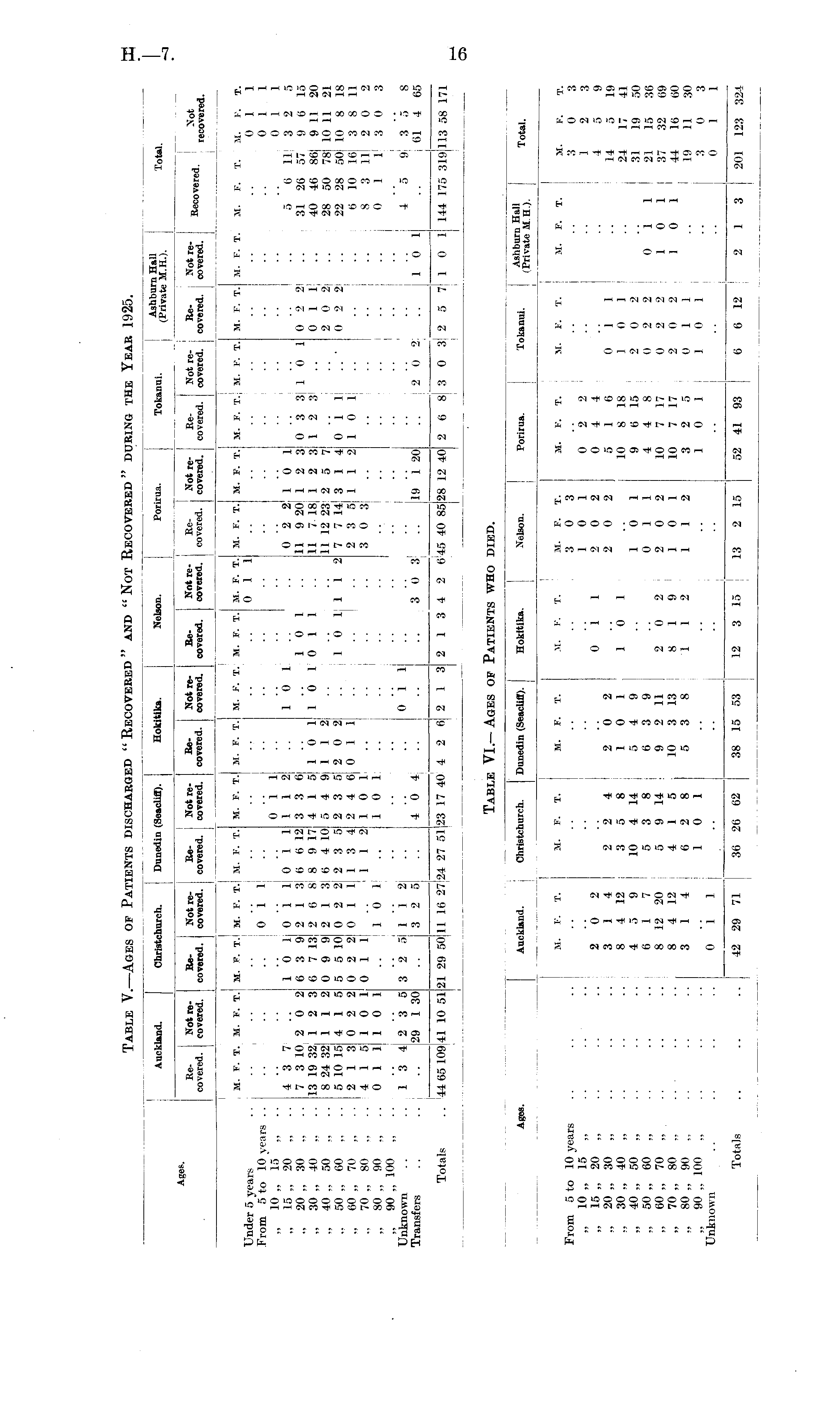 Ages. Auckland. Christchurch. Dunedin (Seacliff). : Hokitika. Nelson. Porirua. Tokanui. : Pri v a to ') Total. j i | ' M. F. T. M. P. T. j M. F. T. M. F. T. \ M. F. T. M. F. T. i M. F. T. M. F. T. M. F. T. From 5 to 10 years .. .. .. .. .. | .. .. >303 .. I .. .. 303 „ 10 „ 15 „ .... .. .. .. . . 1 0 1 0 2 2 .. .. 1 2 3 ,, 15 „ 20 ,, .. .. .. 202 .. .. 011202 044; .. .. 459 „ 20 „ 30 „ .. .. .. 3 1 4 2 2 4 2 0 2 .. 2 0 2 5 1 6 0 11 .. 14 5 19 „ 30 „ 40 „ .. .. .. 8 4 12 3 5 8 1 0 1 1 0 1 .. 10 8 18 J 0 1 . . 24 17 41 „ 40 „ 50 „ .. .. .. 4 5 9 10 4 14 5 4 9 .. 1 0 1 9 6 15 ! 2 0 2 .. 31 19 50 50 „ 60 „ .. .. ..6 1 7 5 3 8 6 3 9 .. 0 1 1 4 4 8:0 2 2 0 1 1 21 15 36 „ 60 „ 70 „ .. .. .. 8 12 20 5 9 14 9 2 11 2 0 2 2 0 2 10 7 17 0 2 2 1 0 1 37 32 69 „ 70 „ 80 „ .. 8 4 12 4 1 5 10 3 13 8 1 9 1 0 1 10 7 17 2 0 2 1 0 1 44 16 60 „ 80 „ 90 „ .. .. .. 3 1 4 6 2 8 5 3 8 1 1 2 1 1 2 3 2 5:0 1 1 .. 19 11 30 „ 90 „ 100 „ .. 10 1 .. .. .. 10 110 1 .. 3 0 3 Unknown .. .. .. ..011 .. .. .. .. .. .. .. 011 Totals .. .. .. | 42 29 71 36 26 62 38 15 53 12 3 15 13 2 15 52 41 93 6 6 12 2 1 3 201 123 324