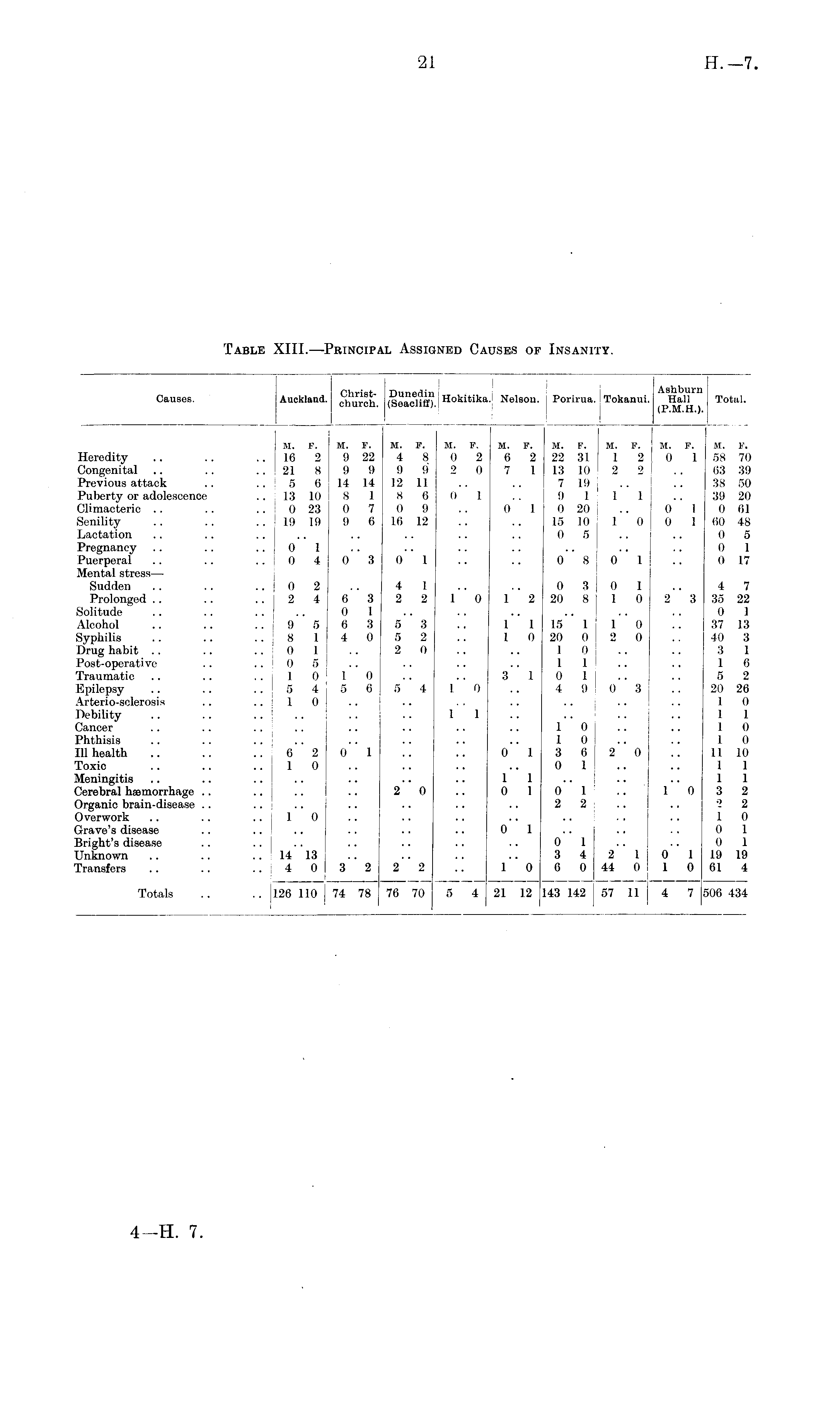 I rnii-iat-- -n.innriivi i ■ ! I Ashburn Causes. j Auckland, j c } (Seacliff) ' Hokitika.j Nelson, j Porirua. I Tokanui. Hall Total. M. F. M. F. M. F. M. F. M. F. M. F. M. F. M. F. M. F. Heredity .. .. .. 16 2 9 22 4 8 0 2 6 2 22 31 | 1 2 0 1 58 70 Congenital .. .. .. 21 8 9 9 9 9 2 0 7 1 13 10 2 2 .. 83 39 Previous attack .. .. 5 6 14 14 12 11 .. .. 7 19 [ .. .. 38 50 Puberty or adolescence 13 10 ! 8 1 8 6 0 1 .. 9 1:11 .. 39 20 Climacteric .. .. 0 23 0 7 0 9 .. 0 1 0 20 0 i 0 61 Senility .. .. .. 19 19 9 6 16 12 .. .. 15 10 1 0 0 ! 60 48 Lactation .. .. .. .. .. .. .. .. 0 5 j .. .. 0 5 Pregnancy .. .. ..01 .. .. .. .. .. .. .. 01 Puerperal .. .. .. 040301 .. .. 0 8 0 1 .. 0 17 Mental stress— Sudden .. .. 0 2 j .. 41 .. .. 0 3 0 1 47 Prolonged .. .. 24 63 22 1 0 1 2 20 8 lo)23 35 22 Solitude .. .. .. ..01 .. .. .. .. 01 Alcohol .. .. ..9 5)6 3 5 3 .. 1 1 15 1 1 0 37 13 Syphilis .. .. ..8 1 4 0 5 2 .. 10 20 0 20 .. 40 3 Drug habit .. .. .. 0 1.. 20 .. .. 10 .... 31 Post-operative .. ..05.. .. .. .. 11 .. .. 16 Traumatic .. .. .. 1 0 ' 1 0 .. .. 3101 .. .. 52 Epilepsy .. .. ..5 4 5 6 5 4 1 0 .. 4 9 0 3 .. 20 26 Arterio-sclerosis .. ..10 .. .. .. .. .. .. .. 10 Debility .. .. .. .. .. .. 11 .. .. .. .. 11 Cancer .. .. .. .. .. .. .. .. 10 .. .. 10 Phthisis .. .. .. .. .. .. .. .. 10 .. .. 10 111 health .. .. ..6201 .. .. 013620 .. 11 10 Toxic .. .. ..10 .. .. .. .. 01 .. .. 11 Meningitis .. .. .. .. .. .. .. 11 .. .. .. 11 Cerebral hemorrhage .. .. .. .. 20 .. 01 01 .. 1032 Organic brain-disease .. .. .. .. .. .. .. 22:.. .. 2 2 Overwork .. .. .. 10 .. .. .. .. ; . . I 10 Grave's disease .. .. .. .. .. .. 01 .. J 01 Bright's disease .. .. .. .. .. .. .. 01 j 01 Unknown .. .. 14 13 .. .. .. .. 3 4 2 1 j 0 1 19 19 Transfers .. .. ..40 32 22 .. 10 60 44 0jl0 614 Totals .. ..126 110 74 78 76 70 5 4 J 21 12 143 142 57 11 j 4 7 506 434
