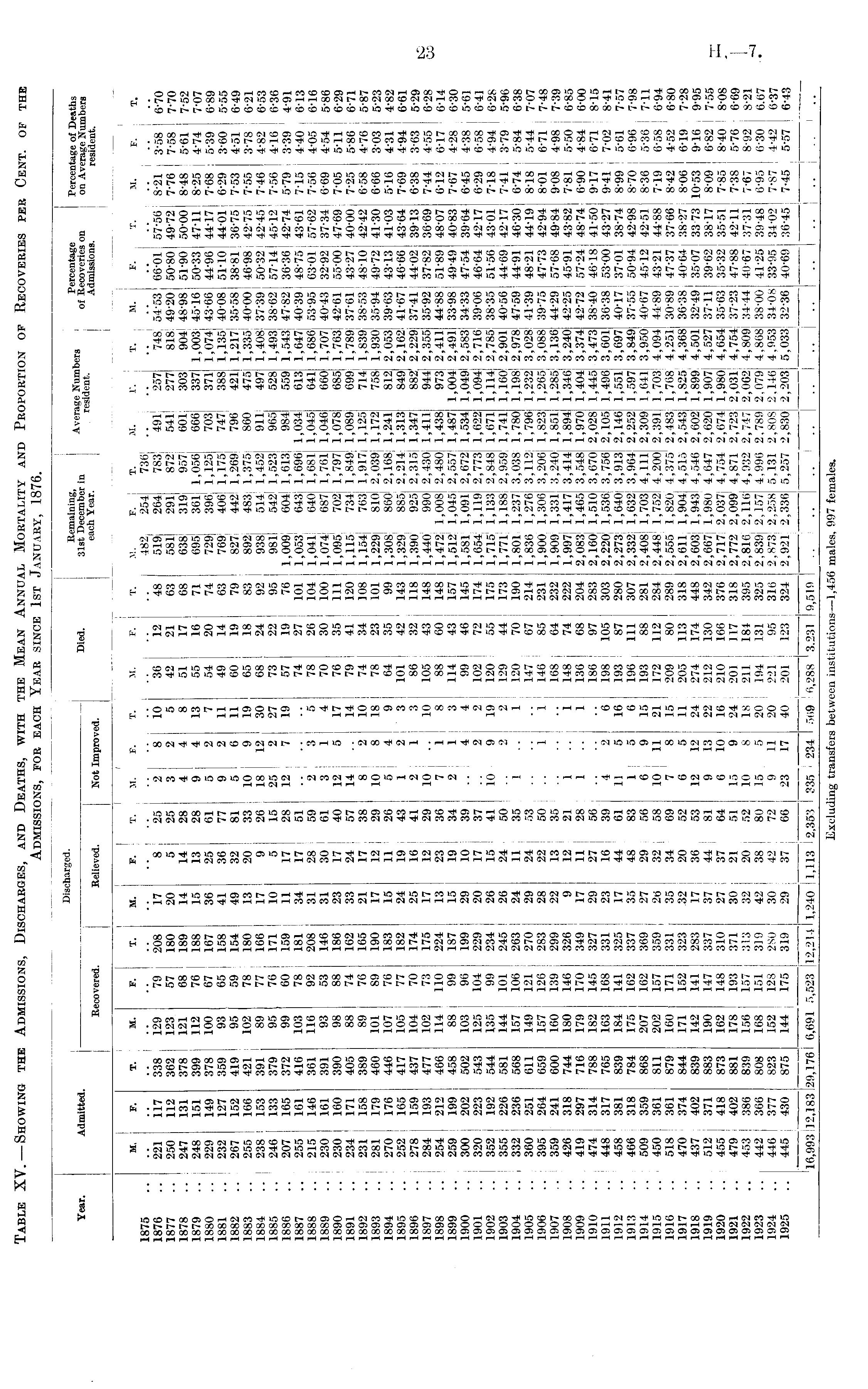 Discharged. Remaining, j a veraae Numbers i Percentage j Percentage of Deaths Year. Admitted. j Died. 31st December in | Sdent i of ecovor ' es on j on Average Numbers Recovered. j Relieved. Not Improved. I eaoh Year - " j Admissions. j resident. I _l I ! I I I I [ : I I | i j j is i M, F. T. M. F. T. I M. F. T. M. F. T. M. F. I T. M. F. T. M. F. | T. j M. F. T. M. F. T. 1875 j .. 482i 254 736 .. I .. I .. 1876 .. 221 117 338 129 79 208 17 8 25 2 ' 8 10 36 12 48 519, 264 783 491 257! 748 54"53 66*01 57*56, 8'21 3'58 6'70 1877 .. 250 112 362 123 57 180 20 5 25 3 j 2 5 42 21 63 581; 291 872 541 277i 818 49'20 50'80 49'72 7'76 7'58 7'70 1878 .. 247 131 378 121 68 189 14 14 28 4 | 4 8 51 17 j 68 638 319 957 601; 303; 904 48'98 51-90 50-00 1 8-48 I 5'61 7-52 1879 .. i 248 151 399 112 76 188! 15 13 28 9 | 4 13 55 16 71 6951 361 1,056 666 337 1,003 45-16 50*33 47-11; 8-25 1 474 7-07 1880 .. 229 149 378 100 67 167 36 25 61 5 12 7 54 20 74 729] 396 1,125 703 371 1,074 43'66 44'96 44-17! 7'68 5-39 6-89 1881 .. 232 127 359 93 65 158 ! 41 36 77 9 2 11 49 14 63 769; 406 1,175 747 388 1,135 40 08 51-10 44 01 6*29 3 60 5*55 1882 .. j 267 152 419 95 59 154 j 49 32 81 5 | 6 11 60 19 79 827; 442 1,269 796i 421 1,217 35-58 38-81 36-75 7*53 4-51 649 1883 .. 255 166 421 j 102 78 180 ! 13 20 33 10 9 19 65 18 83 892| 483 1,375 860 475 1,335 40*00 46-98 42*75 7*55 3-78 ! 6-21 1884 .. I 238 153 391 89 77 166 I 17 9 26 18 J 12 30 68 24 92 9381 514; 1,452 911 497 1,408 37*39 50*32 42-45 1 7-46 4-82 i 6-53 1885 .. 1 246 133 379 95 76 171 i 10 5 15 25 | 2 27 73 22 j 95 98l| 542> 1,523 965 528 1,493 38'62 57-14 45 12 j 7*56 4'16 ! 6*36 1886 .. 207 165 372 99 60 159 11 17 28 12 j 7 19 57 19 76 1,009| 604 1,613 984 559! 1,543 47*82 36*36 42*74' 5*79 3*39 ! 4*91 1887 .. 255 161 416 103 78 181 | 34 17 51 .. .. .. 74 27 j 101 1.053 1 643 1,696 1,034 613 1,647 40*39 48*75 , 43*61 7*15 4 40 613 1888 .. 215 146 361 116 92 208 31 28 59 2 ; 3 5 78 26 j 104 l,041i 640 1,681 1,045 641 1,686 53"95 63 01 j 57-62 1 7-56 4-05 6-16 1889 : 230 161 391 93 53 146 31 30 61 3j 1 4 70 30 { 100 l,074j 687 1,761 1,046 660| 1,707 40*43 32-92 37*34 1 6-69 4-54 5*86 1890 .. 230 160 390 98 88 186 23 17 40 12 ; 5 17 76 35 ! Ill 1,095! 702 1,797 1,078 68o] 1,763| 42*61 55*00 47*69! 7*05 5*11 6*29 1891 .. 234 171 405 88 74 162 33 24 57 14 | 14 79 41 120 1,115 734 1,849 1,089 699] 1,789! 37*61 43*27 40*00 7*25 5*86 j 6*71 1892 .. 231 158 389 89 76 165 J 21 17 38 8 i 2 10 ; 74 34 ]08 1,154| 763 1,917 1,125 714| l,839i 38*53 48*10 42*42 6"58 4-76 j 5-87 1893 .. 281 179 460 101 89 190 j 17 12 29 10 i 8 18 j 78 23 i 101 1,229 810 2,039 1,172 758| 1,930 35-94 49'72 41-30 6'66 3'03 i 5-23 1894 .. 270 176 446 107 76 183 j 15 11 26 5 | 4 9 I 64 35 | 99 1,308! 860 2 > 168 ! i' 241 812 2 ,053 39-63 43-13 41-03 5-16 4-31 ! 4-82 1895 .. 252 165 417 105 77 182 | 24 19 43 1 2 3! 101 42 ! 143 1,329; 885 2,214 1,313 849 2,162j 41*67 46*66 43*64 7*69 4*94 6*61 1896 .. 278 159 437 104 70 174 25 16 41 2 1 3 ; 86 32 118 1,390 925 2,315i 1,347 882 2,229 37*41 44*02 39*13 6*38 3 63 5-29 1897 .. 284 193 477 102 j 73 175 17 12 29 10 j .. 10 | 105 43 ! 148 1,440! 990 2,430; 1,411 944 2,355j 35"92 37-82 36"69 7'44 j 4'55 I 6'28 1898 .. 254 212 466 114 ' 110 224 13 23 36 7 1 8 j 88 60 148 1,472 1,008 2,480! 1,438 973 2,41) 44*88 51*89 48*07 6*12 6*17 6*14 1899 .. 259 199 458 88 i 99 187 15 19 34 2 1 3 114 43 ! 157 1,512! 1,045 2,557! 1,487 1,004 2,49l| 33*98 49*49 40*83 7*67 ! 4*28 i 6*30 1900 .. j 300 202 502 103 ! 96 199 j 29 10 39 4 4 99 46 ; 145 1,581; 1,091 2,672! 1,534 1,049 2,583 34*33 47*54 39*64 6*45 ! 4*38 i 5*61 1901 .. | 320 223 543 125 104 229 ! 20 17 37 2 2 102 72 j 174 1,654; 1,119 2,773 1,622 1,094 2,716 39*06 46*64 42*17 6*29 6*58 ! 6*41 1902 .. 1 352 192 544 135 99 234 ! 26 15 41 10 9 19 120 55 I 175 1,715' 1,133 2,848 1,671 1,114 2,785 38*35 51*56 43*01 7*18 4*94 ! 6*28 1903 .. 355 226 581 144 101 245 i 26 24 50 2 2 I 129 44 ! 173 l,77l! 1,188 2,959 1,741 1,160 2,901 40*56 44*69 42*17 i 7*41 3*79 5*96 1904 .., 332 236 568 157 106 263 ! 24 11 35 1 1 120 70 190 1,801; 1,237 3,038 1,780 1,198 2,978 47*59 44*91 46*30 1 6*74 5*84 6*38 1905 .. 360 251 611 149 121 270 29 24 53 147 67 , 214 1,836; 1,276 3,112, 1,796 1,232 3,028 41*39 48*21 44*19 8*18 5*44 7*07 1906 .. 395 264 659 157 126 283 | 28 22 50 1 1 146 85 | 231 1,900; 1,306 3,206! 1,823 1,265 3,088 39*75 47*73 42*94 8*01 6*71 7*48 1907 .. 359 241 I 600 160 139 299 | 22 13 35 ; 168 64 j 232 1.909 1 1,331 3,240 1,851 1,285 3,136 44*29 57*68 49*84; 9'08 4-98 ! 7-39 1908 .. 426 318 j 744 180 146 326 9 12 21 1 .. 1 148 74 j 222 1,997! 1,417 3,414 1,894 1,346 3,240 42-25 45*91 j 43*82] 7*81 5*50 ! 6*85 1909 ,. 419 297 I 716 179 170 349 17 11 28 1 .. 1 136 68 204 2,083; 1,465 3,548 1,970 1,404 3,374 42*72 57*24 48*74 ! 6*90 4*84 6-00 1910 .. I 474 314 ; 788 182 145 327 29 27 56 j 186 97 283 2,160! 1,510 3,670 2,028 1,445 3,473 38'40 46-18 41*50! 9*17 6*71 8*15 1911 .. 448 317 I 765 163 168 331 ! 23 16 39 4 2 6 198 105 303 2,220; 1,536 3,756 2,105 1,496 3,601 36*38 53*00 43*27 9*41 7*02 ! 8*41 1912 .. 458 381 ! 839 184 141 325 I 17 44 61 11 5 16 193 87 I 280 2,273 ! 1,640 3,913 2,146 l,55l! 3,697 40*17 37*01 38*74 1 8*99 5*61 7*57 1913 .. 466 318 ; 784 175 162 337 j 35 48 83 1 : 5 6 196 111 307 2,332! 1,632 3,964 2,252 1,597 3,849 37*55 50*94! 42*98 ! 8*70 6*96 7*98 1914 .. 509 359 i 868 207 162 369 J 27 29 56 6 j 9 15 193 88 281 2,408! 1,703 4,111 2,309 1,641 3,950 40*67 45-12 42-51 8'36 5'36 ! 7-11 1915 .. 450 361 ! 811 202 157 359 ] 2b 32 58 10 I 11 21 172 112 284 2,448 ! 1,752 4,200 2,391 1,703] 4,094 44*89 43*21 44*88 7*19 6*58 ! 6*94 1916 .. 518 361 879 160 171 331 35 34 69 7 1 8 15 209 80 289 2,555 1,820 4,375 2,483 1,768 4,251 30*89 47*37! 37*66 8*42 4*52 ' 6*80 1917 .. 470 374 844 171 152 323 32 20 52 6 5 11 205 113 318 2,611 1,904 4,515 2,543 1,825 4,368 36*38 40*64] 38*27 8*06 6*19 7*28 1918 .. 437 402 839 142 141 283 17 36 53 12 12 24 274 174 448 2,603' 1,943 4,546 2,602 1,899 4,501 32*49 35*07 33 73 10