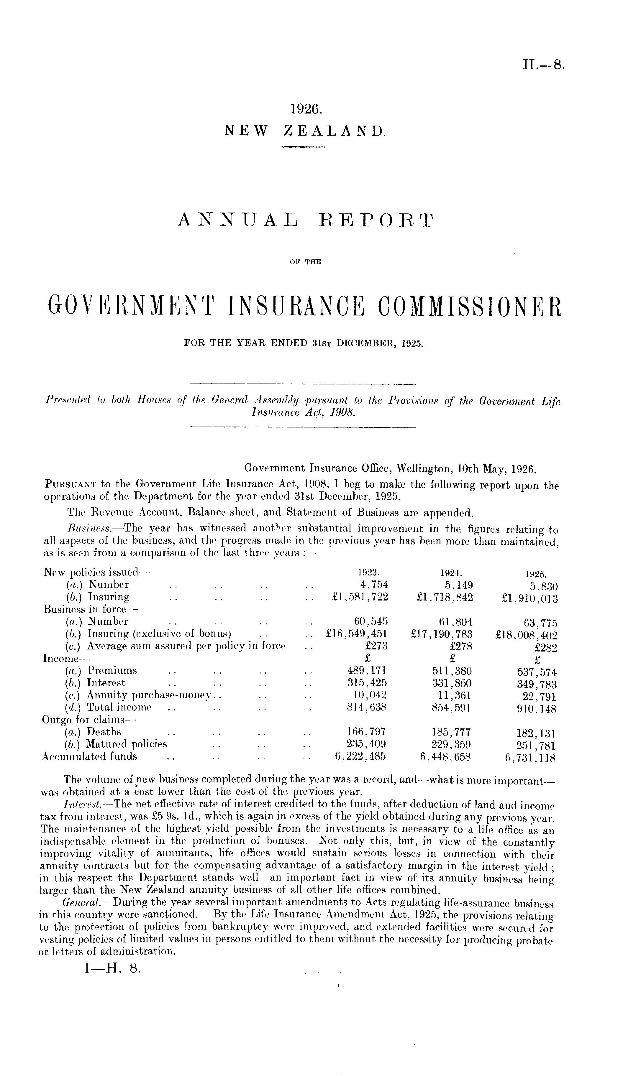 Government Insurance Office, Wellington, 10th May, 1926. Pursuant to the Government Life Insurance Act, 1908, I beg to make the following report upon the operations of the Department for the year ended 31st December, 1925. The Revenue Account, Balance-sheet, and Statement of Business are appended. Business. —The year has witnessed another substantial improvement in the. figures relating to all aspects of the business, and the progress made in the previous year has been more than maintained, as is seen from a comparison of the last three years : — New policies issued —- 1923. 1924. 1925. (a.) Number .. .. .. .. 4,754 5,149 5,830 (b.) Insuring .. .. .. .. £1,581,722 £1,718,842 Business in force — (a.) Number .. .. .. .. 60.545 61,804 63,775 (b.) Insuring (exclusive of bonus; .. .. £16,549,451 £17,190,783 £18,008,402 (c.) Average sum assured per policy in force . . £273 £278 £282 Income — £ £ £ (a.) Premiums .. .. .. .. 489,171 511,380 537,574 (&.) Interest .. .. .. .. 315,425 331,850 349'783 (c.) Annuity purchase-money.. .. 10,042 11,361 22,791 (d.) Total income .. .. .. .. 814,638 854,591 910,148 Outgo for claims — (a.) Deaths .. .. .. .. 166,797 185,777 182,131 (&.) Matured policies .. .. .. 235,409 229,359 251,781 Accumulated funds .. .. .. 6,222,485 6,448,658 6,731,118 The volume of new business completed during the year was a record, and—what is more important was obtained at a cost lower than the cost of the previous year. Interest. —The net effective rate of interest credited to the funds, after deduction of land and income tax from interest, was £5 9s. Id., which is again in excess of the yield obtained during any previous year. The maintenance of the highest yield possible from the investments is necessary to a life office as an indispensable element in the production of bonuses. Not only this, but, in view of the constantly improving vitality of annuitants, life offices would sustain serious losses in connection with their annuity contracts but for the compensating advantage of a satisfactory margin in the interest yield ; in this respect the Department stands well—an important fact in view of its annuity business being larger than the New Zealand annuity business of all other life offices combined. General.—During the year several important amendments to Acts regulating life-assurance business in this country were sanctioned. By the Life Insurance Amendment Act, 1925, the provisions relating to the protection of policies from bankruptcy were improved, and extended facilities were secured for vesting policies of limited values in persons entitled to them without the necessity for producing probate or letters of administration.