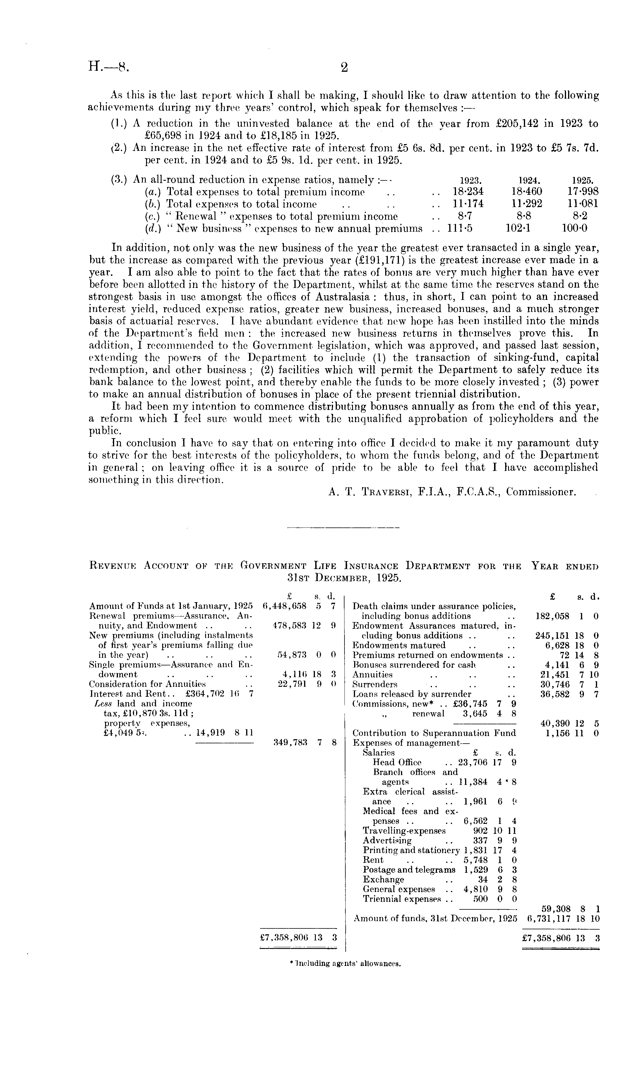 As this is the last report which I shall be making, I should like to draw attention to the following achievements during my three years' control, which speak for themselves : —• (1.) A reduction in the uninvested balance at the end of the year from £205,142 in 1923 to £65,698 in 1924 and to £18,185 in 1925. (2.) An increase in the net effective rate of interest from £5 6s. Bd. per cent, in 1923 to £5 7s. 7d. per cent, in 1924 and to £5 9s. Id. per cent, in 1925. (3.) An all-round reduction in expense ratios, namely : — 1923. 1924. 1925. (a.) Total expenses to total premium income .. . . 18-234 18-460 17-998 (b.) Total expenses to total income .. .. .. 11-174 11-292 11-081 (c.) " Renewal " expenses to total premium income . . 8-7 8-8 8-2 (d.) " New business " expenses to new annual premiums .. 111-5 102-1 100-0 In addition, not only was the new business of the year the greatest ever transacted in a single year, but the increase as compared with the previous year (£191,171) is the greatest increase ever made in a year. lam also able to point to the fact that the rates of bonus are very much higher than have ever before been allotted in the history of the Department, whilst at the same time the reserves stand on the strongest basis in use amongst the offices of Australasia : thus, in short, I can point to an increased interest yield, reduced expense ratios, greater new business, increased bonuses, and a much stronger basis of actuarial reserves. I have abundant evidence that new hope has been instilled into the minds of the Department's field men : the increased new business returns in themselves prove this. In addition, I recommended to the Government legislation, which was approved, and passed last session, extending the powers of the Department to include (1) the transaction of sinking-fund, capital redemption, and other business ; (2) facilities which will permit the Department to safely reduce its bank balance to the lowest point, and thereby enable the funds to be more closely invested ; (3) power to make an annual distribution of bonuses in place of the present triennial distribution. It bad been my intention to commence distributing bonuses annually as from the end of this year, a reform which I feel sure would meet with the unqualified approbation of policyholders and the public. In conclusion I have to say that on entering into office I decided to make it my paramount duty to strive for the best interests of the policyholders, to whom the funds belong, and of the Department in general; on leaving office it is a source of pride to be able to feel that I have accomplished something in this direction. A. T. Traversi, F.1.A., F.0.A.5., Commissioner.