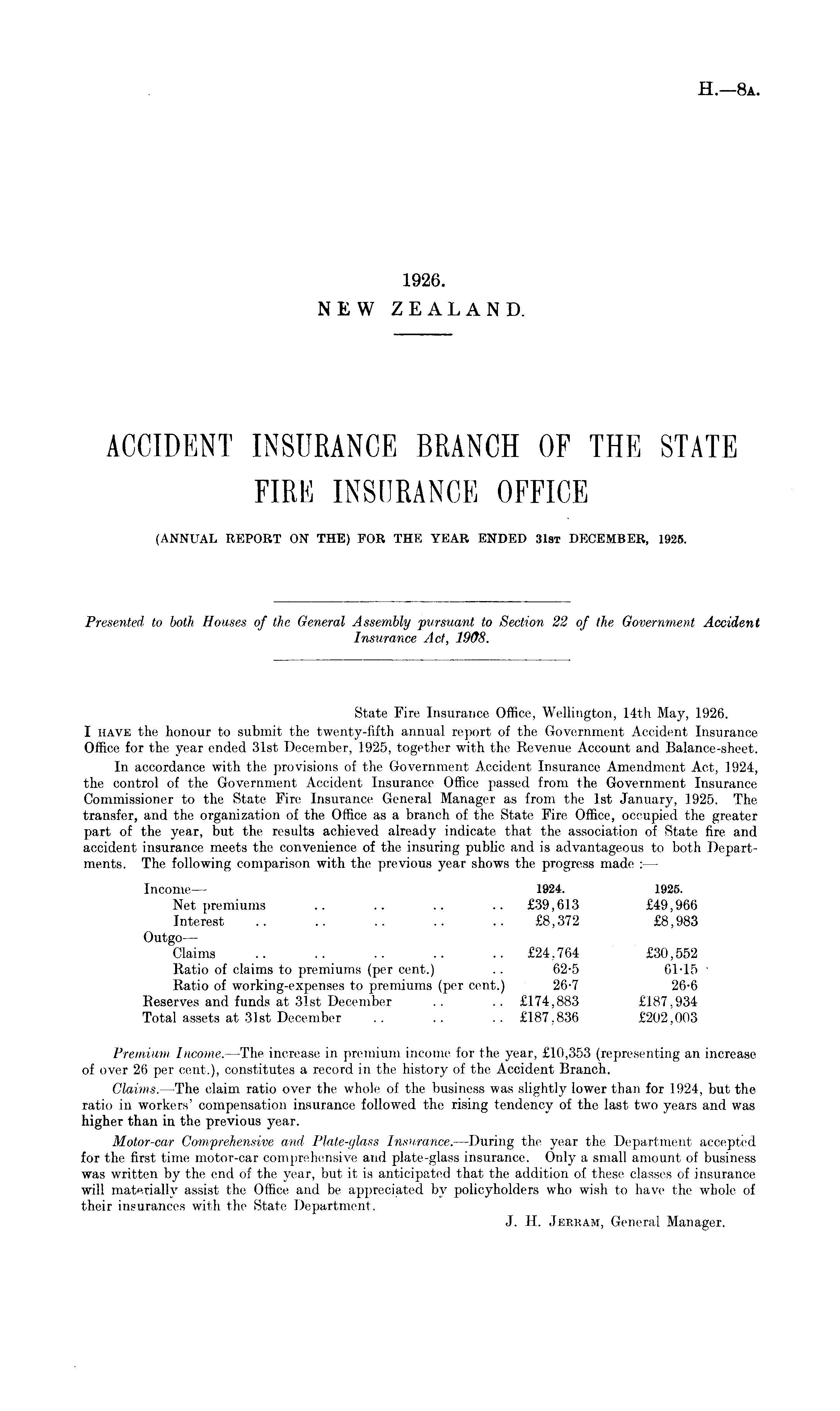 State Fire Insurance Office, Wellington, 14th May, 1926. I have the honour to submit the twenty-fifth annual report of the Government Accident Insurance Office for the year ended 31st December, 1925, together with the Revenue Account and Balance-sheet. In accordance with the provisions of the Government Accident Insurance Amendment Act, 1924, the control of the Government Accident Insurance Office passed from the Government Insurance Commissioner to the State Fire Insurance General Manager as from the Ist January, 1925. The transfer, and the organization of the Office as a branch of the State Fire Office, occupied the greater part of the year, but the results achieved already indicate that the association of State fire and accident insurance meets the convenience of the insuring public and is advantageous to both Departments. The following comparison with the previous year shows the progress made : — Income — 1924. 1925. Net premiums .. .. .. .. £39,613 £49,966 Interest .. .. .. .. .. £8,372 £8,983 Outgo — Claims .. .. .. .. .. £24,764 £30,552 Ratio of claims to premiums (per cent.) .. 62-5 61-15 ' Ratio of working-expenses to premiums (per cent.) 26-7 26-6 Reserves and funds at 31st December .. .. £174,883 £187,934 Total assets at 31st December . . . . . . £187,836 £202,003 Premium Income. —The increase in premium income for the year, £10,353 (representing an increase of over 26 per cent.), constitutes a record in the history of the Accident Branch. Claims. —The claim ratio over the whole of the business was slightly lower than for 1924, but the ratio in workers' compensation insurance followed the rising tendency of the last two years and was higher than in the previous year. Motor-car Comprehensive and Plate-glass Insurance. —During the year the Department accepted for the first time motor-car comprehensive and plate-glass insurance. Only a small amount of business was written by the end of the year, but it is anticipated that the addition of these classes of insurance will materially assist the Office and be appreciated by policyholders who wish to have the whole of their insurances with the State Department. J. H. Jerbam, General Manager.