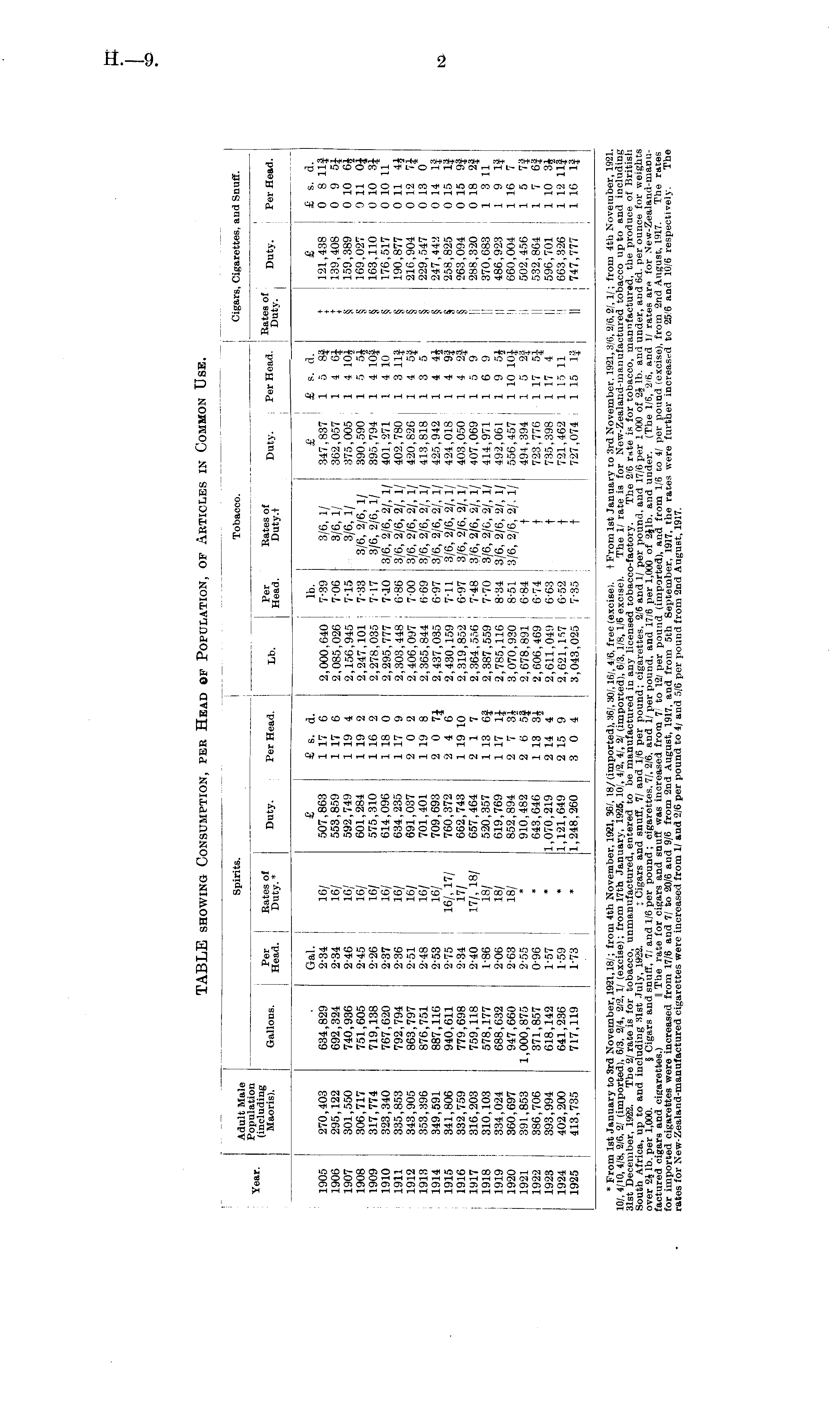 Adult Male Spirits. I Tobacco. [ Cigars, Cigarettes, and Snuff. Year. Population — j : — ; j ' Gallons. Duty."' Duty " Per Head. , Lb. He»d. E Duty.+ f Duty - Per Head. E Q® t s y ° f Duty. Per Head. Gal. £ £ s. d. lb. £ & s. d. £ £ s. d. 1905 270,403 634,829 2-34 16/ 507,863 1 17 6 2,000,640 7'39 3/6, 1/ 347,837 1 5 8f J 121,438 0 8 llf 1906 295,122 692,324 2'34 16/ 553,859 1 17 6 2,085,026 7'06 3/6,1/ 362,057 1 4 6} J 139,408 0 9 5J 1907 301,550 740,936 246 16/ 592,749 1 19 4 2,156,945 1 7*15 3/6,1/ 375,005 1 4 10} § 159,389 0 10 6§ 1908 306,717 751,605 2'45 16/ 601,284 1 19 2 2,247,101 7'33 3/6,2/6,1/ 390,590 1 5 5} § 169,027 | 0 11 Oj 1909 317,774 719,138 2-26 16/ 575,310 1 16 2 2,278,035 7'17 3/6, 2/6, 1/ 395,794 1 4 10§ § 163,110 ! 0 10 3£ ! 1910 323,340 767,620 237 16/ 614,096 1 18 0 2,295,777 7'10 3/6, 2/6, 2/, 1/ 401,271 1 4 10 § 176,517 I 0 10 11 ; 1911 335,853 792,794 2'36 16/ 634,235 1 17 9 2,303,448 6-86 3/6, 2/6, 2/, 1/ 402,780 1 3 llf § 190,877 0 11 4J ; 1912 343,905 863,797 2-51 16/ 691,037 2 0 2 2,406,097 7'00 3/6, 2/6, 2/, 1/ 420,826 1 4 5f § 216,904 0 12 7J 1913 353,396 876,751 2'48 16/ 701,401 1 19 8 2,365,844 6-69 3/6, 2/6, 2/, 1/ 413,818 1 3 5 § 229,547 0 13 0 1914 349,591 887,116 2'53 16/ 709,693 2 0 7J 2,437,035 6'97 3/6, 2/6, 2/, 1/ 425,942 1 4 4J § 247,442 0 14 If 1915 341,806 940,611 2-75 16/, 17/ 760,372 2 4 6 2,430,159 7'11 3/6, 2/6, 2/, 1/ 424,018 1 4 9| § 258,825 i 0 15 If 1916 332,759 779,698 2-34 17/ 662,743 1 19 10 2,319,852 6*97 3/6, 2/6, 2/, 1/ 403,050 1 4 2| § 263,094 I 0 15 9f | 1917 316,203 759,118 2-40 17/, 18/ 657,464 2 1 7 2,364,556 7'48 3/6, 2/6, 2/, 1/ 407,069 1 5 9 || 288,320 | 0 18 2f ; 1918 310,103 578,177 1-86 18/ 520,357 1 13 6f 2,387,559 7'70 I 3/6, 2/6, 2/, 1/ 414,971 1 6 9 || 370,683 1 3 11 1919 334,024 688,632 2-06 18/ 619,769 1 17 if 2,785,116 8'34 -3/6, 2/6, 2/, 1/ 492,061 1 9 5} || 486,923 1 9 If 1920 360,697 947,660 2-63 18/ 852,894 2 7 3J 3,070,930 8-51 3/6, 2/6, 2/, 1/ 556,457 1 10 loj || 660,004 1 16 7 1921 391,853 1,000,875 2-55 * 910,482 2 6 5| 2,678,891 6'84 I t 494,394 1 5 2f || 502,456 1 5 7| 1922 386,706 371,857 0-96 * 643,646 1 13 3J 2,606,469 6'74 I f 723,776 1 17 5J || 532,864 1 7 6| 1923 393,994 618,142 1-57 * 1,070,219 2 14 4 2,611,049 6'63 I t 735,398 1 17 4 || 596,701 1 10 3f 1924 402,200 641,236 1'59 * 1,121,649 2 15 9 2,621,157 6-52 j t 721,462 1 15 11 i| 663,326 1 12 llf i 1925 413,735 717,119 1-73 * 1,248,260 3 0 4 3,043,025 7'35 | t 727,074 1 15 If || 747,777 1 16 1} * From 1st January to 3rd November, 1921, 18/; from 4th November, 1921, 36/, 18/(imported), 36/, 30/, 16/, 4/6, free (excise). + From 1st January to 3rd November, 1921, 3/6, 2/6, 2/, 1/; from 4th November, 1921, 10/, 4/10, 4/8, 2/6, 2/ (imported), 6/3, 2/4, 2/2, 1/ (excise); from 17th January, 1925, 10/, 4/2, 4/, 2/ (imported), 6/3, 1/8, 1/6 excise). The 1/ rate is for New-Zealand-manufactured tobacco up to and including 31st December, 1922. The 2/rate is for tobacco, unmanufactured, entered to be manufactured in any licensed tobacco-factory. The 2/6 rate is for tobacco, manufactured, the produce of British South Africa, up to and including 31st July, 1922. j Cigars and snuff, 7/ and 1/6 per pound; cigarettes. 2/6 and 1/ per pound, and 17/6 per 1 000 of 2£ lb. and under, and 6d. per ounce for weights over 2£ lb. per 1,000. § Cigars and snuff, 7/ and 1/6 per pound ; cigarettes, 7/, 2/6, and 1/ per pound, and 17/6 per 1,000 of 2$lb. and under. (The 1/6, 2/6, and 1/ rates ar« for New-Zealand-manu-factured cigars and cigarettes.) II The rate for cigars and snuff was increased from 7 to 12/ per pound (imported), and from 1/6 to 4/ per pound (excise), from 2nd August, 1917. The rates for imported cigarettes were increased from 17/6 and 7/ to 20/6 and 9/6 from 2nd August, 1917, and from 5th September, 1917, the rates were further increased to 25/6 and 10/6 respectively. The rates for New-Zealand-manufactured cigarettes were increased from 1/ and 2/6 per pound to 4/ and 5/6 per pound from 2nd August, 1917.