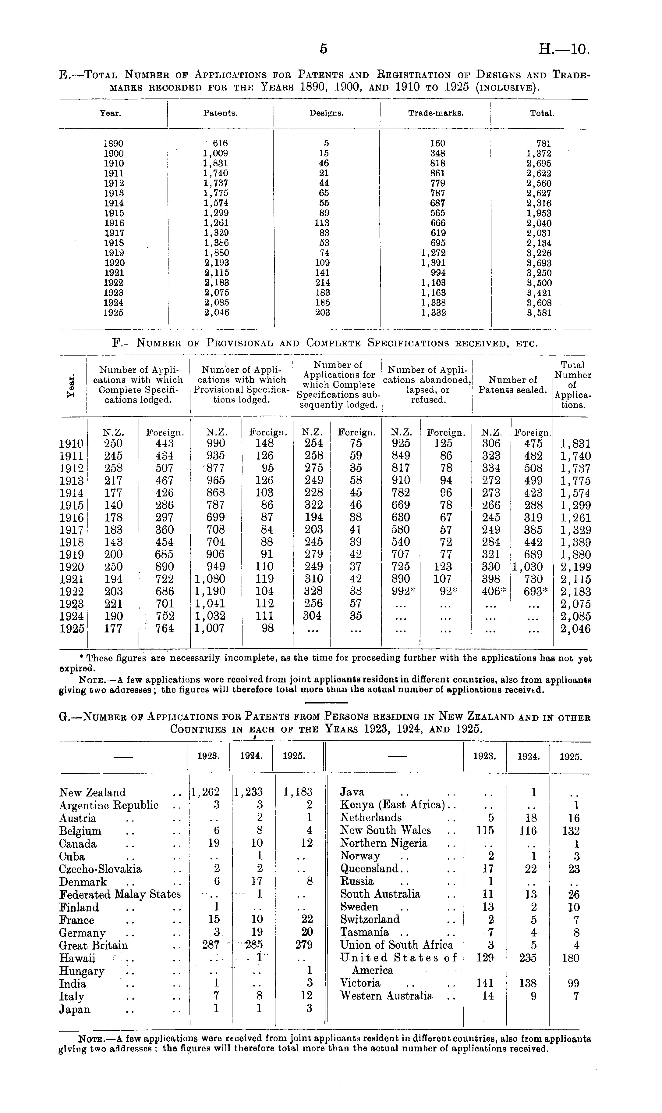 E.—Total Number of Applications for Patents and Registration of Designs and Trademarks recorded for the Years 1890, 1900, and 1910 to 1925 (inclusive).
