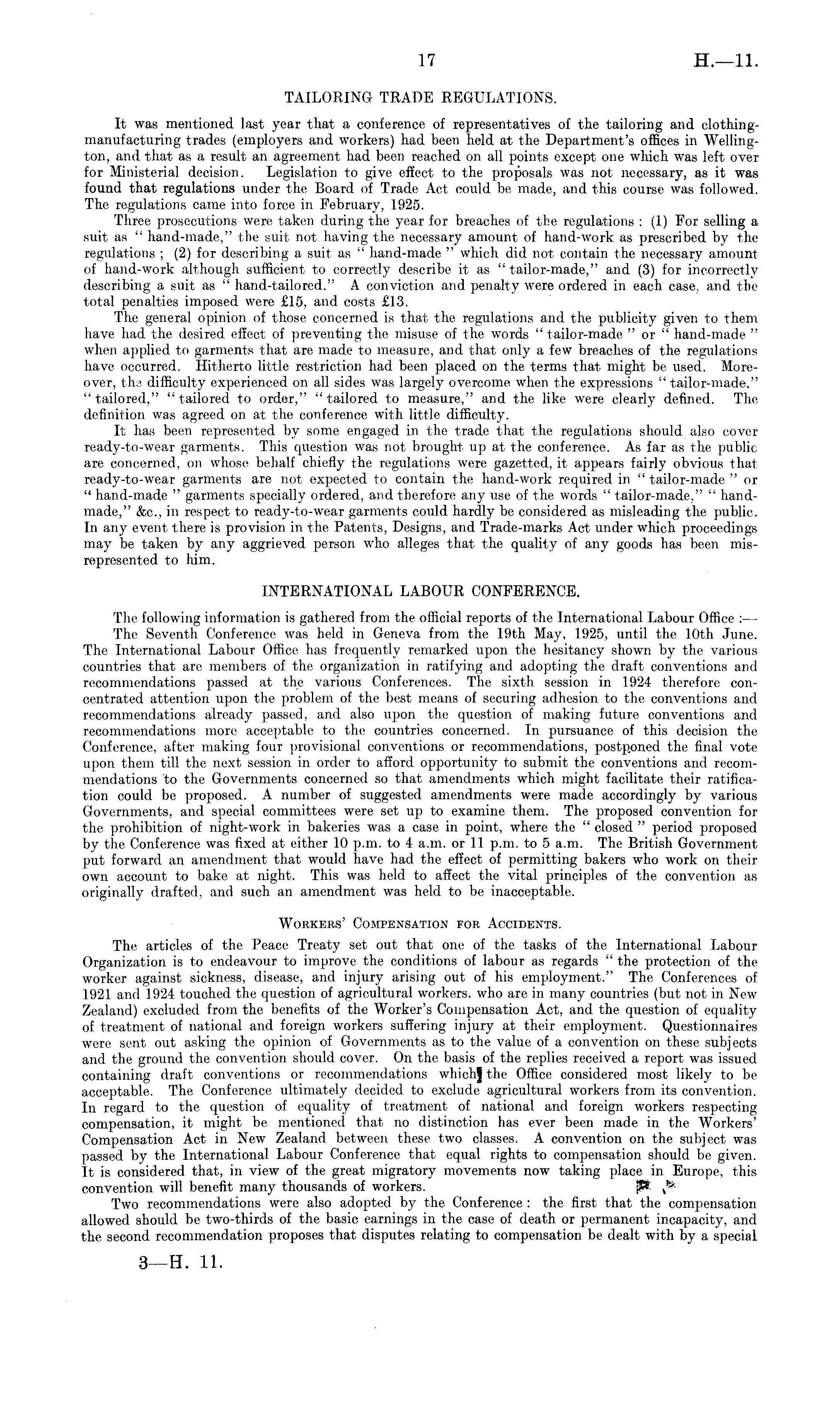 TAILORING TRADE REGULATIONS. It was mentioned last year that a conference of representatives of the tailoring and clothingmanufacturing trades (employers and workers) had been held at the Department's offices in Wellington, and that as a result an agreement had been reached on all points except one which was left over for Ministerial decision. Legislation to give effect to the proposals was not necessary, as it was found that regulations under the Board of Trade Act could be made, and this course was followed. The regulations came into force in February, 1925. Three prosecutions were taken during the year for breaches of the regulations : (1) For selling a suit as " hand-made," the suit not having the necessary amount of hand-work as prescribed by the regulations ; (2) for describing a suit as " hand-made " which did not contain the necessary amount of hand-work although sufficient to correctly describe it as " tailor-made," and (3) for incorrectly describing a suit as " hand-tailored." A conviction and penalty were ordered in each case, and the total penalties imposed were £15, and costs £13. The general opinion of those concerned is that the regulations and the publicity given to them have had the desired effect of preventing the misuse of the words " tailor-made " or " hand-made " when applied to garments that are made to measure, and that only a few breaches of the regulations have occurred. Hitherto little restriction had been placed on the terms that might be used. Moreover, ths difficulty experienced on all sides was largely overcome when the expressions " tailor-made," "tailored," "tailored to order," "tailored to measure," and the like were clearly defined. The definition was agreed on at the conference with little difficulty. It has been represented by some engaged in the trade that the regulations should also cover ready-to-wear garments. This question was not brought up at the conference. As far as the public are concerned, on whose behalf chiefly the regulations were gazetted, it appears fairly obvious that ready-to-wear garments are not expected to contain the hand-work required in " tailor-made " or " hand-made " garments specially ordered, and therefore any use of the words " tailor-made," " handmade," &c., in respect to ready-to-wear garments could hardly be considered as misleading the public. In any event there is provision in the Patents, Designs, and Trade-marks Act under which proceedings may be taken by any aggrieved person who alleges that the qualify of any goods has been misrepresented to him. INTERNATIONAL LABOUR CONFERENCE. The following information is gathered from the official reports of the International Labour Office :• — The Seventh Conference was held in Geneva from the 19th May, 1925, until the 10th June. The International Labour Office has frequently remarked upon the hesitancy shown by the various countries that are members of the organization in ratifying and adopting the draft conventions and recommendations passed at the various Conferences. The sixth session in 1924 therefore concentrated attention upon the problem of the best means of securing adhesion to the conventions and recommendations already passed, and also upon the question of making future conventions and recommendations more acceptable to the countries concerned. In pursuance of this decision the Conference, after making four provisional conventions or recommendations, postponed the final vote upon them till the next session in order to afford opportunity to submit the conventions and recommendations to the Governments concerned so that amendments which might facilitate their ratification could be proposed. A number of suggested amendments were made accordingly by various Governments, and special committees were set up to examine them. The proposed convention for the prohibition of night-work in bakeries was a case in point, where the " closed " period proposed by the Conference was fixed at either 10 p.m. to 4 a.m. or 11 p.m. to 5 a.m. The British Government put forward an amendment that would have had the effect of permitting bakers who work on their own account to bake at night. This was held to affect the vital principles of the convention as originally drafted, and such an amendment was held to be inacceptable. Workers' Compensation for Accidents. The articles of the Peace Treaty set out that one of the tasks of the International Labour Organization is to endeavour to improve the conditions of labour as regards " the protection of the worker against sickness, disease, and injury arising out of his employment." The Conferences of 1921 and 1924 touched the question of agricultural workers, who are in many countries (but not in New Zealand) excluded from the benefits of the Worker's Compensation Act, and the question of equality of treatment of national and foreign workers suffering injury at their employment. Questionnaires were sent out asking the opinion of Governments as to the value of a convention on these subjects and the ground the convention should cover. On the basis of the replies received a report was issued containing draft conventions or recommendations which| the Office considered most likely to be acceptable. The Conference ultimately decided to exclude agricultural workers from its convention. In regard to the question of equality of treatment of national and foreign workers respecting compensation, it might be mentioned that no distinction has ever been made in the Workers' Compensation Act in New Zealand between these two classes. A convention on the subject was passed by the International Labour Conference that equal rights to compensation should be given. It is considered that, in view of the great migratory movements now taking place in Europe, this convention will benefit many thousands of workers. jS* Two recommendations were also adopted by the Conference : the first that the compensation allowed should be two-thirds of the basic earnings in the case of