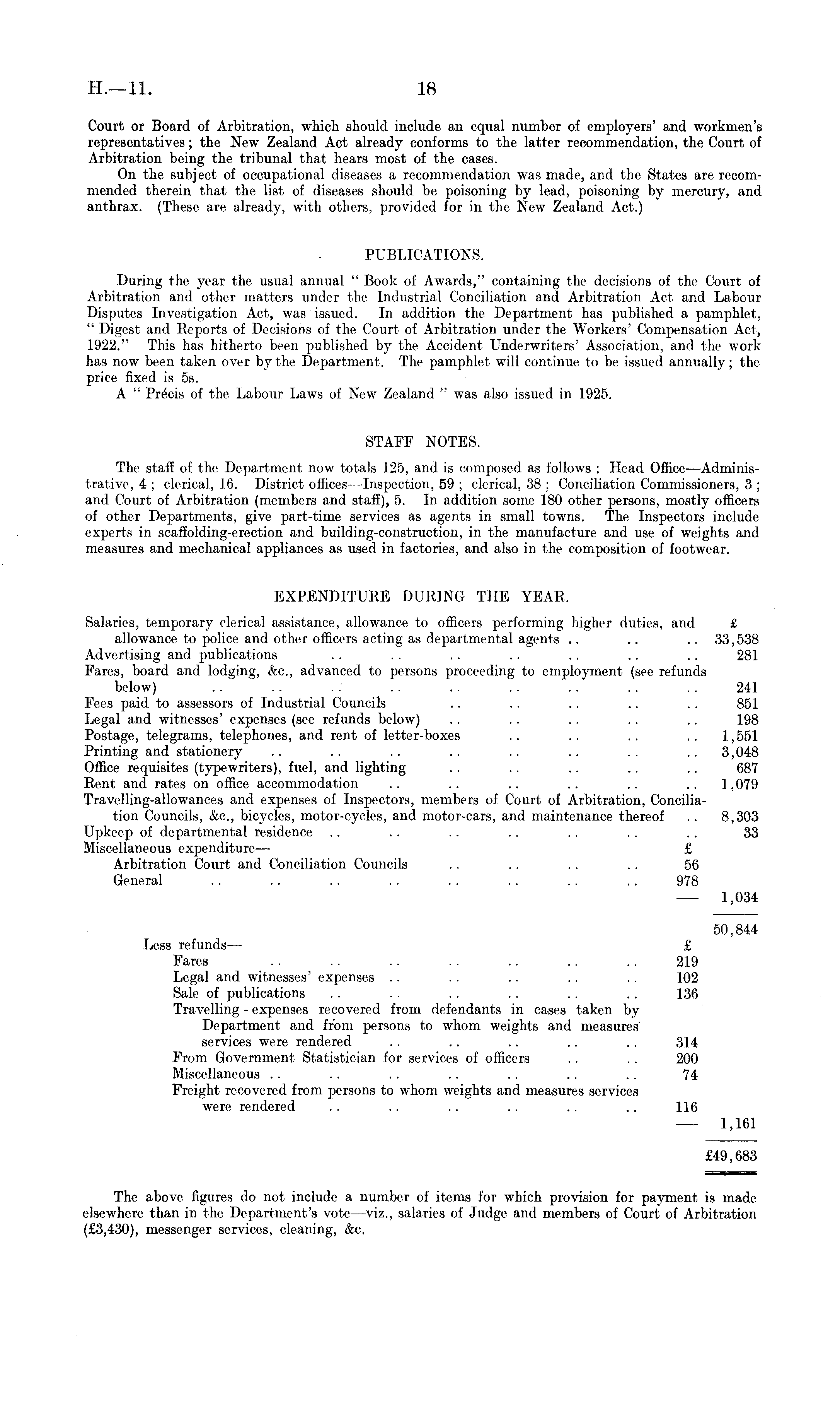 Court or Board of Arbitration, which should include an equal number of employers' and workmen's representatives; the New Zealand Act already conforms to the latter recommendation, the Court of Arbitration being the tribunal that hears most of the cases. On the subject of occupational diseases a recommendation was made, and the States are recommended therein that the list of diseases should be poisoning by lead, poisoning by mercury, and anthrax. (These are already, with others, provided for in the New Zealand Act.) PUBLICATIONS. During the year the usual annual " Book of Awards," containing the decisions of the Court of Arbitration and other matters under the Industrial Conciliation and Arbitration Act and Labour Disputes Investigation Act, was issued. In addition the Department has published a pamphlet, " Digest and Reports of Decisions of the Court of Arbitration under the Workers' Compensation Act, 1922." This has hitherto been published by the Accident Underwriters' Association, and the work has now been taken over by the Department. The pamphlet will continue to be issued annually; the price fixed is ss. A " Precis of the Labour Laws of New Zealand " was also issued in 1925. STAFF NOTES. The staff of the Department now totals 125, and is composed as follows : Head Office—Administrative, 4 ; clerical, 16. District offices —Inspection, 59 ; clerical, 38 ; Conciliation Commissioners, 3 ; and Court of Arbitration (members and staff), 5. In addition some 180 other persons, mostly officers of other Departments, give part-time services as agents in small towns. The Inspectors include experts in scaffolding-erection and building-construction, in the manufacture and use of weights and measures and mechanical appliances as used in factories, and also in the composition of footwear. EXPENDITURE DURING THE YEAR. Salaries, temporary clerical assistance, allowance to officers performing higher duties, and £ allowance to police and other officers acting as departmental agents .. .. .. 33,538 Advertising and publications .. .. .. .. .. .. .. 281 Fares, board and lodging, &c., advanced to persons proceeding to employment (see refunds below) .. .. .. . . .. . . .. . . .. 241 Fees paid to assessors of Industrial Councils .. . . .. .. . . 851 Legal and witnesses' expenses (see refunds below) .. . . .. . . .. 198 Postage, telegrams, telephones, and rent of letter-boxes .. .. .. .. 1,551 Printing and stationery . . . . .. . . . . . . . . . . 3,048 Office requisites (typewriters), fuel, and lighting . . . . . . .. .. 687 Rent and rates on office accommodation . . .. .. .. .. 1,079 Travelling-allowances and expenses of Inspectors, members of Court of Arbitration, Conciliation Councils, &c., bicycles, motor-cycles, and motor-cars, and maintenance thereof .. 8,303 Upkeep of departmental residence .. .. .. .. .. .. .. 33 Miscellaneous expenditure— £ Arbitration Court and Conciliation Councils .. .. .. .. 56 General .. .. .. .. .. .. .. .. 978 1,034 50,844 Less refunds— £ Fares .. .. .. .. .. .. .. 219 Legal and witnesses' expenses .. .. .. .. .. 102 Sale of publications . . .. . . .. . . .. 136 Travelling - expenses recovered from defendants in cases taken by Department and from persons to whom weights and measures' services were rendered . . .. .. .. . . 314 From Government Statistician for services of officers .. .. 200 Miscellaneous .. . . . . . . . . .. .. 74 Freight recovered from persons to whom weights and measures services were rendered .. .. .. .. .. .. 116 1,161 £49,683 The above figures do not include a number of items for which provision for payment is made elsewhere than in the Department's vote —viz., salaries of Judge and members of Court of Arbitration (£3,430), messenger services, cleaning, &c.