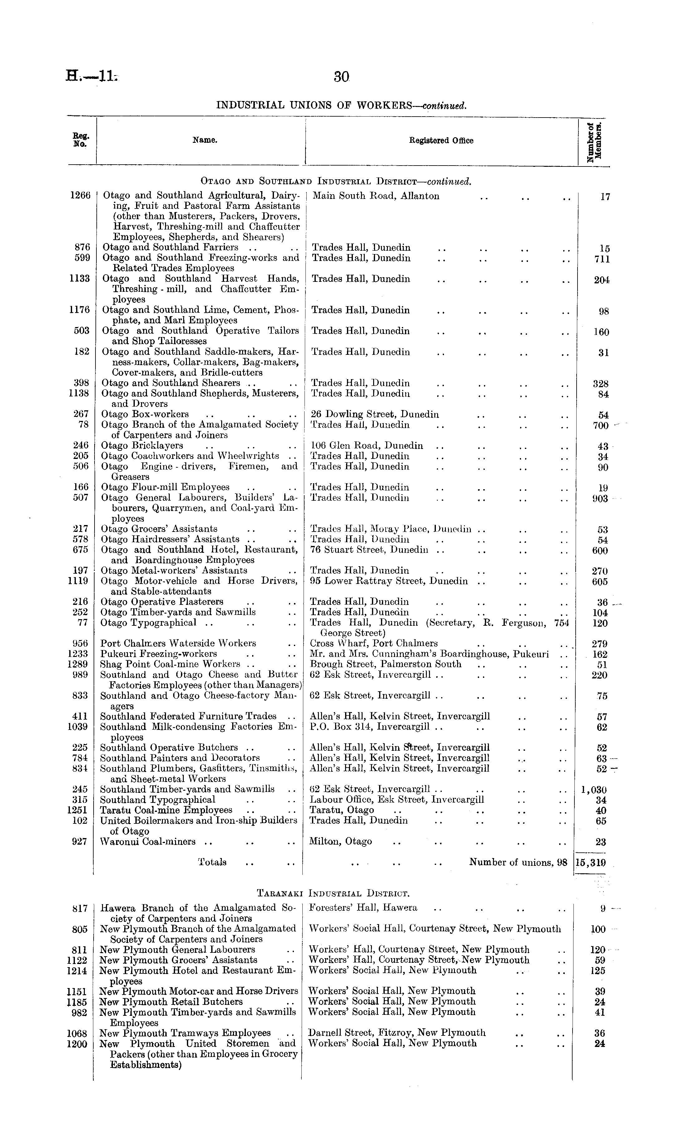o £ Name. Registered Office -Kg s © _ r.~Otago and Southland Industrial DisTRicT-^ccm(i»!te<?. 1266 Otago and Southland Agricultural, Dairy- ] Main South Road, Allanton .. .. .. 17 ing, Fruit and Pastoral Farm Assistants [ (other than Musterers, Packers, Drovers, Harvest, Threshing-mill and Chaflcutter | Employees, Shepherds, and Shearers) 876 Otago and Southland Farriers .. .. Trades Hall, Dunedin .. .. .. .. 15 599 Otago and Southland Freezing-works and J Trades Hall, Dunedin .. ,. .. .. 711 Related Trades Employees 1133 Otago and Southland Harvest Hands, Trades Hall, Dunedin .. .. .. .. 204 Threshing - mil], and Chaffcutter Employees 1176 Otago and Southland Lime, Cement, Phos- Trades Hall, Dunedin .. .. .. .. 98 phate, and Marl Employees 503 Otago and Southland Operative Tailors ! Trades Hall, Dunedin .. .. .. .. 160 and Shop Tailoresses 182 Otago and Southland Saddle-makers, Har- Trades Hall, Dunedin .. .. .. .. 31 ness-makers, Collar-makers, Bag-makers, Cover-makers, and Bridle-cutters 398 Otago and Southland Shearers .. .. I Trades Hall, Dunedin .. .. .. .. 328 1138 Otago and Southland Shepherds, Musterers, j Trades Hall, Dunedin .. .. .. .. 84 and Drovers 267 Otago Box-workers .. .. .. . 26 Dowling Street, Dunedin .. .. .. 54 78 Otago Branch of the Amalgamated Society j Trades Hail, Dunedin .. .. .. .. 700 of Carpenters and Joiners 246 Otago Bricklayers .. .. .. | 106 Glen Road, Dunedin .. .. .. .. 43 205 Otago Coachworkers and Wheelwrights .. I Trades Hall, Dunedin .. . . . . .. 34 506 Otago Engine - drivers, Firemen, and J Trades Hall, Dunedin .. .. .. .. 90 Greasers 166 Otago Flour-mill Employees .. . . Trades Hall, Dunedin .. .. .. .. 19 507 Otago General Labourers, Builders' La- Trades Hall, Dunedin .. .. .. .. 903 bourers, Quarrymen, and Coal-yard Employees 217 Otago Grocers'Assistants .. .. Trades Hall, Moray Place, Dunedin .. .. ,. 53 578 Otago Hairdressers' Assistants . . .. Trades Hall, Dunedin .. .. .. .. 54 675 Otago and Southland Hotel, Restaurant, 76 Stuart Street, Dunedin .. .. .. . . 600 and Boardinghouse Employees 197 Otago Metal-workers' Assistants .. Trades Hall, Dunedin .. .. .. . . 270 1119 Otago Motor-vehicle and Horse Drivers, 95 Lower Rattray Street, Dunedin .. .. .. 605 and Stable-attendants 216 Otago Operative Plasterers .. .. Trades Hall, Dunedin .. .. .. ,. 36 252 Otago Timber-yards and Sawmills .. Trades Hall, Dunedin .. . . .. .. 104 77 Otago Typographical .. .. .. Trades Hall, Dunedin (Secretary, R. Ferguson, 754 120 George Street) 956 Port Chalmers Waterside Workers .. Cross Wharf, Port Chalmers .. .. .. , 279 1233 Pukeuri Freezing-workers .. .. Mr. and Mrs. Cunningham's Boardinghouse, Pukeuri .. . 162 1289 Shag Point Coal-mine Workers .. .. Brough Street, Palmerston South .. .. .. 51 989 Southland and Otago Cheese and Butter 62 Esk Street, Invercargill .. .. .. .. 220 Factories Employees (other than Managers) 833 Southland and Otago Cheese-factory Man- 62 Esk Street, Invercargill .. .. .. .. 75 agers 411 Southland Federated Furniture Trades .. Allen's Hall, Kelvin Street, Invercargill .. .. 57 1039 Southland Milk-condensing Factories Em- P.O. Box 314, Invercargill .. .. .. .. 62 ployees 225 Southland Operative Butchers .. .. Allen's Hall, Kelvin Street, Invercargill .. .. 52 784 Southland Painters and Decorators .. Allen's Hall, Kelvin Street, Invercargill ... .. 63 834 Southland Plumbers, Gasfitters, Tinsmiths, Allen's Hall, Kelvin Street, Invercargill .. .. 52 - and Sheet-metal Workers 245 Southland Timber-yards and Sawmills .. 62 Esk Street, Invercargill . . .. .. .. 1,030 315 Southland Typographical .. .. Labour Office, Esk Street, Invercargill .. .. 34 1251 Taratu Coal-mine Employees .. .. Taratu, Otago .. .. .. .. .. 40 102 United Boilermakers and Iron-ship Builders Trades Hall, Dunedin .. .. .. .. 65 of Otago 927 Waronui Coal-miners .. .. .. Milton, Otago .. .. .. .. . . 23 Totals .. .. .. .. .. Number of unions, 98 15,310 Taranaki Industrial District. 817 Hawera Branch of the Amalgamated So- Foresters' Hall, Hawera .. .. .. .. 9 • ciety of Carpenters and Joiners 805 New Plymouth Branch of the Amalgamated Workers' Social Hall, Courtenay Street, New Plymouth 100 Society of Carpenters and Joiners 811 New Plymouth General Labourers .. Workers' Hail, Courtenay Street, New Plymouth .. 120 1122 New Plymouth Grocers'Assistants .. Workers'Hall, Courtenay Street, New Plymouth .. 59 1214 New Plymouth Hotel and Restaurant Em- Workers' Social Hall, New Plymouth .. .. 125 ployees 1151 New Plymouth Motor-car and Horse Drivers Workers'Social Hall, New Plymouth .. .. 39 1185 New Plymouth Retail Butchers .. Workers' Social Hall, New Plymouth .. . . 24 982 New Plymouth Timber-yards and Sawmills Workers' Social Hall, New Plymouth .. .. 41 Employees 1068 New Plymouth Tramways Employees .. Darnell Street, Fitzroy, New Plymouth .. .. 36 1200 New Plymouth United Storemen and Workers' Social Hall, New Plymouth .. .. 24 Packers (other than Employees in Grocery Establishments)