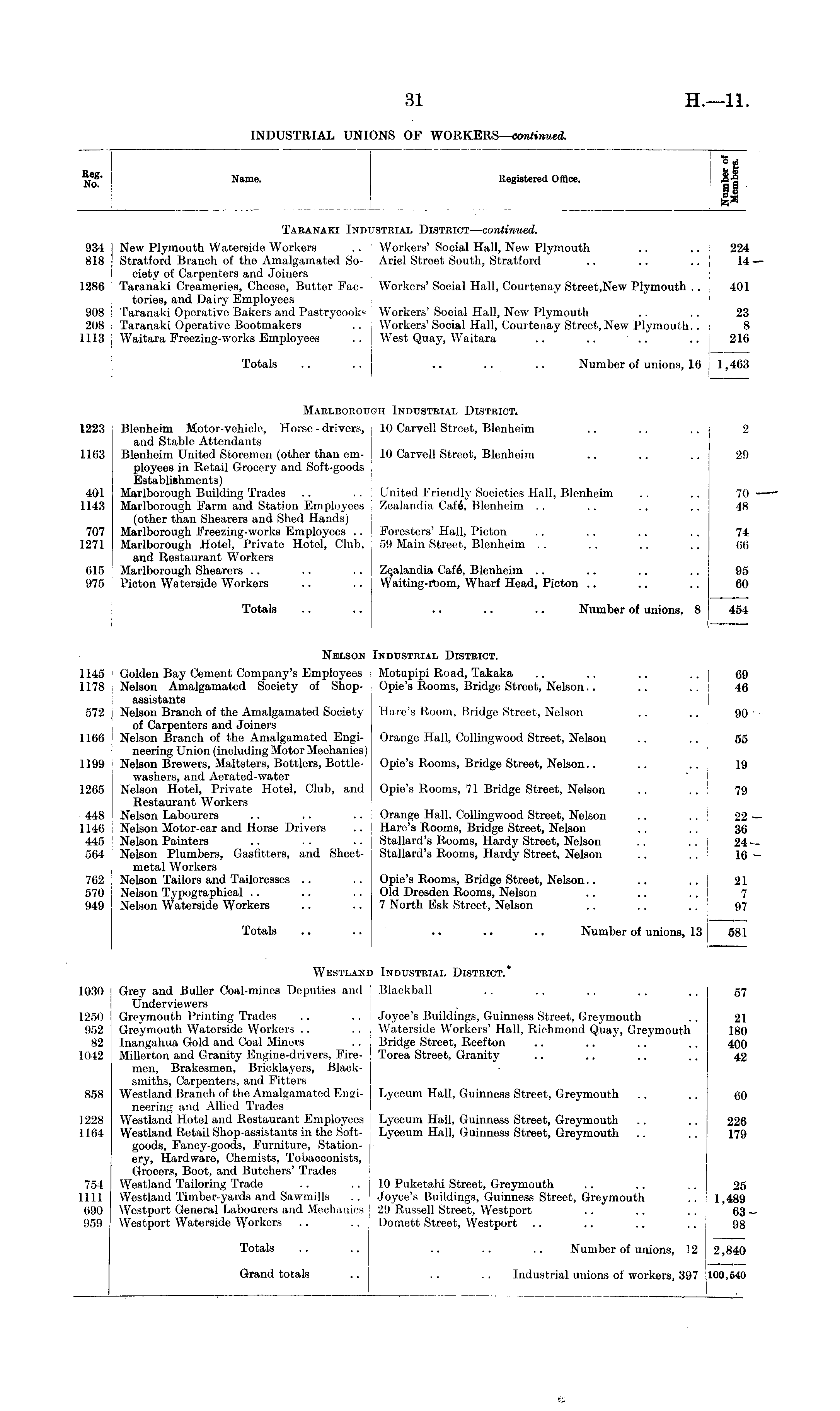I I "S » 2 2 Name, Registered Office. j£|j |a Taranaki Industrial Distbiot—continued. 934 New Plymouth Waterside Workers .. [ Workers' Social Hall, New Plymouth .. .. I 224 818 Stratford Branch of the Amalgamated So- j Ariel Street South, Stratford .. .. ,. j 14 — ciety of Carpenters and Joiners | [ 1286 Taranaki Creameries, Cheese, Butter Fac- : Workers' Social Hall, Courtenay Street,New Plymouth .. 401 tories, and Dairy Employees 908 Taranaki Operative Bakers and Pastrycook? i Workers' Social Hall, New Plymouth .. .. 23 208 Taranaki Operative Bootmakers .. Workers'Social Hall, Courtenay Street,New Plymouth.. 8 1113 Waitara Freezing-works Employees .. West Quay, Waitara .. .. .. .. 216 Totals .. .. .. .. .. Number of unions, 16 1,463 Maklbokouqh Industrial Distbiot. 1223 Blenheim Motor-vehicle, Horse - drivers, 10 Carvell Street, Blenheim .. .. .. 2 and Stable Attendants 1163 Blenheim United Storemen (other than em- 10 Carvell Street, Blenheim .. .. .. 29 ployees in Retail Grocery and Soft-goods Establishments) 401 Marlborough Building Trades .. .. United Friendly Societies Hall, Blenheim .. .. 70 —- 1143 Marlborough Farm and Station Employees Zealandia Caf6, Blenheim .. .. .. .. 48 (other than Shearers and Shed Hands) 707 Marlborough Freezing-works Employees .. Foresters' Hall, Picton .. .. .. .. 74 1271 Marlborough Hotel, Private Hotel, Club, 59 Main Street, Blenheim .. .. .. .. 66 and Restaurant Workers 615 Marlborough Shearers .. .. .. Zgalandia Caf6, Blenheim .. .. .. .. 95 975 Picton Waterside Workers .. .. Waiting-rbom, Wharf Head, Picton .. .. .. 60 Totals .. .. .. .. .. Number of unions, 8 454 ——— Nelson Industrial Distbiot. 1145 Golden Bay Cement Company's Employees Motupipi Road, Takaka .. .. .. .. 69 1178 Nelson Amalgamated Society of Shop- Opie's Rooms, Bridge Street, Nelson.. .. .. 46 assistants 572 Nelson Branch of the Amalgamated Society Hare's Room, Bridge Street, Nelson .. .. 90 — of Carpenters and Joiners 1166 Nelson Branch of the Amalgamated Engi- Orange Hall, Collingwood Street, Nelson .. .. 55 neering Union (including Motor Mechanics) 1199 Nelson Brewers, Maltsters, Bottlers, Bottle- Opie's Rooms, Bridge Street, Nelson.. .. .. 19 washers, and Aerated-water 1265 Nelson Hotel, Private Hotel, Club, and Opie's Rooms, 71 Bridge Street, Nelson .. .. 79 Restaurant Workers 448 Nelson Labourers .. .. .. Orange Hall, Collingwood Street, Nelson .. .. 22 — 1146 Nelson Motor-car and Horse Drivers .. Hare's Rooms, Bridge Street, Nelson .. .. 36 445 Nelson Painters .. .. .. Stallard's Rooms, Hardy Street, Nelson .. . . j 24 — 564 Nelson Plumbers, Gasfitters, and Sheet- Stallard's Rooms, Hardy Street, Nelson .. .. 16 — metal Workers 762 Nelson Tailors and Tailoresses .. .. Opie's Rooms, Bridge Street, Nelson.. .. .. 21 570 Nelson Typographical .. .. .. Old Dresden Rooms, Nelson .. .. .. 7 949 Nelson Waterside Workers .. 7 North Esk Street, Nelson .. .. .. 97 Totals .. .. .. .. .. Number of unions, 13 581 Westland Industeial District.* 1030 | Grey and Buller Coal-mines Deputies and [ Blackball .. .. .. .. ., 57 Underviewers 1250 Greymouth Printing Trades .. .. | Joyce's Buildings, Guinness Street, Greymouth .. 21 952 Greymouth Waterside Workers .. .. j Waterside Workers' Hall, Richmond Quay, Greymouth 180 82 Inangahua Gold and Coal Miners .. Bridge Street, Reefton .. .. .. .. 400 1042 | Millerton and Granity Engine-drivers, Fire- Torea Street, Granity .. .. .. .. 42 men, Brakesmen, Bricklayers, Blacksmiths, Carpenters, and Fitters 858 Westland Branch of the Amalgamated Engi- Lyceum Hall, Guinness Street, Greymouth .. .. 60 neering and Allied Trades 1228 Westland Hotel and Restaurant Employees Lyceum Hall, Guinness Street, Greymouth .. .. 226 1164 Westland Retail Shop-assistants in the Soft- j Lyceum Hall, Guinness Street, Greymouth .. .. 179 goods, Fancy-goods, Furniture, Station- ■ ery, Hardware, Chemists, Tobacconists, Grocers, Boot, a,nd Butchers' Trades 754 Westland Tailoring Trade .. .. ) 10 Puketahi Street, Greymouth .. .. .. 25 1111 Westland Timber-yards and Sawmills .. j Joyce's Buildings, Guinness Street, Greymouth .. 1,489 690 Westport General Labourers and Mechanics 29 Russell Street, Westport .. .. . . 63 — 959 Westport Waterside Workers .. .. Domett Street, Westport .. .. .. .. 98 Totals .. .. .. .. .. Number of unions, 12 2,840 Grand totals .. .. .. Industrial unions of workers, 397 100,540