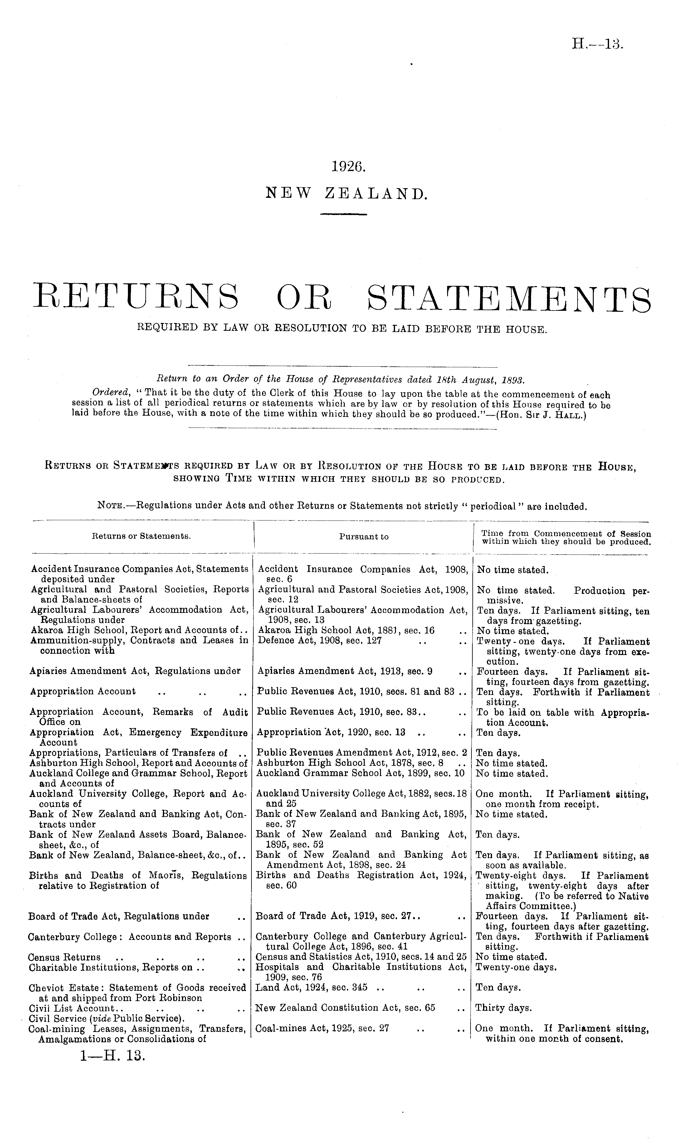 Note.—Regulations under Acts and other Returns or Statements not strictly " periodioal " are included. Returns or Statements. Pursuant to from Commencement of Session J within winch they should be produced. I Accident Insurance Companies Act, Statements Accident Insurance Companies Act, 1908, No time stated. deposited under see. 6 Agricultural and Pastoral Societies, Reports Agricultural and Pastoral Societies Act, 1908, No time stated. Production perand Balance-sheets of sec. 12 missive. Agricultural Labourers' Accommodation Act, Agricultural Labourers' Accommodation Aot, Ten days. If Parliament sitting, ten Regulations under 1908, sec. 13 days from'gazetting. Akaroa High School, Report and Accounts of.. Akaroa High School Act, 1881, sec. 16 .. No time stated. Ammunition-supply, Contracts and Leases in Defence Aot, 1908, sec. 127 .. .. Twenty-one days. If Parliament connection with sitting, twenty-one days from execution. Apiaries Amendment Act, Regulations under Apiaries Amendment Act, 1913, sec. 9 .. Fourteen days. If Parliament sitting, fourteen days from gazetting. Appropriation Account .. .. .. Public Revenues Act, 1910, sees. 81 and 83 .. Ten days. Forthwith if Parliament sitting. Appropriation Acoount, Remarks of Audit Public Revenues Act, 1910, sec. 83.. .. To be laid on table with AppropriaOffice on tion Account. Appropriation Act, Emergency Expenditure Appropriation Aot, 1920, seo. 13 .. .. Ten days. Account Appropriations, Particulars of Transfers of .. Public Revenues Amendment Act, 1912, sec. 2 Ten days. Ashburton High School, Report and Accounts of Ashburton High School Act, 1878, sec. 8 .. No time stated. Auckland College and Grammar School, Report Auokland Grammar School Aot, 1899, sec. 10 No time stated. and Accounts of Auokland University College, Report and Ac- Auokland University College Act, 1882, sees. 18 One month. If Parliament sitting, counts of and 25 one month from receipt. Bank of New Zealand and Banking Aot, Con- Bank of New Zealand and Banking Act, 1895, No time stated. tracts under seo. 37 Bank of New Zealand Assets Board, Balance- Bank of New Zealand and Banking Aot, Ten days. sheet, &o., of 1895, sec. 52 Bank of New Zealand, Balance-sheet, &c., of.. Bank of New Zealand and Banking Act Ten days. If Parliament sitting, as Amendment Act, 1898, sec. 24 soon as available. Births and Deaths of Maoris, Regulations Births and Deaths Registration Act, 1924, Twenty-eight days. If Parliament relative to Registration of seo. 60 sitting, twenty-eight days after making. (To be referred to Native Affairs Committee.) Board of Trade Act, Regulations under .. Board of Trade Aot, 1919, sec. 27.. .. Fourteen days. If Parliament sitting, fourteen days after gazetting. Canterbury College : Accounts and Reports .. Canterbury College and Canterbury Agricul- Ten days. Forthwith if Parliament tural College Aot, 1896, sec. 41 sitting. Census Returns .. .. .. .. Census and Statistics Act, 1910, sees. 14 and 25 No time stated. Charitable Institutions, Reports on .. Hospitals and Charitable Institutions Act, Twenty-one days. 1909, seo. 76 Cheviot Estate : Statement of Goods received Land Act, 1924, sec. 345 .. .. .. Ten days. at and shipped from Port Robinson Civil List Account.. .. .. .. New Zealand Constitution Aot, sec. 65 .. Thirty days. Civil Service (vide Public Service). Coal-mining Leases, Assignments, Transfers, Coal-mines Aot, 1925, sec. 27 .. .. One month. If Parliament sitting, Amalgamations or Consolidations of within one month of consent.