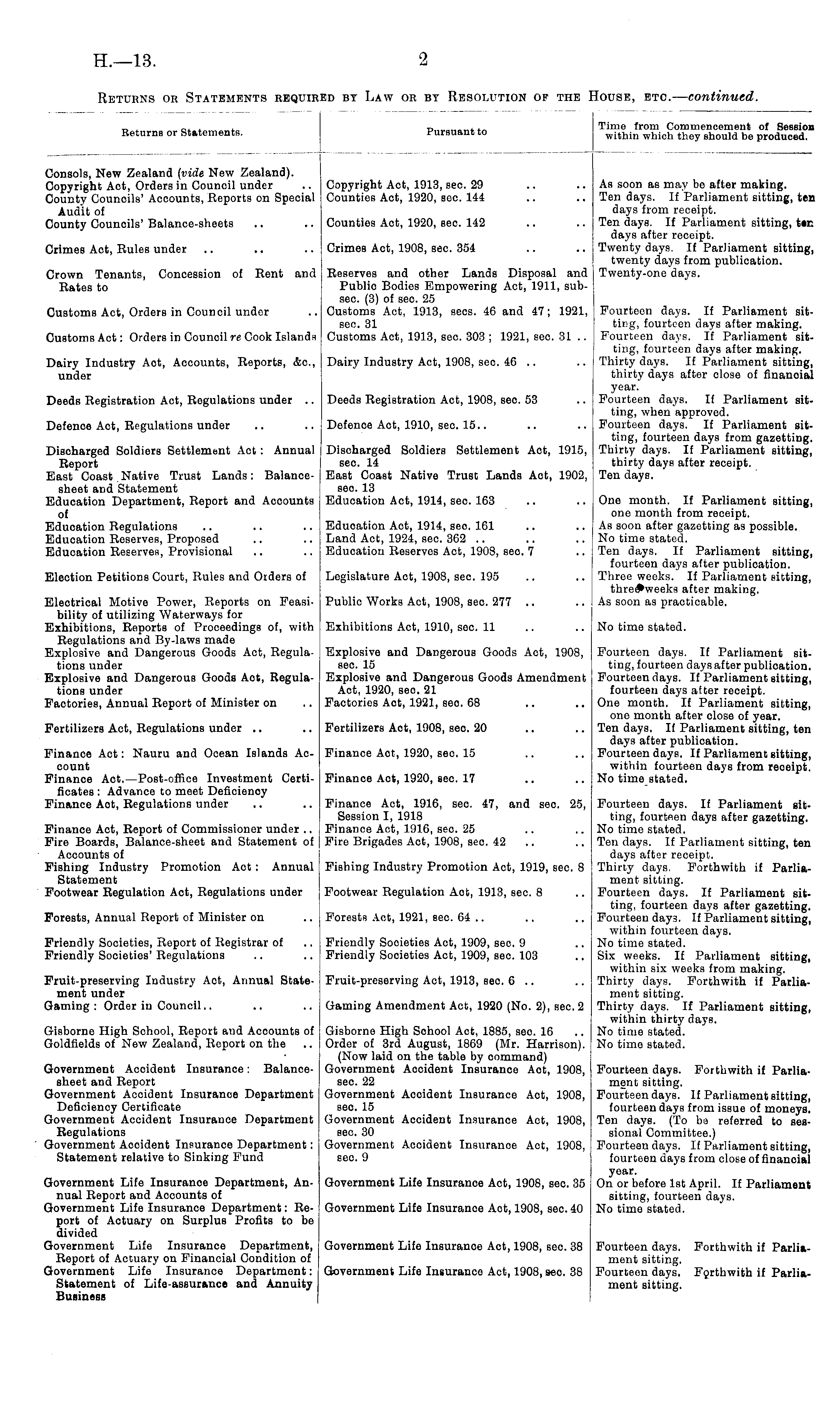 t> i. 0 , , , , Time from Commencement of Session Returns or Statements. Pursuant to within whlch they should be produced Consols, New Zealand (vide New Zealand). Copyright Aot, Orders in Council under .. Copyright Act, 1913, see. 29 .. .. As soon as may be after making. County Councils' Accounts, Reports on Special Counties Aot, 1920, sec. 144 .. .. Ten days. If Parliament sitting, ten Audit of days from receipt. County Councils' Balance-sheets .. .. Counties Act, 1920, sec. 142 .. .. Ten days. If Parliament sitting, ten days after receipt. Crimes Act, Rules under .. .. .. Crimes Act, 1908, sec. 354 .. .. Twenty days. If Parliament sitting, twenty days from publication. Crown Tenants, Concession of Rent and Reserves and other Lands Disposal and Twenty-one days. Rates to Public Bodies Empowering Act, 1911, subsec. (3) of sec. 25 Customs Act, Orders in Council under .. Customs Act, 1913, seos. 46 and 47; 1921, Fourteen days. If Parliament sitseo. 31 ting, fourteen days after making. Customs Act: Orders in Counoil re Cook Islands Customs Act, 1913, sec. 303 ; 1921, seo. 31 .. Fourteen days. If Parliament sitting, fourteen days after making. Dairy Industry Aot, Accounts, Reports, &c., Dairy Industry Act, 1908, seo. 46 .. .. Thirty days. If Parliament sitting, under thirty days after olose of finanoial year. Deeds Registration Act, Regulations under .. Deeds Registration Act, 1908, sec. 53 .. Fourteen days. If Parliament sitting, when approved. Defence Act, Regulations under .. .. Defenoe Aot, 1910, sec. 15.. .. .. Fourteen days. If Parliament sitting, fourteen days from gazetting. Discharged Soldiers Settlement Act : Annual Discharged Soldiers Settlement Aot, 1915, Thirty days. If Parliament sitting, Report sec. 14 thirty days after receipt. Bast Coast .Native Trust Lands; Balance- East Coast Native Trust Lands Aot, 1902, Ten days. sheet and Statement seo. 13 Education Department, Report and Accounts Education Act, 1914, sec. 163 .. .. One month. If Parliament sitting, of one month from reoeipt. Education Regulations .. .. .. Eduoation Act, 1914, seo. 161 .. .. As soon after gazetting as possible. Eduoation Reserves, Proposed .. .. Land Aot, 1924, sec. 362 .. .. .. No time stated. Education Reserves, Provisional .. .. Education Reserves Aot, 1908, seo. 7 .. Ten days. If Parliament sitting, fourteen days after publication. Election Petitions Court, Rules and Orders of Legislature Aot, 1908, sec. 195 .. .. Three weeks. If Parliament Bitting, thre#weeks after making. Eleotrioal Motive Power, Reports on Feasi- Public Works Act, 1908, seo. 277 .. .. As soon as practicable. bility of utilizing Waterways for Exhibitions, Reports of Proceedings of, with Exhibitions Act, 1910, seo. 11 .. .. No time stated. Regulations and By-laws made Explosive and Dangerous Goods Aot, Regula- Explosive and Dangerous Goods Aot, 1908, Fourteen days. If Parliament sittions under sec. 15 ting, fourteen days after publication. Explosive and Dangerous Goods Aot, Regula- Explosive and Dangerous Goods Amendment Fourteen days. If Parliament sitting, tions under Aot, 1920, seo. 21 fourteen days after reoeipt. Factories, Annual Report of Minister on .. Factories Act, 1921, seo. 68 .. .. One month. If Parliament sitting, one month after olose of year. Fertilizers Act, Regulations under .. .. Fertilizers Aot, 1908, seo. 20 .. .. Ten days. If Parliament sitting, ten days after publication. Finance Act: Nauru and Ocean Islands Ao- Finanoe Aot, 1920, seo. 15 .. .. Fourteen days. If Parliament sitting, count within fourteen days from receipt. Finance Act.—Post-office Investment Certi- Finance Aot, 1920, seo. 17 .. .. No time stated. ficates : Advance to meet Deficienoy Finance Aot, Regulations under .. .. Finance Act, 1916, seo. 47, and seo. 25, Fourteen days. If Parliament sitSession I, 1918 ting, fourteen days after gazetting. Finance Aot, Report of Commissioner under .. Finance Act, 1916, seo. 25 .. .. No time stated. Fire Boards, Balance-sheet and Statement of Fire Brigades Aot, 1908, seo. 42 .. .. Ten days. If Parliament sitting, ten Accounts of days after receipt. Fishing Industry Promotion Aot : Annual Fishing Industry Promotion Act, 1919, sec. 8 Thirty days, Forthwith if ParliaStatement ment sitting. Footwear Regulation Act, Regulations under Footwear Regulation Aot, 1913, seo. 8 .. Fourteen days. If Parliament sitting, fourteen days after gazetting. Forests, Annual Report of Minister on .. Forests Act, 1921, seo. 64 .. .. .. Fourteen days. If Parliament sitting, within fourteen days. Friendly Societies, Report of Registrar of .. Friendly Sooieties Act, 1909, seo. 9 .. No time stated. Friendly Societies' Regulations .. .. Friendly Sooieties Aot, 1909, seo. 103 .. Six weeks. If Parliament sitting, within six weeks from making. Fruit-preserving Industry Act, Annual State- Fruit-preserving Act, 1913, seo. 6 .. .. Thirty days. Forthwith if Parliament under ment sitting. Gaming: Order in Council.. .. .. Gaming Amendment Aot, 1920 (No. 2), seo. 2 Thirty days. If Parliament sitting, within thirty days. Gisborne High School, Report and Accounts of Gisborno High Sohool Act, 1885, seo. 16 .. No time stated. Goldfields of New Zealand, Report on the .. Order of 3rd August, 1869 (Mr. Harrison). No time stated. (Now laid on the table by oommand) Government Acoident Insurance: Balance- Government Accident Insurance Aot, 1908, Fourteen days. Forthwith if Parliasheet and Report seo. 22 ment sitting. Government Accident Insurance Department Government Accident Insurance Act, 1908, Fourteen days. If Parliament sitting, Deficienoy Certificate seo. 15 fourteen days from issue of moneys. Government Acoident Insurance Department Government Acoident Insurance Act, 1908, Ten days. (To be referred to sesRegulations sec. 30 sional Committee.) Government Aooident Insuranoe Department: Government Accident Insurance Aot, 1908, Fourteen days. If Parliament sitting, Statement relative to Sinking Fund seo. 9 fourteen days from olose of finanoial year. Go