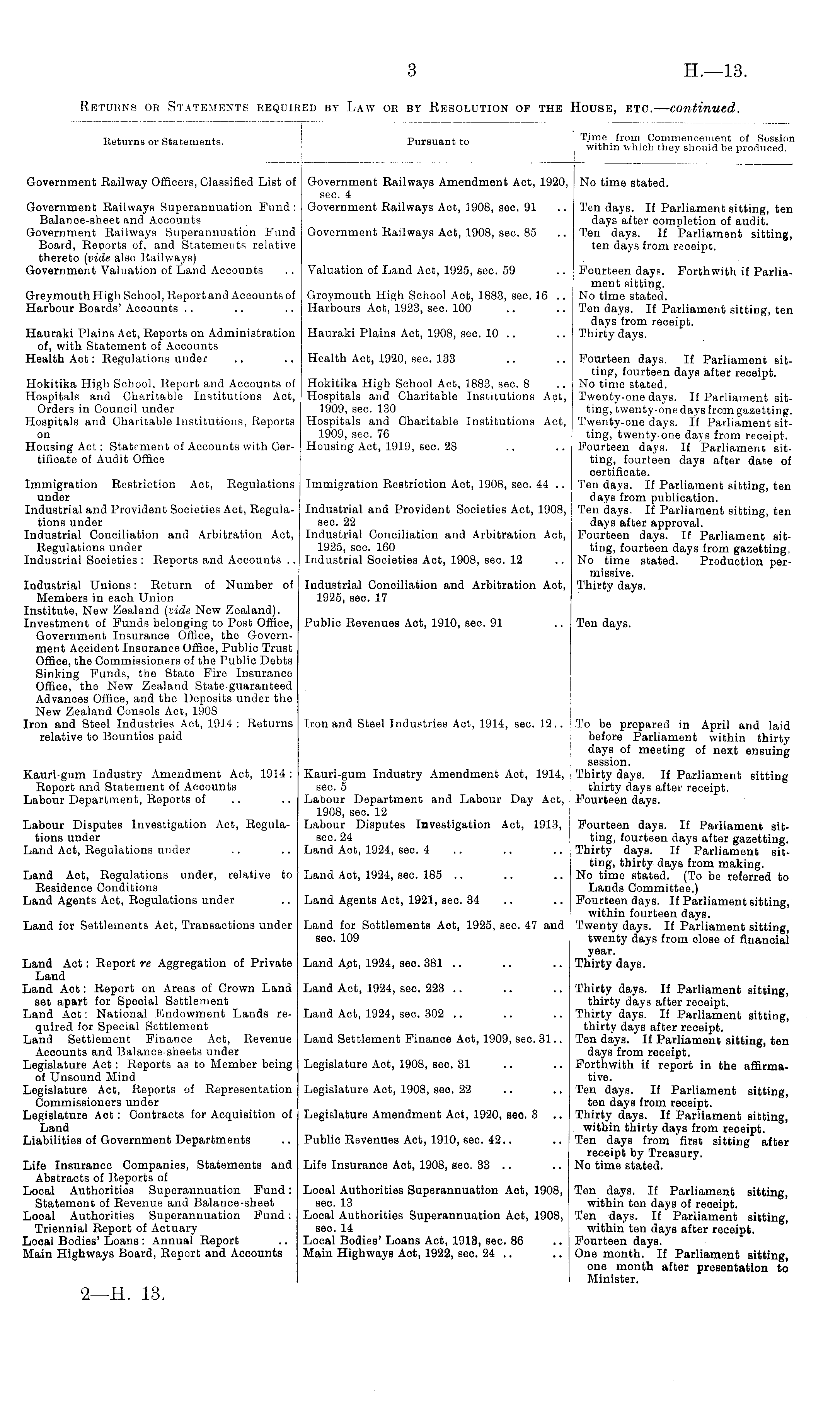 Returns or Statements. f Pursuant to T;me from Commencement of Session withm which they should be produced. Government Railway Officers, Classified List of Government Railways Amendment Act, 1920, No time stated. sec. 4 Government Railways Superannuation Fund : Government Railways Aot, 1908, sec. 91 .. Ten days. If Parliament sitting, ten Balance-sheet and Accounts days after completion of audit. Government Railways Superannuation Fund Government Railways Act, 1908, sec. 85 .. Ten days. If Parliament sitting, Board, Reports of, and Statements relative ten days from receipt. thereto (vide also Railways) Government Valuation of Land Accounts .. Valuation of Land Act, 1925, sec. 59 .. Fourteen days. Forthwith if Parliament sitting. GreymouthHighSchool,Reportand Accountsof Greymouth High School Act, 1883, sec. 16 .. No time stated. Harbour Boards' Accounts .. .. .. Harbours Act, 1923, sec. 100 .. .. Ten days. If Parliament sitting, ten days from receipt. Hauraki Plains Act, Reports on Administration Hauraki Plains Act, 1908, sec. 10 .. .. Thirty days. of, with Statement of Acoounts Health Act: Regulations under .. .. Health Act, 1920, sec. 133 .. .. Fourteen days. If Parliament sitting, fourteen days after receipt. Hokitika High School, Report and Accounts of Hokitika High School Act, 1883, sec. 8 .. No time stated. Hospitals and Charitable Institutions Act, Hospitals and Charitable Institutions Apt, Twenty-one days. If Parliament sitOrders in Council under 1909, sec. 130 ting,"twenty-onedaysfromgazeHing. Hospitals and Charitable Institutions, Reports Hospitals and Charitable Institutions Act, Twenty-one days. If Parliament siton 1909, sec. 76 ting, twenty-one days from receipt. Housing Act: Statement of Accounts with Cer- Housing Act, 1919, see. 28 .. .. Fourteen days. If Parliament sittificate of Audit Office ting, fourteen days after date of certificate. Immigration Restriction Act, Regulations Immigration Restriction Act, 1908, sec. 44 .. Ten days. If Parliament sitting, ten under days from publication. Industrial and Provident Societies Act, Regula- Industrial and Provident Societies Act, 1908, Ten days. If Parliament sitting, ten tions under seo. 22 days after approval. Industrial Conciliation and Arbitration Act, Industrial Conciliation and Arbitration Act, Fourteen days. If Parliament sitRegulations under 1925, sec. 160 ting, fourteen days from gazetting, Industrial Societies : Reports and Accounts .. Industrial Societies Aot, 1908, sec. 12 .. No time stated. Production permissive. Industrial Unions: Return of Number of Industrial Conciliation and Arbitration Act, Thirty days. Members in each Union 1925, sec. 17 Institute, New Zealand (vide New Zealand). Investment of Funds belonging to Post Office, Public Revenues Act, 1910, sec. 91 .. Ten days. Government Insurance Office, the Government Accident Insurance Office, Public Trust Office, the Commissioners of the Public Debts Sinking Funds, the State Fire Insurance Office, the New Zealand State-guaranteed Advances Offioe, and the Deposits under the New Zealand Consols Act, 1908 Iron and Steel Industries Act, 1914 : Returns Iron and Steel Industries Act-, 1914, sec. 12.. To be prepared in April and laid relative to Bounties paid before Parliament within thirty days of meeting of next ensuing session. Kauri-gum Industry Amendment Act, 1914 : Kauri-gum Industry Amendment Act, 1914, Thirty days. If Parliament sitting Report and Statement of Acoounts sec. 5 thirty days after receipt. Labour Department, Reports of .. .. Labour Department and Labour Day Act, Fourteen days. 1908, seo. 12 Labour Disputes Investigation Act, Regula- Labour Disputes Investigation Act, 1913, Fourteen days. If Parliament sifctions under see. 24 ting, fourteen days after gazetting. Land Act, Regulations under .. .. Land Aot, 1924, seo. 4 ., .. .. Thirty days. If Parliament sitting, thirty days from making. Land Act, Regulations under, relative to Land Act, 1924, sec. 185 .. .. .. No time stated. (To be referred to Residence Conditions Lands Committee.) Land Agents Act, Regulations under .. Land Agents Aot, 1921, sec. 34 .. .. Fourteen days. If Parliament sitting, within fourteen days. Land for Settlements Aot, Transactions under Land for Settlements Act, 1925, sec. 47 and Twenty days. If Parliament sitting, sec. 109 twenty days from close of financial year. Land Act: Report re Aggregation of Private Land Aot, 1924, seo. 381 .. .. .. Thirty days. Land Land Act: Report on Areas of Crown Land Land Aot, 1924, seo. 223 .. .. .. Thirty days. If Parliament sitting, set apart for Special Settlement thirty days after receipt. Land Act: National Endowment Lands re- Land Aot, 1924, sec. 302 .. .. .. Thirty days. If Parliament sitting, quired for Special Settlement thirty days after receipt. Land Settlement Finance Act, Revenue Land Settlement Finance Act, 1909, sec. 31.. Ten days. If Parliament sitting, ten Acoounts and Balance-sheets under days from receipt. Legislature Act: Reports as to Member being Legislature Act, 1908, sec. 31 .. .. Forthwith if report in the affirmsof Unsound Mind tive. Legislature Act, Reports of Representation Legislature Act, 1908, seo. 22 .. .. Ten days. If Parliament sitting, Commissioners under ten days from receipt. Legislature Aot: Contracts for Acquisition of Legislature Amendment Aot, 1920, seo. 3 .. Thirty days. If Parliament sitting, Land within thirty days from receipt. Liabilities of Government Departments .. Public Revenues Act, 1910, sec. 42.. .. Ten days from first sitting after receipt by Treasury. Life Insurance Companies, Statements and Life Insurance Aot, 1908, seo, 33 .. .. No time stated. Abstracts of Reports of Local Authorities Superannuation Fund: Local Authorities Superannuation Act, 1908, Ten days. If Parliament sitting, Statement of Revenue and Balance-sheet sec. 13 within ten days of receipt. Looal Authorities Superannuation Fund: Local Authorities Superannuation Act, 1908, Ten days. If Parliament sitting, Triennial Report o