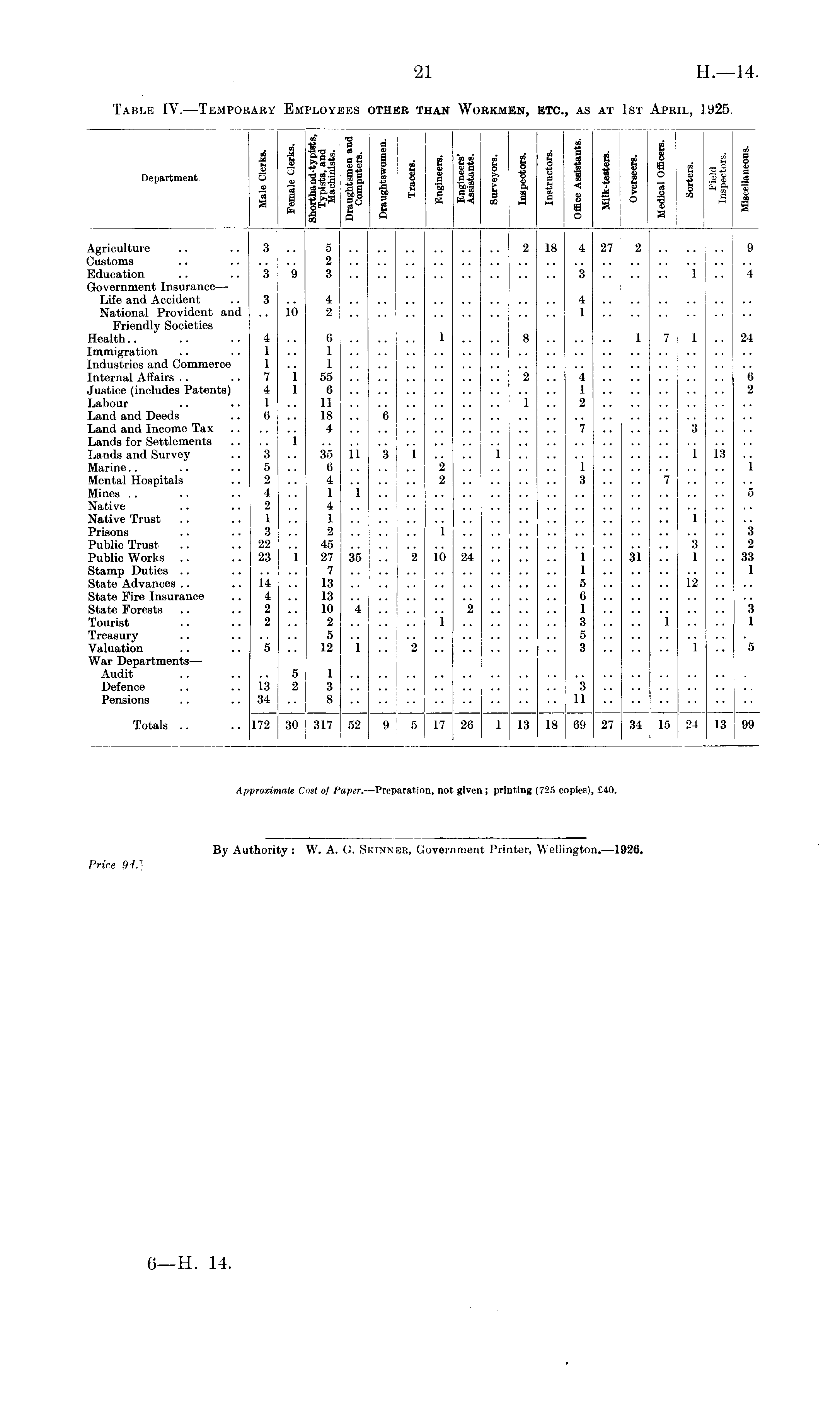 oo «C . I i 1 !y !| I < nn h 1 n i » j 1 Department. o a-|5 I §. -8 | § .9-§ ®Sg J -3 12 S .S 8 jS » I 3~f g& g 2 'S g»-g j- & M «S t ¥ a § tag- % « i s S3 f § g> b » d J 3 a s g = g m ® as a I 1H« 3og sw-)a>5S»gO'g M | g ft fl O s j Agriculture .. .. 3 .. 5 2 18 4 27 : 2 9 Customs .. 2 | Education .. .. 3 9 3 3 .. .. .. 1 .. 4 Government Insurance— Life and Accident .. 3 .. 4 4 ..j National Provident and .. 10 2 1 .. j Friendly Societies Health.. .. .. 4 .. 6 1 .. .. 8 1 7 1 .. 24 Immigration .. .. 1 .. 1 Industries and Commerce 1 .. 1 Internal Affairs .. .. 7 1 55 2 .. 4 .. 6 Justice (includes Patents) 4 1 6 1 2 Labour .. .. 1 .. 11 1 .. 2 Land and Deeds .. 6 .. 18 .. 6 Land and Income Tax 4 7 3 Lands for Settlements .. .. 1 Lands and Survey .. 3 ... 35 11 3 1 .. .. 1 1 13 .. Marine.. .. .. 5 .. 6 2 1 1 Mental Hospitals .. 2 .. 4 2 3 .. .. 7 Mines .. .. .. 4 .. 1 1 5 Native .. f . 2 .. 4 Native Trust .. .. 1 .. I 1 Prisons .. .. 3 .. 2 1 3 Public Trust .. .. 22 .. 45 3 .. 2 Public Works .. .. 23 1 27 35 .. 2 10 24 1 .. 31 .. 1 .. 33 Stamp Duties .. 7 1 1 State Advances .. .. 14 .. 13 5 12 State Fire Insurance .. 4 .. 13 6 State Forests .. .. 2 .. 10 4 2 1 3 Tourist .. .. 2 .. 2 1 3 .. .. 1 .. .. 1 Treasury .. 5 5 Valuation .. .. 5 .. 12 1 .. 2 3 1 .. 5 War Departments— Audit .. .. .. 5 1 Defence .. .. 13 2 3 I 3 Pensions .. .. 34 .. 8 11 Totals .. .. 172 30 317 52 9 5 17 26 1 13 18 69 27 34 j 15 24 13 99