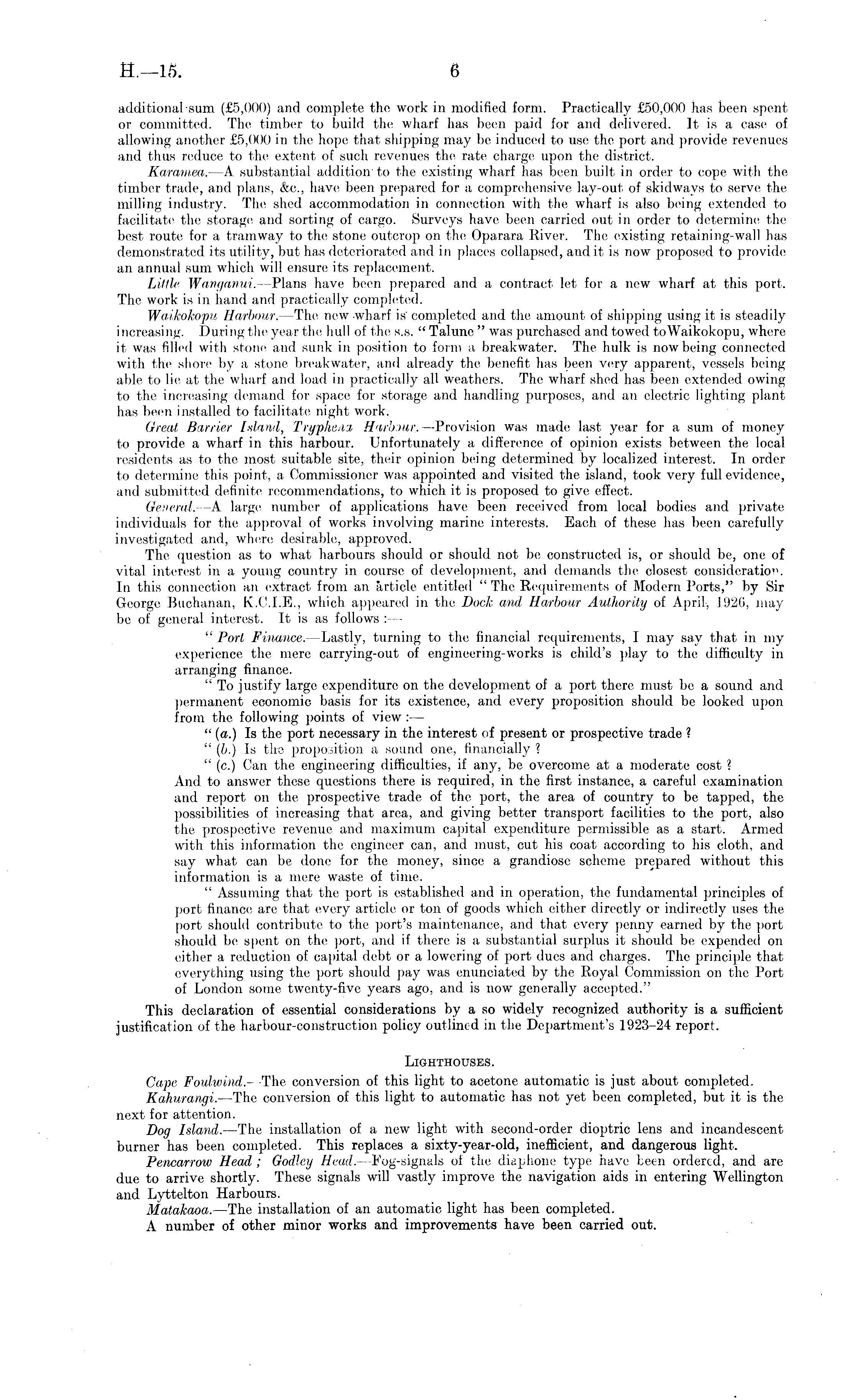 additional -sum (£5,000) and complete the work in modified form. Practically £50,000 has been spent or committed. The timber to build the wharf has been paid for and delivered. It is a case of allowing another £5,000 in the hope that shipping may be induced to use the port and provide revenues and thus reduce to the extent of such revenues the rate charge upon the district. Karamea. —A substantial addition' to the existing wharf has been built in order to cope with the timber trade, and plans, &c., have been prepared for a comprehensive lay-out of skidways to serve the milling industry. The shed accommodation in connection with the wharf is also being extended to facilitate the storage and sorting of cargo. Surveys have been carried out in order to determine the best route for a tramway to the stone outcrop on the Oparara River. The existing retaining-wall has demonstrated its utility, but has deteriorated and in places collapsed, and it is now proposed to provide an annual sum which will ensure its replacement. Little WanganuiPlans have been prepared and a contract let for a new wharf at this port. The work is in hand and practically completed. Waikokopu Harbour. —The new -wharf is' completed and the amount of shipping using it is steadily increasing. During the year the hull of the s.s. " Talune " was purchased and towed toWaikokopu, where it was filled with stone and sunk in position to form a breakwater. The hulk is now being connected with the shore by a stone breakwater, and already the benefit has been very apparent, vessels being able to lie at the wharf and load in practically all weathers. The wharf shed has been extended owing to the increasing demand for space for storage and handling purposes, and an electric lighting plant has been installed to facilitate night work. Great Barrier Island, Tryphe/ia Harbour,. —Provision was made last year for a sum of money to provide a wharf in this harbour. Unfortunately a difference of opinion exists between the local residents as to the most suitable site, their opinion being determined by localized interest. In order to determine this point, a Commissioner was appointed and visited the island, took very full evidence, and submitted definite recommendations, to which it is proposed to give effect. General. —A large number of applications have been received from local bodies and private individuals for the approval of works involving marine interests. Each of these has been carefully investigated and, where desirable, approved. The question as to what harbours should or should not be constructed is, or should be, one of vital interest in a young country in course of development, and demands the closest consideration. In this connection an extract from an article entitled " The Requirements of Modern Ports," by Sir George Buchanan, K.C.1.E., which appeared in the Doclc and Harbour Authority of April-, 1926, may be of general interest. It is as follows :—■ " Port Finance. —Lastly, turning to the financial requirements, I may say that in my experience the mere carrying-out of engineering-works is child's play to the difficulty in arranging finance. " To justify large expenditure on the development of a port there must be a sound and permanent economic basis for its existence, and every proposition should be looked upon from the following points of view : — " (a.) Is the port necessary in the interest of present or prospective trade ? " (6.) Is the proposition a sound one, financially ? " (e.) Can the engineering difficulties, if any, be overcome at a moderate cost ? And to answer these questions there is required, in the first instance, a careful examination and report on the prospective trade of the port, the area of country to be tapped, the possibilities of increasing that area, and giving better transport facilities to the port, also the prospective revenue and maximum capital expenditure permissible as a start. Armed with this information the engineer can, and must, cut his coat according to his cloth, and say what can be done for the money, since a grandiose scheme prepared without this information is a mere waste of time. " Assuming that the port is established and in operation, the fundamental principles of port finance are that every article or ton of goods which either directly or indirectly uses the port should contribute to the port's maintenance, and that every penny earned by the port should be spent on the port, and if there is a substantial surplus it should be expended on either a reduction of capital debt or a lowering of port dues and charges. The principle that everything using the port should pay was enunciated by the Royal Commission on the Port of London some twenty-five years ago, and is now generally accepted." This declaration of essential considerations by a so widely recognized authority is a sufficient justification of the harbour-construction policy outlined in the Department's 1923-24 report. Lighthouses. Cape FoulwindThe conversion of this light to acetone automatic is just about completed. Kahurangi.—The conversion of this light to automatic has not yet been completed, but it is the next for attention. Dog Island. —The installation of a new light with second-order dioptric lens and incandescent burner has been completed. This replaces a sixty-year-old, inefficient, and dangerous light. Pencarrow Head ; Godley Head. —Fog-signals of the diaphone type have been ordered, and are due to arrive shortly. These signals will vastly improve the navigation aids in entering Wellington and Lyttelton Harbours. Matakaoa. —The installation of an automatic light has been completed. A number of other minor works and improvements have been carried out.