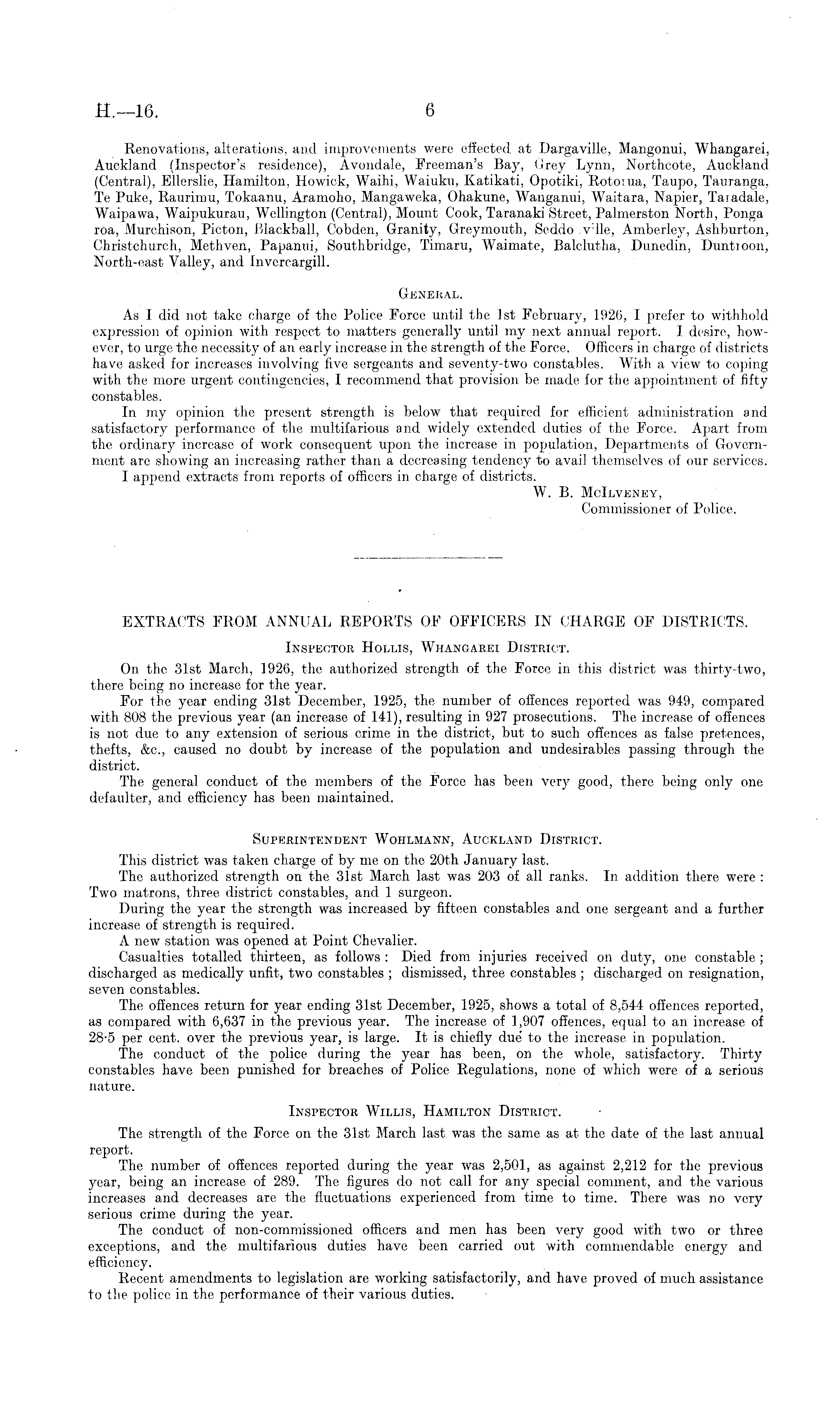 Renovations, alterations, and improvements were effected at Dargaville, Mangonui, Whangarei, Auckland (Inspector's residence), Avondale, Freeman's Bay, Grey Lynn, Northcote, Auckland (Central), Ellerslie, Hamilton, Howick, Waihi, Waiuku, Katikati, Opotiki, Rotoiua, Taupo, Tauranga, Te Puke, Raurimu, Tokaanu, Aramoho, Mangaweka, Ohakune, Wanganui, Waitara, Napier, Taradale, Waipawa, Waipukurau, Wellington (Central), Mount Cook, Taranaki Street, Palmerston North, Ponga roa, Murchison, Picton, Blackball, Cobden, Granity, Greymouth, Seddo v'lle, Amberley, Ashburton, Christchurch, Methven, Papanui, Southbridge, Timaru, Waimate, Balclutha, Dunedin, Duntioon, North-east Valley, and Invercargill. General. As I did not take charge of the Police Force until the Ist February, 1926, I prefer to withhold expression of opinion with respect to matters generally until my next annual report. I desire, however, to urge the necessity of an early increase in the strength of the Force. Officers in charge of districts have asked for increases involving five sergeants and seventy-two constables. With a view to coping with the more urgent contingencies, I recommend that provision be made for the appointment of fifty constables. In my opinion the present strength is below that required for efficient administration and satisfactory performance of the multifarious and widely extended duties of the Force. Apart from the ordinary increase of work consequent upon the increase in population, Departments of Government are showing an increasing rather than a decreasing tendency to avail themselves of our services. I append extracts from reports of officers in charge of districts. W. B. Mcllveney, Commissioner of Police.