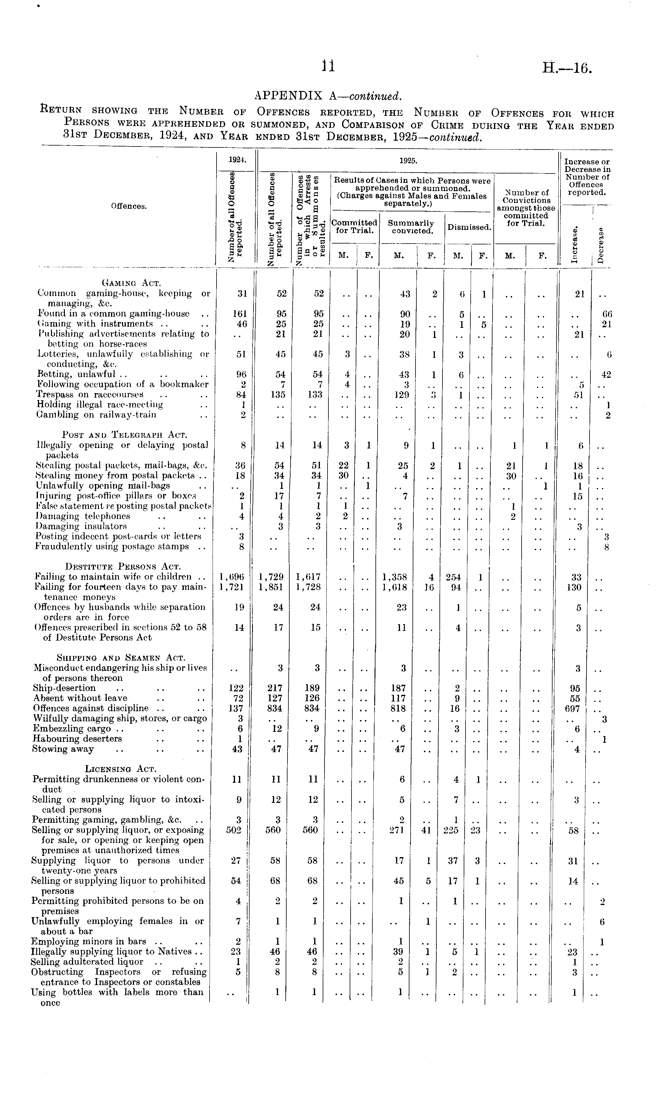 1924. 1925. Increase or — » Decrease in ® o ©■§« Results of Oases in which Persons were 5 9 a ? m apprehended or summoned. jp jt- (Charges against Males and Females Number of repoited. Offences. 2 2 S separately.) amongsUhole "3 *3 a committed j «wrd 0 .2 5tj Committed Summarily for Trial. °S °.S ..3*® for Trial. convicted! Dismissed. s « ® II *4 u U f£ MJ H 2 fa |& | J —, T i e B ® I ® § -9 o g M. P. M. i P. M. P. M. P. C I f Z 7. [ _ : Gaming Act. Common gaming-house, keeping or 31 52 52 .... 43 2 6 1.. .. 21 managing, &e. Found in a common gaming-house .. 101 95 95 .... 90 .. 5 .. .. .. 66 Gaming with instruments .. .. 46 25 25 .... 19 1 5.. .. .. 21 Publishing advertisements relating to .. 21 21 .... 20 1 .... .. .. 21 betting on horse-races Lotteries, unlawfully establishing or 51 45 45 3 38 1 3 .. .. 6 conducting, &c, Betting, unlawful .. .. .. 96 54 54 4 43 1 6 .. .. .. 42 Following occupation of a bookmaker 2 7 7 4.. 3 .. 5.. Trespass on racecourses .. .. 84 135 133 .. .. 129 3 1 .. .... 51 Holding illegal race-meeting .. 1 .. .. .... .. .. .. 1 Gambling on railway-train .. 2 .. .. .... .. .. .... .. .. .. 2 Post and Telegraph Act. Illegally opening or delaying postal 8 14 14 31 9 1 1 1 6.. packets Stealing postal packets, mail-bags, <fcc. 36 54 51 22 1 25 2 1 21 1 18 Stealing money from postal packets .. 18 34 34 30 4 30 .. 16 .. Unlawfully opening mail-bags .. .. 1 1 .. 1 .. .. .... .. 1 1 Injuring post-office pillars or boxe3 2 17 7 .... 7 .. .... .. .. 15 False statement re posting postal packets 1 1 1 1 .. .. .... 1 Damaging telephones .. .. 4 4 2 2.. .. .. .... 2 Damaging insulators .. .. .. 3 3 .... 3 .. .... .. .. 3 Posting indecent post-cards or letters 3 .. .. .... .. .. .... .. .. .. 3 Fraudulently using postage stamps .. 8 .. .. .... .. .. .... .. .. .. 8 Destitute Persons Act. Failing to maintain wife or children .. 1,696 1,729 1,617 .. .. 1,358 4 254 1 .. .. 33 Failing for fourteen days to pay main- 1,721 1,851 1,728 .. .. 1,618 16 94 .. .. 130 tenance moneys Offences by husbands while separation 19 24 24 .... 23 .. 1 .. .. 5 orders are in force Offences prescribed in sections 52 to 58 14 17 15 .... 11 .. 4 .. .. 3 of Destitute Persons Act Shipping and Seamen Act. Misconduct endangering his ship or lives .. 3 3 .... 3 .. .... .. .. 3.. of persons thereon Ship-desertion .. .. .. 122 217 189 .. .. 187 .. 2 .. .. 95 Absent without leave .. .. 72 127 126 .. .. 117 .. 9 .. .. 55 Offences against discipline .. .. 137 834 834 .. .. 818 .. 16 .. .. .. 697 Wilfully damaging ship, stores, or cargo 3 .. .. .... .. .. .. .. 3 Embezzling cargo .. .. .. 6 12 9 .... 6 .. 3.. .. .. 6.. Habouring deserters .. .. 1 .. .. .... .. .. .. 1 Stowing away .. .. .. 43 j 47 47 .... 47 .. I 4 Licensing Act. Permitting drunkenness or violent con- 11 11 11 .... 6 .. 4 1 duct Selling or supplying liquor to intoxi- 9 12 12 .... 5 .. 7 .. .. 3 cated persons Permitting gaming, gambling, &c. .. 3 3 3 .... 2 .. 1 Selling or supplying liquor, or exposing 502 560 560 .. .. 271 41 225 23 .. .. 58 for sale, or opening or keeping open premises at unauthorized times Supplying liquor to persons under 27 58 58 .. .. 17 1 37 3 .. .. 31 twenty-one years Selling or supplying liquor to prohibited 54 j 68 68 .. I .. 45 5 17 1 .. .. 14 persons Permitting prohibited persons to be on 4 2 2 .... 1 .. 1 .. .. .. 2 premises Unlawfully employing females in or 7 1 1 .... .. 1 .... .. .. ! 6 about a bar Employing minors in bars .. .. 2 1 1 .... 1 .. .. 1 Illegally supplying liquor to Natives .. 23 46 46 .... 39 1 5 1.. .. 23 Selling adulterated liquor .. .. 1 2 2 .... 2 .. 1 Obstructing Inspectors or refusing 5 8 8 .... 5 1 2.. .. | 3.. entrance to Inspectors or constables Using bottles with labels more than •• 1 1 .... 1 • • 1.. once II II