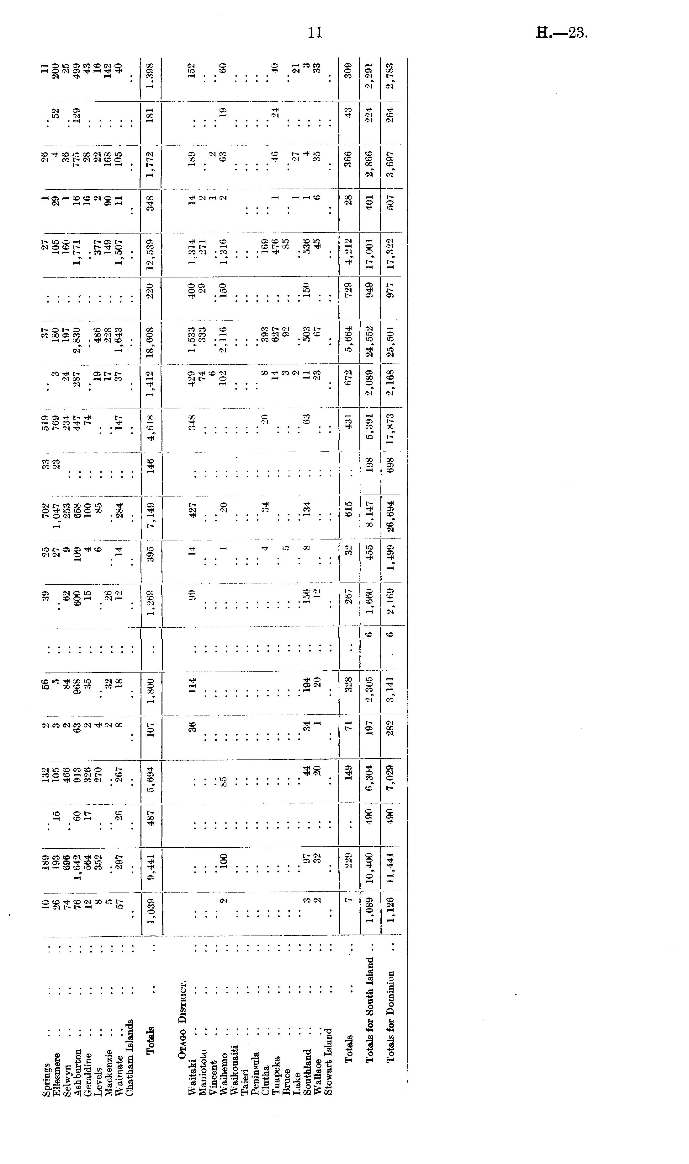 Springs .. .. 10 | 189 .. 132 i 2 , 56 39 25 i 702 33 I 519 37 j .. | 27 1 26 | 11 Ellesmere .. .. . i 26 193 15 105 3 5 .. .. 27 1,047 23 769 3 180 1 105 29 4 52 200 Selwvn .. .. .. 74 ! 696 .. i 466 | 2 84 62 9 253 .. | 234 24 197 .. 160 1 36 25 Ashburton .. .. .. 76 1,642 60 i 913 j 63 968 .. 600 109 658 .. 447 287 2,830 j ., 1,771 16 775; 129 499 Geraldine .. .. .. 12 564 17 I 326 2 35 .. 15 4 I 100 ! 74 .. , .. .. 16 28 : 43 Levels .. .. .. 8 352 .. 270 4 .. .. 6 85 .. I 19 486 377 2 22 j 16 Mackenzie .. .. .. 5 .. .. 2 32 26 .. .. 17 228 149 90 168 . . 142 Waimate .. .. .. 57 297 26 267 8 18 12 I I 2M 147 37 1,643 { .. 1,507 11 105 | .. 40 Chatham Islands .. .. .. .. .. | . .. .. j j j .. I .. .. j Totals .. .. 1,039 9,441 487 5,694 107 1,800 .. j 1,269 I 395: 7,149! 146 4,618 1,412 18,608 220 12,539 348 1,772 181 1,398 _ , j ; | __ Otago District. Waitaki .. .. .. .. .. .. .. 36 114 .. 99 I 14 427 I 348 . 429 1,533 400 1,314 14 189 .. 152 Maniototo .. .. .. .... .... j .. .... .... .. 74 333 29 271 2 .... Vincent .. .. .. .... .... .. i .... j 6 j .. 1 2 Waihemo .. .. .. 2 100 85 .. .. .. .. 1 20 | .. 102 2,116 150 1,316 2 63 19 60 Waikouaiti .. .. j .. .. .... .. .... ..... .... Taieri ... .. .. . J .... .. .. .. .. .. .... .. .. .. Peninsula .. .. .. .. .. . • .. .. .. .. .. -. .. .. .... .. .. .. .... Clutha .. .. .. .. .. .... .... .. .. 4 34 .. 20 8 393 .. 169 | Tuapeka .. .. .. .. .. .... .. I .. .. .... 14 627 .. 476 1 1 46 24 40 Bruce .. .. .. .. .. .. .. ........ 5 .. . . .. 3 92 .. 85 Lake .. .. i .. .. .. .. .. .. 2 .. .. .. 1 27 .. 21 Southland .. .. .. 3 97 .. 44 34 194 156 8 134 .. j 63 : 11 503 150 536 1 4 , 3 WaUace .. .. .. 2 32 .. i 20 1 20 12 j .. .. .. 23 67 45 6 35 33 Stewart Island .. .. .. .. .... .. .. .. .. I .. ...... Totals .. .. 7 229 | 149 71 328 .. 267 32 615 j 431 672 5,664 729 4,212 28 366 43 309 Totals for South Island .. 1,089 10,400 490 ; 6,304 197 2,305 6 1,660 455 8,147 198 5,391 2,089 24,552 949 17,001 401 2,866 224 1 2,291 Totals for Dominion .. 1,126 11,441 490 ! 7,029 282 1 3,141 6 2,169 1,499 26,694 698 ! 17,873 2,168 | 25,501 977 17,322 507 3,697 264 j 2,783