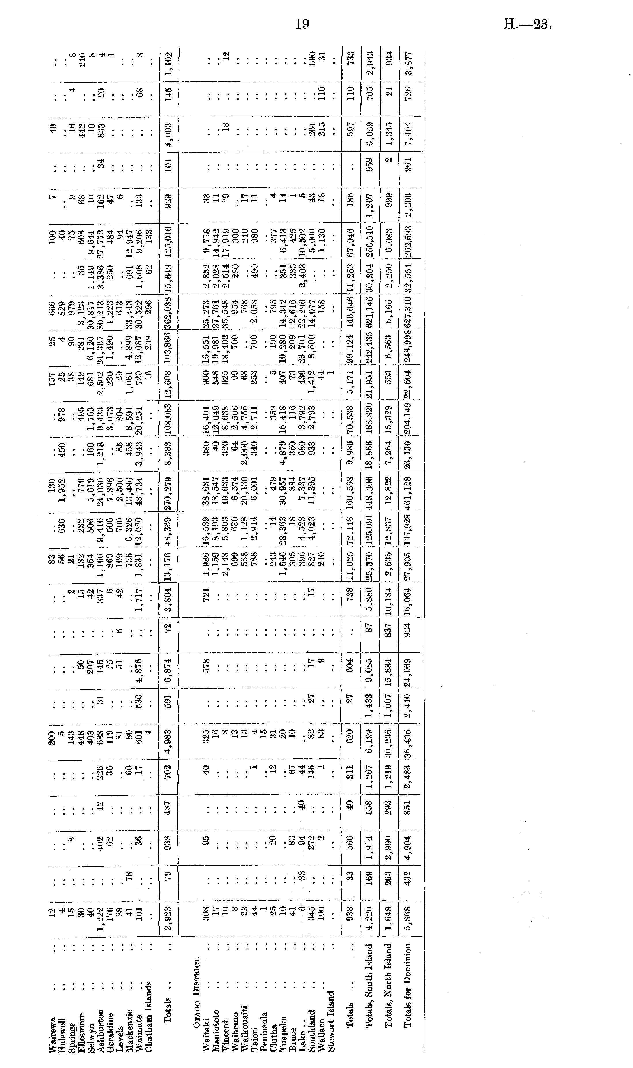 Wairewa .. .. 12 .. .. .. .. 200 .. .. .. .. 83 I 130 .. 1 157 25 666 .. 100 7 .. 49 Halswell .. .. 4 .. .. .. .. 5 .. .. .. .. 56 636 1,952 450 978 25 4 829 .. 40 Springs .. . 15 8 .. 143 2 21 .. .. .. .. 38 90 979 75 9 16 4 8 Ellesmere .. .. 30 .. .. .. .. 448 .. 50 .. 15 132 232 779 .. 495 149 281 3,123 35 608 68 .. 442 .. 240 Selwyn .. .. j 40 .. .. .. .. 403 .. 207 .. 42 354! 506 5,619 160 1,763 681 6,120 30,817 1,149 9,644 10 .. 10 .. 8 Ashburton .. .. 1,222 .. 402 12 226 688 31 145 .. 337 1,166 ! 9,416 24,030 I 1,218 9,433 2,502 24,367 80,213 3,386 27,772 162 34 833 20 4 Geraldine .. ..176 .. 62 .. 36 119 .. 25 .. 6 869 506 7,396 I .. ! 3,073 230 1,490 1,223 250 484 47 .. .. .. ] Levels .. .. 88 .. .. .. .. i 81 .. 51 6 42 169 I 700 2,500 : 85 | 804 29 .. 613 .. 94 6 .. Mackenzie .. .. 41 78 .. .. 60 80 .. .. .. .. 736 j 6,326 13,486 458 I 8,591 1,061 4,899 33,443 691 12,947 Waimate .. .. 101 .. 36 .. 17 601 530 4,876 .. 1,717 1,831 12,020 48,734 3,943 20,251 720 12,087 30,522 1,608 1 9,206 133 .. .. 68 8 Chatham Islands .. .. .. j .. .. 4 .. .. .. .. I .. ,. | .. 16 239 296 62 133 Totals .. .. 2,923 | 79 j 938 487 702 4,983 591 6,874 72 3,804 13,176 48,369 270,279 8,383 j 108, 083 12,608 103,866 362,038 15,649 125,016 929 101 4,003 145 1,102 | j _ " ~ | | Otago District. Waitaki .. .. ! 308 .. 95 .. 40 325 .. 578 .. 721 1,986 il6,539 38,631 380 16,401 900 16,551 25,273 2,852 9,718 33 Maniototo .. .. 17 .. .. .. .. 16 .. .. .. .. 1,159 ! 8,193 18,547 40 12,049 548 19,981 27,761 2,028 14,942 11 Vincent .. .. 10 .. .. .. -. 8 2,148 5,803 19,633 320 8,638 925 18,402 35,548 2,514 17,919 29 .. 18 .. 12 Waihemo .. .. 8 .. .. .. .. 13 .. .. .. .. 699 , 630 6,574 64 2,506 99 i 700 954 280 ' 300 .. .. .. .. .. Waikouaiti .. .. 23 .. .. .. .. 13 .. .. .. .. 588 1,128 20,130 2,000 4,755 68 I 768 .. : 240 17 Taieri .. .. 44 ! 1 j 4 788 2,914 6,001 340 2,711 253 ! 700 2,058 490 : 980 11 Peninsula .. .. 1 .. .. .. j 15 j .. I .. .. .. .. .. .. .. .. .. .. Clutha .. .. 25 [ 20 .. 12 1 31 i .. .. .. 243 14 479 .. 359 5 | 100 795 I .. ! 377 4 Tuapeka .. .. 10 i 20 .. .. i .. 1,646 28,363 30,957 4,879 16,418 407 10,280 14,342 351 1 6,413 14 Bruce .. .. 41 .. 83 .. 67 10 .. .. .. .. 305 ! 18 884 350 116 73 209 2,616 335 425 1 Lake.. .. 6 33 94 i 40 44 j ... .. .. 396 4,523 7,337 680 3,792 436 23,701 22,296 | 2,403 10,502 5 Southland .. 31", 272 ! 146 82 ! 27 17 .. 17 827 4,023 11,395 933 2,793 1,412 8,500 14,077 ! ... 5,000 43 .. 264 .. 690 Wallace .. .. | 100 | .. 2-j .. 1 83 .. 9 .. .. 240 .. | .. .. .. 44 .. 158; .. 1,130 18; .. 315 110 31 Stewart Island .. .. .. .. .. .. .. .. .. .. .. .. .. .. .. .. 1 — Totals .. .. 938 33 566 40 311 620 27 604: .. 738 11,025 [72, 148 160,568 9,986 70,538 5,171 99,124 146,646 11,253 67,946 186! .. 597 110 733 Totals, South Island 4,220 j 169 1,914 558 1,267 6,199 j 1,433 9,085 | 87 5,880 25,370 125,091 448,306 18,866 188,820 21,951 |242, 435 621,145 ;30, 304 256,510 1,207; 959 6,059 705 2,943 Totals, North Island J 1,648 263 2,990 293 1,219 30,236 ! 1,007 15,884 837 10,184 2,535 12,837 12,822 7,264 15,329 553 6,563 6,165 [ 2,250 6,083 999 2 1,345 21 934 Totals for Dominion j 5,868 ; 432 4,904 851 2,486 36,435 j 2,440 24,969 924 j 16,064 27,905 137, 928 461,128 26,130 204,149 22,504 248,998 627,310 132, 554 262,593 2,206 961 7,404 726 3,877