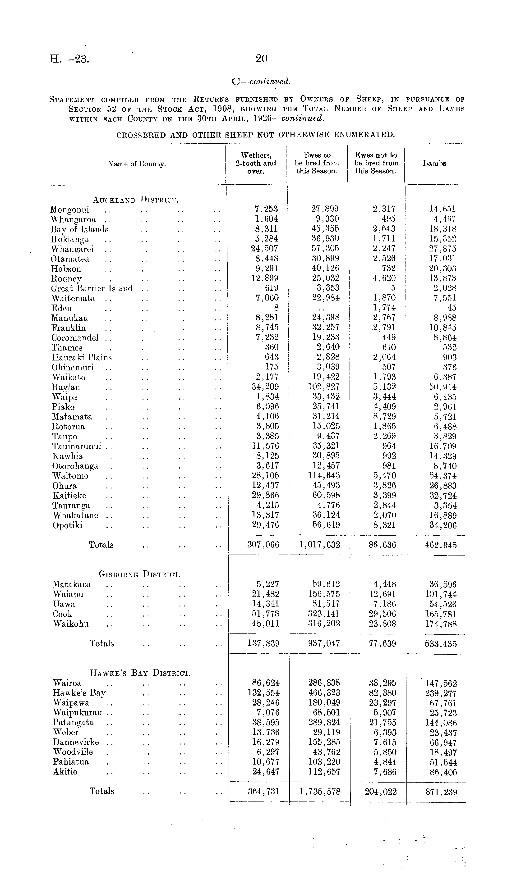 C —continued. Statement compiled from the Returns furnished by Owners of Sheep, in pursuance of Section 52 of the Stock Act, 1908, showing the Total Number of Sheep and Lambs within each County on the 30th April, 1926—continued. CROSSBRED AND OTHER SHEEP NOT OTHERWISE ENUMERATED.