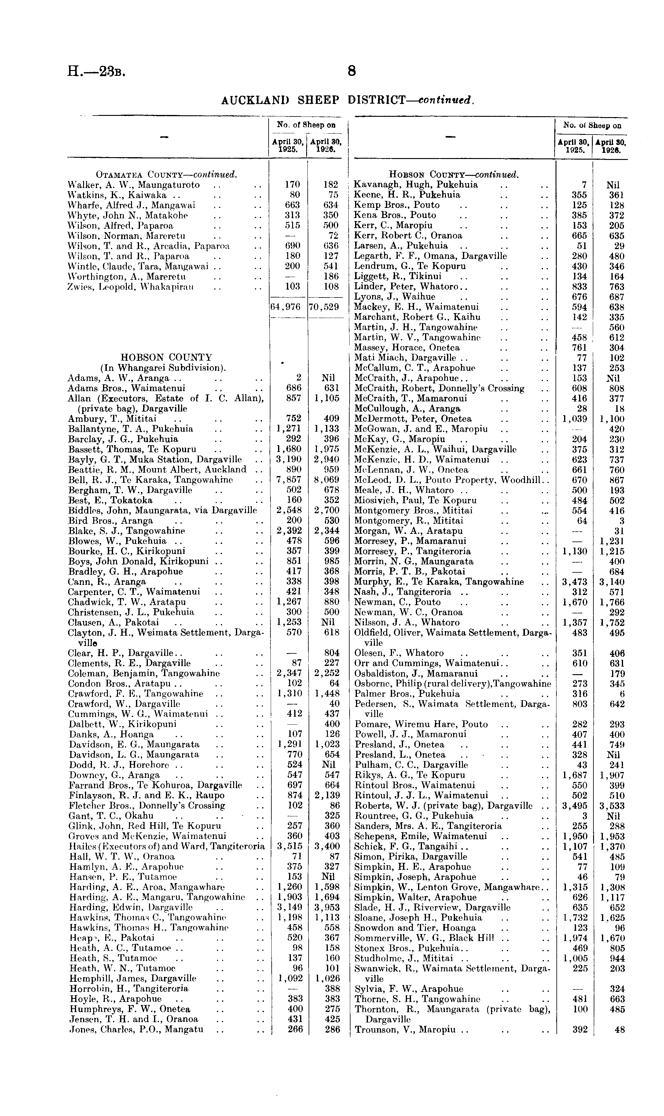 No. of Sheep on April 30, April 30, 1925. 1928. Otamatea County—continued. Walker, A. W., Maungaturoto . . .. 170 182 Watkins, K., Kaiwaka .. .. .. 80 75 Wharfe, Alfred J., Mangawai . . .. 663 634 Whyte, John N., Matakohe . . .. 313 350 Wilson, Alfred, Paparoa .. .. 515 500 W'ilson, Norman, Mareretu .. .. — 72 Wilson, T. and R., Arcadia, Paparoa .. 690 636 Wilson, T. and R., Paparoa . . . . 180 127 Win tie, Claude, Tara, Mangawai .. .. 200 541 Worthington, A., Mareretu .. .. — 186 Zwies, Leopold, Whakapirau .. .. 103 108 64,976 70,529 HOBSON COUNTY (In Whangarei Subdivision). Adams, A. W., Aranga .. .. .. 2 Nil Adams Bros., Waimatenui .. .. 686 631 Allan (Executors, Estate of I. C. Allan), 857 1,105 (private bag), Dargaville Ambury, T., Mititai .. .. .. 752 409 Ballantyne, T. A., Pukehuia .. .. 1,271 ] ,133 Barclay, J. G., Pukehuia . . .. 292 396 Bassett, Thomas, Te Kopuru .. .. 1,680 1,975 Bayly, G. T., Muka Station, Dargaville . . 3,190 2,940 Beattie, R. M., Mount Albert, Auckland .. 890 959 Bell, R. J., Te Karaka, Tangowahine .. 7,857 8,069 Bergham, T. W., Dargaville .. .. 502 678 Best, E., Tokatoka .. .. . . 160 352 Biddies, John, Maungarata, via Dargaville 2,548 2,700 Bird Bros., Aranga .. .. .. 200 530 Blake, S. J., Tangowahine .. .. 2,392 2,344 Blowes, W., Pukehuia .. .. . . 478 596 Bourke, H. C., Kirikopuni .. .. 357 399 Boys, John Donald, Kirikopuni .. . . 851 985 Bradley, G. H., Arapohue .. . . 417 368 Cann, R., Aranga .. .. .. 338 398 Carpenter, C. T., Waimatenui .. . . 421 348 Chadwick, T. W., Aratapu .. .. 1,267 880 Christensen, J. L., Pukehuia .. .. 300 500 Clausen, A., Pakotai .. .. .. 1,253 Nil Clayton, J. H., Settlement, Darga- 570 618 vill© Clear, H. P., Dargaville.. .. .. — 804 Clements, R. E., Dargaville . . .. 87 227 Coleman, Benjamin, Tangowahine .. 2,347 2,252 Condon Bros., Aratapu .. . . . . 102 64 Crawford, F. E., Tangowahine .. .. 1,310 1,448 Crawford, W., Dargaville .. . . — 40 Cummings, W. G., Waimatenui .. .. 412 437 Dalbett, W., Kirikopuni .. .. — 400 Danks, A., Hoanga . . . . . . 107 126 Davidson, E. G., Maungarata .. .. 1,291 1,023 Davidson, L. G., Maungarata .. .. 770 654 Dodd, R. J., Horehore .. . . .. 524 Nil Downey, G., Aranga . . .. .. 547 547 Farrand Bros., Te Kohuroa, Dargaville . . 697 664 Finlayson, R. J. and E. K., Raupo . . 874 2,139 Fletcher Bros., Donnelly's Crossing . . 102 86 Gant, T. C., Okahu . . .... — 325 Glink, John, Red Hill, Te Kopuru .. 257 360 Groves and McKenzie, Waimatenui . . 360 403 Hailes (Executors of) and Ward, Tangiteroria 3,515 3,400 Hall, W. T. W., Oranoa .. .. 71 87 Hamlyn, A. E., Arapohue .. .. 375 327 Hansen, P. E., Tutamoe .. .. 153 Nil Harding, A. E., Aroa, Mangawhare .. 1,260 1,598 Harding, A. E., Mangaru, Tangowahine . . 1,903 1,694 Harding, Edwin, Dargaville .. .. 3,149 3,953 Hawkins, Thomas C., Tangowahine . . 1,198 1,113 Hawkins, Thomas H., Tangowahine . . 458 558 Heap3, E., Pakotai . . .. .. 520 367 Heath, A. C., Tutamoe .. .. .. 98 158 Heath, S., Tutamoe .. . . . . 137 160 Heath, W. N., Tutamoe .. . . 96 101 Hemphill, James, Dargaville .. .. 1,092 1,026 Horrobin, H., Tangiteroria .. .. — 388 Hoyle, R., Arapohue .. . . .. 383 383 Humphreys, F. W., One tea . . .. 400 275 Jensen, T. H. and I., Oranoa .. . . 431 425 Jones, Charles, P.O., Mangatu .. .. 266 286
