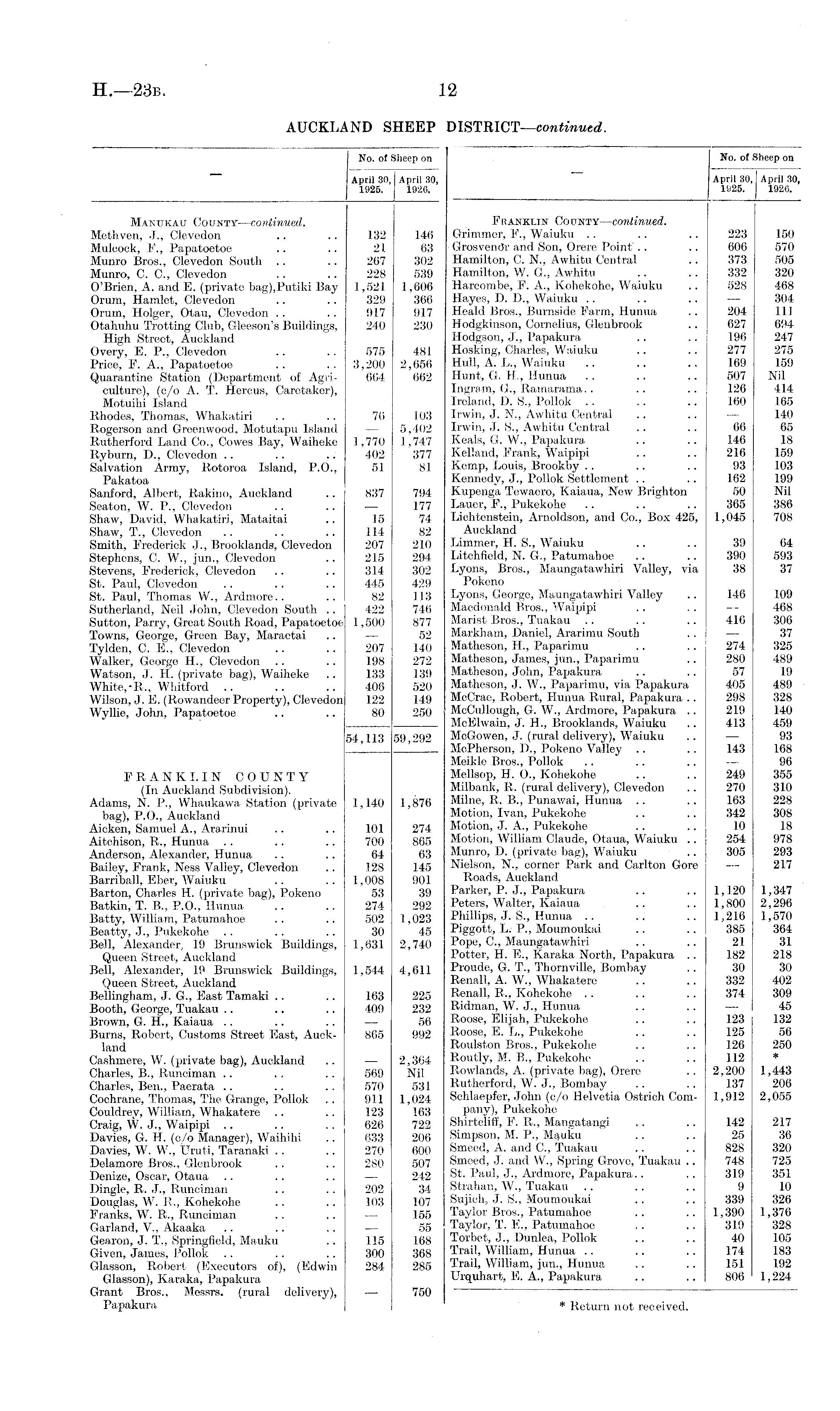 No. of Sheep on April 30, April 30, 1925. 1926. Franklin County—continued. Grimmer, F., Waiuku . . .. .. 223 150 Grosventfr and Son, Orere Point .. .. 606 570 Hamilton, C. N.. Awhitu Central .. 373 505 Hamilton, W. G., Awhitu .. .. 332 320 Harcombe, F. A., Kohekohe, Waiuku .. 528 468 Hayes, I). D., Waiuku .. .. .. — 304 Heald Bros., Burnside Farm, Hunua .. 204 111 Hodgkinson, Cornelius, Glenbrook .. 627 694 Hodgson, J., Papakura .. .. 196 247 Hosking, Charles, Waiuku .. .. 277 275 Hull, A. L., Waiuku .. .. .. 169 159 Hunt, G. H., Hunua .. .. .. 507 Nil Ingram, G., Ramarama.. .. .. 126 414 Ireland, 1). 8., Pollok .. .. .. 160 165 Irwin, J. N"., Awhitu Central .. .. — 140 Irwin, J. S., Awhitu Central .. .. 66 65 Keals, G. W., Papakura .. .. 146 18 Kelland, Frank, Waipipi .. .. 216 159 Kemp, Louis, Brookby .. .. .. 93 103 Kennedy, J., Pollok Settlement .. .. 162 199 Kupenga Tewaero, Kaiaua, New Brighton 50 Nil Lauer, F., Pukekohe .. .. .. 365 386 Lichtenstein, Arnoldson, and Co., Box 425, 1,045 708 Auckland limmer, H. S., Waiuku .. .. 39 64 Litchfield, N. G., Patumahoe .. .. 390 593 Lyons, Bros., Maungatawhiri Valley, via 38 37 Pokeno Lyons, George, Maungatawhiri Valley .. 146 109 Macdonald Bros., Waipipi .. .. — 468 Marist Bros., Tuakau .. .. .. 416 306 Markham, Daniel, Ararimu South .. j — 37 Matheson, H., Paparimu .. .. 274 325 Matheson, James, jun., Paparimu. .. 280 489 Matheson, John, Papakura .. .. 57 19 Matheson, J. W., Paparimu, via Papakura 405 489 McCrae, Robert, Hunua Rural, Papakura .. 298 328 McCullough, G. W., Ardmore, Papakura .. 219 140 McElwain, J. H., Brooklands, Waiuku .. 413 459 McGowen, J. (rural delivery), Waiuku .. — 93 McPherson, D., Pokeno Valley .. .. 143 168 Meikle Bros., Pollok .. .. .. — 96 Mellsop, H. 0., Kohekohe .. . . 249 355 Milbank, R. (rural delivery), Clevedon .. 270 310 Milne, R. B., Punawai, Hunua .. .. 163 228 Motion, Ivan, Pukekohe .. .'. 342 308 Motion, J. A., Pukekohe .. .. 10 18 Motion, William Claude, Otaua, Waiuku .. 254 978 Munro, D. (private bag), Waiuku .. 305 293 Nielson, N., corner Park and Carlton Gore — 217 Roads, Auckland Parker, P. J., Papakura .. .. 1,120 1,347 Peters, Walter, Kaiaua .. .. 1,800 2,296 Phillips, J. S., Hunua .. .. .. 1,216 1,570 Piggott, L. P., Moumoukai .. .. 385 364 Pope, C., Maungatawhiri .. .. 21 31 Potter, H. E., Karaka North, Papakura .. 182 218 Proude, G. T., Thornville, Bombay .. 30 30 Renall, A. W., Whakatere .. .. 332 402 Renall, R., Kohekohe .. .. . . 374 309 Ridman, W. J., Hunua .. .. — 45 Roose, Elijah, Pukekohe .. .. 123 132 Roose, E. L., Pukekohe .. .. 125 56 Roulston Bros., Pukekohe .. .. 126 250 Routly, M. B., Pukekohe .. .. 112 * P»owlands, A. (private bag), Orere .. 2,200 1,443 Rutherford, W. J., Bombay .. .. 137 206 Schlaepfer, John (c/o Helvetia Ostrich Com- 1,912 2,055 pany), Pukekohe Shirtcliff, F. R., Mangatangi .. .. 142 217 Simpson, M. P., Mauku .. .. 25 36 Smeed, A. and C., Tuakau .. .. 828 320 Smeed, J. and W., Spring Grove, Tuakau .. 748 725 St. Paul, J., Ardmore, Papakura.. .. 319 351 Strahan, W., Tuakau .. .. .. 9 10 Sujich, J. S., Moumoukai .. .. 339 326 Taylor Bros., Patumahoe .. .. 1,390 1,376 Taylor, T. E., Patumahoe .. .. 319 328 Torbet, J., Hunlea, Pollok .. .. 40 105 Trail, William, Hunua .. .. .. 174 183 Trail, William, jun., Hunua .. .. 151 192 Urquhart, E. A., Papakura .. .. 806 1,224 * Return not received.