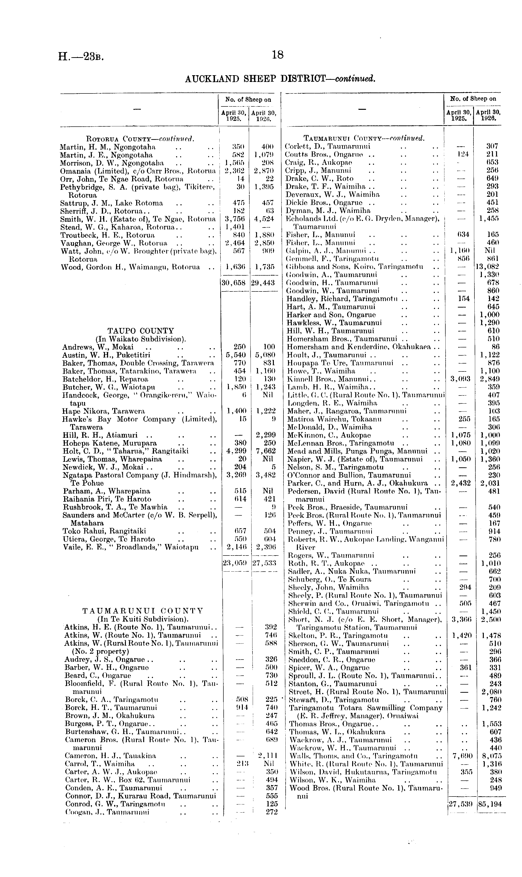No. of Sheep on April 30, April 30, 1925. 1926. Rotorua County—continued. Martin, H. M., Ngongotaha .. .. 350 400 Martin, J. E., Ngongotaha .. .. 582 1,079 Morrison, D. W., Ngongotaha .. .. 1,565 208 Omanaia (Limited), c/o Carr Bros., Rotorua 2,362 2,870 Orr, John, Te Ngae Road, Rotorua .. 14 22 Pethybridge, S. A. (private bag), Tikitere, j 30 1,395 Rotorua Sattrup, J. M., Lake Rotoma .. .. 475 457 Sherriff, J. D., Rotorua.. .. .. 182 63 Smith, W. H. (Estate of), Te Ngae, Rotorua 3,756 4,524 Stead, W. G., Kaharoa, Rotorua.. .. 1,401 — Troutbeek, H. E., Rotorua .. .. 840 1,880 Vaughan, George W., Rotorua .. .. 2,464 2,860 Watt, John, e/oW. Broughter (private bag), 567 909 Rotorua Wood, Gordon H., Waimangu, Rotorua .. 1,636 1,735 30,658 29,443 TAUPO COUNTY (In Waikato Subdivision). Andrews, W., Mokai .. .. .. 250 100 Austin, W. H., Puketitiri .. .. 5,540 5,080 Baker, Thomas, Double Crossing, Tarawera 770 831 Baker, Thomas, Tatarakino, Tarawera .. 454 1,160 Batcheldor, H., Reparoa .. .. 120 130 Butcher, W. G., Waiotapu .. .. 1,850 1,243 Ilandcoek, George, " Orangikereru," Waio- 6 Nil tapu Hape Nikora, Tarawera .. .. 1,400 1,222 Hawke's Bay Motor Company (Limited), 15 9 Tarawera Hill, R. H., Atiamuri .. .. .. — 2,299 Hohepa Katene, Murupara .. .. 380 250 Holt, C. D., " Taharua," Rangitaiki .. 4,299 7,662 Lewis, Thomas, Wharepaina .. .. 20 Nil Newdick, W. J., Mokai .. .. .. 204 5 Ngatapa Pastoral Company (J. Hindmarsh), 3,269 3,482 Te Pohue Parham, A., Wharepaina .. .. 515 Nil Raihania Piri, Te Haroto .. .. 614 421 Rushbrook, T. A., Te Mawhia .. .. — 9 Saunders and McCarter (c/o W. B. Serpell), — 126 Matahara Toko Rahui, Rangitaiki .. .. 657 504 TJtiera, George, Te Haroto .. .. 550 604 Vaile, E. E., " Broadlands," Waiotapu .. 2,146 2,396 23,059 27,533 TAUMARUNUICOUNTY (In Te Kuiti Subdivision). Atkins, H. E. (Route No. 1), Taumarunui.. — 392 Atkins, W. (Route No. 1), Taumarunui .. — 746 Atkins, W. (RuralRouteNo. 1), Taumarunui — 588 (No. 2 property) Audrey, J. S., Ongarue .. .. .. — 326 Barber, W. H., Ongarue .. .. — 500 Beard, C., Ongarue .. .. .. — 730 Bloomfield, !■'. (Rural Route No. 1), Tau- — 512 marunui Borck, C. A., Taringamotu .. .. 508 225 Borck, H. T., Taumarunui .. .. 914 740 Brown, J. M., Okahukura .. .. — 247 Burgess, P. T., Ongarue.. .. .. — 465 Burtenshaw, G. H., Taumarunui.. .. — 642 Cameron Bros. (Rural Route No. 1), Tau- — 689 marunui Cameron, H. J., Tauakina .. .. — 2,111 Carrol, T., Waimiha .. .. .. 213 Nil Carter, A. W. J., Aukopae .. .. - 350 Carter, R. W., Box 62, Taumarunui .. — 494 Conden, A. E., Taumarunui .. .. — 357 Connor, D. J., Kurarau Road, Taumarunui — 555 Conrod, G. W., Taringamotu .. .. - ; 125 Coogan, J., Taumarunui ,. .. — ! 272