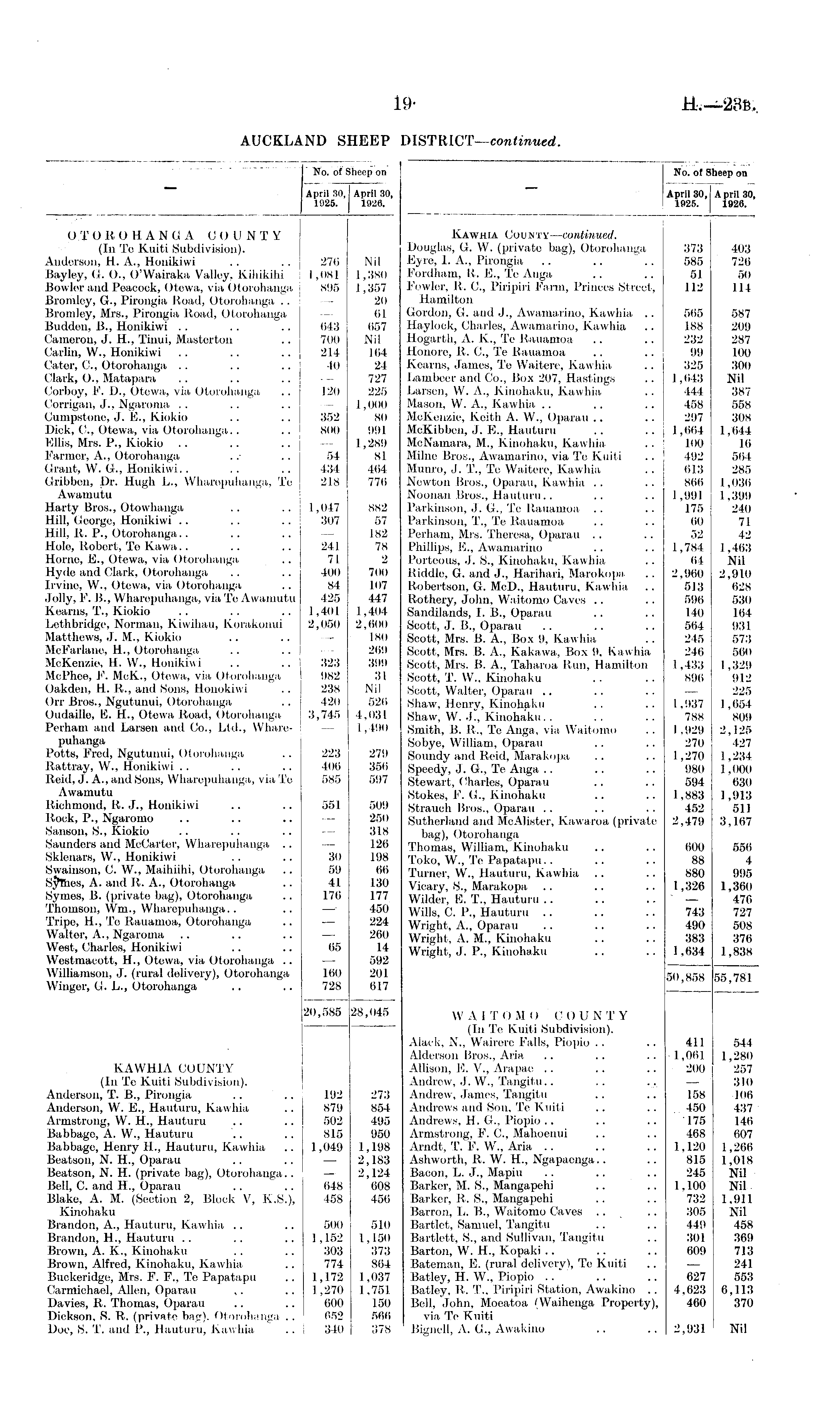 No. of Sheep on April 30, April 30, 1925. 1926. U TOROHANGA COUNTY (In To Kuiti Subdivision). Anderson, H. A., Honikiwi .. .. 27(3 Nil Bayley, G. O., O'Wairaka Valley, Kihikihi 1,081 1,380 Bowler and Peacock, Otewa, via Otorohanga 895 1,357 Bromley, G., Pirongia Road, Otorohanga .. — 20 Bromley, Mrs., Pirongia Road, Otorohanga — 61 ( Budden, B., Honikiwi . . .. .. (543 657 Cameron, J. H., Tinui, Masterton .. 700 Nil Carlin, W., Honikiwi .. .. .. 214 164 Cater, C., Otorohanga .. .. .. 40 24 Clark, O., Matapara .. .. .. — 727 Corboy, F. D., Otewa, via Otorohanga .. 120 225 Corrigan, J., Ngaroma .. .. .. 1,000 Cumpstone, J. E., Kiokio .. .. 352 80 Dick, C., Otewa, via Otorohanga.. .. 800 991 Ellis, Mrs. P., Kiokio .. .. .. 1,289 Farmer, A., Otorohanga . .• .. 54 81 Grant, W. G., Honikiwi.. .. .. 434 464 Gribben, -Dr. Hugh L., Wharepuhauga, To 218 776 Awamutu Harty Bros., Otowhanga .. .. 1,047 882 Hill, George, Honikiwi .. .. .. 307 57 Hill, R. P., Otorohanga.. .. .. — 182 Hole, Robert, Te Kawa.. .. .. 241 78 Home, E., Otewa, via Otorohanga .. 71 2 Hyde and Clark, Otorohanga .. .. 400 700 Irvine, W., Otewa, via Otorohanga .. 84 107 Jolly, F. B., Wharepuhauga, via Te Awamutu 425 447 Kearns, T., Kiokio .. .. .. 1,401 1,404 Lethbridge, Norman, Kiwihau, Korakonui 2,050 2,600 Matthews, J. M., Kiokio .. .. 180 McFarlane, H., Otorohanga .. .. ! 269 McKenzie, H. W., Honikiwi .. .. 323 399 McPhee, F. McK., Otewa, via Otorohanga 982 31 Oakden, H. R., and Hons, Honokiwi .. 238 Nil Orr Bros., Ngutunui, Otorohanga .. 420 526 Oudaille, F. H., Otewa Road, Otorohanga 3,745 4,031 Perham and Larsen and Co., Ltd., VVhare- — 1,490 puhanga Potts, Fred, Ngutunui, Otorohanga .. 223 279 Rattray, W., Honikiwi .. .. .. 406 356 Reid, J. A., and Sons, Wharepuhauga, via Te 585 597 Awamutu Richmond, R. J., Honikiwi .. .. 551 509 Rock, P., Ngaromo .. .. .. — 250 Sanson, S., Kiokio . . .. .. — 318 ►Saunders and McCarter, Wharepuhauga .. — 126 Sklenars, W., Honikiwi . . .. 30 198 Swainson, C. W., Maihiihi, Otorohanga .. 59 66 Sjfthes, A. and II. A., Otorohanga .. 41 130 Symes, B. (private bag), Otorohanga .. 176 177 Thomson, Wm., Wharepuhanga.. .. —• 450 Tripe, H., Te Rauamoa, Otorohanga .. — 224 Walter, A., Ngaroma .. .. .. — 260 West, Charles, Honikiwi .. .. 65 14 Westmacott, H., Otewa, via Otorohanga .. — 592 Williamson, J. (rural delivery), Otorohanga 160 201 Winger, G. L., Otorohanga .. .. 728 617 20,585 28,045 KAWHIA COUNTY (In Te Kuiti Subdivision). Anderson, T. B., Pirongia .. .. 192 273 Anderson, W. E., Hauturu, Kawhia .. 879 854 Armstrong, W. H., Hauturu .. .. 502 495 Babbage, A. W., Hauturu .. .. 815 950 Babbage, Henry H., Hauturu, Kawhia .. 1,049 1,198 Beatson, N. H., Oparau .. .. — 2,183 Beatson, N. H. (private bag), Otorohanga.. — 2,124 Bell, C. and H., Oparau .. .. 648 608 Blake, A. M. (Section 2, Block V, K.S.), 458 456 Kinohaku Brandon, A., Hauturu, Kawhia .. .. 500 510 Brandon, H., Hauturu .. .. .. 1,152 1,150 Brown, A. K., Kinohaku .. .. 303 373 Brown, Alfred, Kinohaku, Kawhia .. 774 864 Buckeridge, Mrs. F. F., Te Papatapu .. 1,172 1,037 Carmichael, Allen, Oparau .. 1,270 1,751 Da vies, R. Thomas, Oparau .. .. 600 150 Dickson, S. R. (private bag), Otorohanga .. 652 566 Doe, S. T. and P., Hauturu, Kawhia .. 340 ' 378