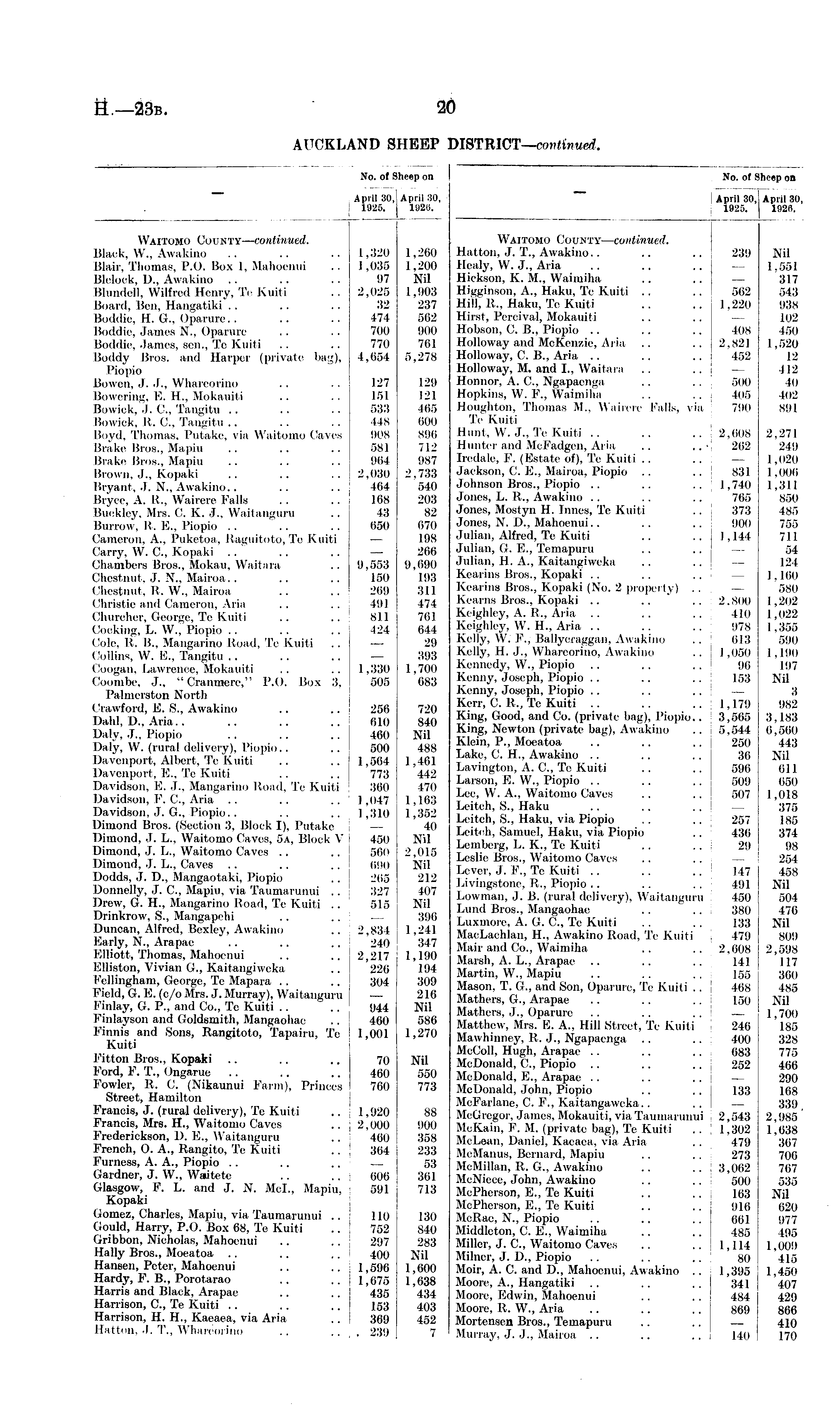 No. of Sheep on ! April 30, April 30, 1925. 1926. Waitomo County—continued. Hatton, J. T., Awakino.. .. .. 239 Nil Healy, W. J., Aria .. .. .. — 1,551 Hickson, K. M., Waimiha .. .. — 317 Higginson, A., Haku, To Kuiti .. .. 562 543 Hill, R., Haku, Te Kuiti .. .. 1,220 038 Hirst, Percival, Mokauiti .. .. — 102 Hobson, C. B., Piopio .. .. .. 408 450 Holloway and McKenzie, Aria .. .. 2,821 1,520 Holloway, C. B., Aria .. .. .. 452 12 Holloway, M. and I., Waitara .. .. — 412 Honnor, A. C., Ngapaenga .. .. 500 40 Hopkins, W. F., Waimiha .. .. 405 402 Houghton, Thomas M., Wairere Falls, via 790 891 Te Kuiti Hunt, W. J., Te Kuiti .. .. .. 2,608 2,271 Hunter and McFadgen, Aria .. .. • 262 249 Iredale, F. (Estate of), Te Kuiti .. .. — 1,020 Jackson, C. E., Mairoa, Piopio .. .. 831 1,006 Johnson Bros., Piopio .. .. .. 1,740 1,311 Jones, L. R., Awakino .. .. .. 765 850 Jones, Mostyn H. Innes, Te Kuiti .. 373 485 Jones, N. D., Mahoenui.. .. .. 900 755 Julian, Alfred, Te Kuiti .. .. 1,144 711 Julian, G. E., Temapuru .. .. — 54 Julian, H. A., Kaitangiweka .. .. — 124 Kearins Bros., Kopaki .. . . .. — ], 160 Kearins Bros., Kopaki (No. 2 property) .. — 580 Kearns Bros., Kopaki .. .. .. 2,800 1,202 Keighley, A. R., Aria .. .. .. 410 1,022 Keighley, W. H., Aria .. .. .. 978 1,355 Kelly, W. F., Ballycraggan, Awakino .. 613 590 Kelly, H. J., Whareorino, Awakino .. 1,050 1,190 Kennedy, W., Piopio .. .. .. 96 197 Kenny, Joseph, Piopio .. .. .. 153 Nil Kenny, Joseph, Piopio .. .. .. — 3 Kerr, C. R., Te Kuiti .. .. 1,179 982 King, Good, and Co. (private bag), Piopio.. 3,565 3,183 King, Newton (private bag), Awakino .. 5,544 6,560 Klein, P., Moeatoa .. .. .. 250 443 Lake, C. H., Awakino .. .. .. 36 Nil Lavington, A. C., Te Kuiti .. .. 596 611 Larson, E. W., Piopio .. .. .. 509 650 Lee, W. A., Waitomo Caves .. .. 507 1,018 Leitch, S., Haku .. .. .. — 375 Leiteh, S., Haku, via Piopio . . .. 257 185 Leiteh, Samuel, Haku, via Piopio .. 436 374 Lemberg, L. K., Te Kuiti .. .. 29 98 Leslie Bros., Waitomo Caves .. .. — 254 Lever, J. F., Te Kuiti .. .. .. 147 458 Livingstone, R., Piopio .. .. . . 491 Nil Lowman, J. B. (rural delivery), Waitanguru 450 504 Lund Bros., Mangaohae .. .. 380 476 Luxmore, A. G. C., Te Kuiti .. .. 133 Nil MacLachlan, H., Awakino Road, Te Kuiti 479 809 Mair and Co., Waimiha .. .. 2,608 2,598 Marsh, A. L., Arapae .. .. .. 141 117 Martin, W., Mapiu .. .. .. 155 360 Mason, T. G., and Son, Oparure, Te Kuiti .. 468 485 Mathers, G., Arapae .. .. .. 150 Nil Mathers, J., Oparure .. .. .. — 1,700 Matthew, Mrs. E. A., Hill Street, Te Kuiti 246 185 Mawhinney, R. J., Ngapaenga .. .. 400 328 McColl, Hugh, Arapae .. .. .. 683 775 McDonald, C., Piopio .. .. .. 252 466 McDonald, E., Arapae .. .. .. — 290 McDonald, John, Piopio .. . . 133 168 McFarlane, C. F., Kaitangaweka.. .. — 339 McGregor, James, Mokauiti, via Taumarunui 2,543 2,985 McKain, F. M. (private bag), Te Kuiti .. 1,302 1,638 McLean, Daniel, Kaeaca, via Aria .. 479 367 McManus, Bernard, Mapiu .. .. 273 706 McMillan, R. G., Awakino .. .. 3,062 767 McNiece, John, Awakino .. .. 500 535 McPherson, E., Te Kuiti .. .. 163 Nil McPherson, E., Te Kuiti .. .. 916 620 McRae, N., Piopio .. .. .. 661 977 Middleton, C. E., Waimiha .. .. 485 495 Miller, J. C., Waitomo Caves .. .. 1,114 1,009 Milner, J. D., Piopio .. .. .. 80 415 Moir, A. C. and D., Mahoenui, Awakino .. 1,395 1,450 Moore, A., Hangatiki .. .. .. 341 407 Moore, Edwin, Mahoenui .. .. 484 429 Moore, R. W., Aria .. .. .. 869 866 Mortensen Bros., Temapuru .. .. — 410 Murray, J. J., Mairoa .. .. .. 140 170