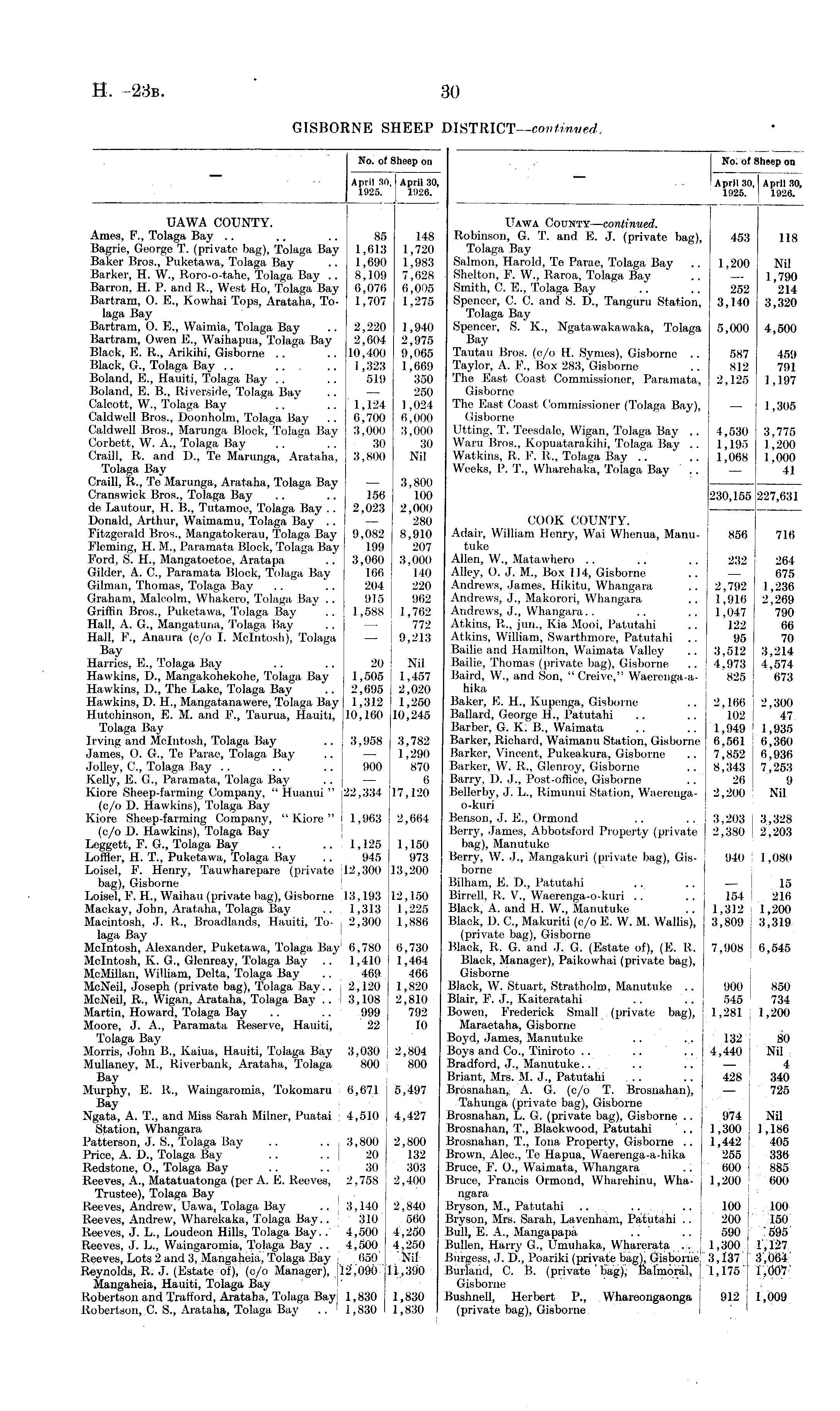 No. of Sheep on April 30, April 30, 1925. 1026. UAWA COUNTY. Ames, F., Tolaga Bay .. .. .. 85 148 Bagrie, George T. (private bag), Tolaga Bay 1,613 1,720 Baker Bros., Puketawa, Tolaga Bay .. 1,690 1,983 Barker, H. W., Roro-o-tahe, Tolaga Bay .. 8,109 7,628 Barron, H. P. and R., West Ho, Tolaga Bay 6,076 6,005 Bartram, 0. E., Kowhai Tops, Arataha, To- 1,707 1,275 laga Bay Bartram, O. E., Waimia, Tolaga Bay .. 2,220 ],940 Bartram, Owen E., Waihapua, Tolaga Bay 2,604 2,975 Black, E. R., Arikihi, Gisborne .. .. 10,400 9,065 Black, G., Tolaga Bay .. 1,323 1,669 Boland, E., Hauiti, Tolaga Bay .. .. 519 350 Boland, E. B., Riverside, Tolaga Bay .. — 250 Calcott, W., Tolaga Bay .. .. 1,124 1,024 Caldwell Bros., Doonholm, Tolaga Bay .. 6,700 6,000 Caldwell Bros., Marunga Block, Tolaga Bay 3,000 3,000 Corbett, W. A., Tolaga Bay .. 30 30 Craill, R. and D., Te Marunga, Arataha, 3,800 Nil Tolaga Bay Craill, R., Te Marunga, Arataha, Tolaga Bay — 3,800 Cranswick Bros., Tolaga Bay .. .. 156 100 de Lautour, H. B., Tutamoe, Tolaga Bay . . 2,023 2,000 Donald, Arthur, Waimamu, Tolaga Bay .. — 280 Fitzgerald Bros., Mangatokerau, Tolaga Bay 9,082 8,910 Fleming, H. M., Paramata Block, Tolaga Bay 199 207 Ford, S. H., Mangatoetoe, Aratapa .. 3,060 3,000 Gilder, A. C., Paramata Block, Tolaga Bay 166 140 Gilman, Thomas, Tolaga Bay .. .. 204 220 Graham, Malcolm, Whakero, Tolaga Bay .. 915 962 Griffin Bros., Puketawa, Tolaga Bay .. 1,588 1,762 Hall, A. G., Mangatuna, Tolaga Bay .. — 772 Hall, F., Anaura (c/o I. Mcintosh), Tolaga — 9,213 Bay Harries, E., Tolaga Bay .. .. 20 Nil Hawkins, D., Mangakohekohe, Tolaga Bay 1,505 1,457 Hawkins, D., The Lake, Tolaga Bay .. [ 2,695 2,020 Hawkins, I). H., Mangatanawere, Tolaga Bay 1,312 1,250 Hutchinson, E. M. and F., Taurua, Hauiti, 10,160 10,245 Tolaga Bay Irving and Mcintosh, Tolaga Bay .. j 3,958 3,782 James, O. G., Te Parae, Tolaga Bay .. — 1,290 Jolley, C., Tolaga Bay .. .. .. 900 870 Kelly, E. G., Paramata, Tolaga Bay .. — 6 Kiore Sheep-farming Company, " Huanui " 22,334 17,120 (c/o D. Hawkins), Tolaga Bay Kiore Sheep-farming Company, "Kiore" I 1,963 2,664 (c/o D. Hawkins), Tolaga Bay Leggett, F. G., Tolaga Bay . . .. i 1,125 1,150 Loffler, H. T., Puketawa, Tolaga Bay .. 945 973 Loisel, F. Henry, Tauwharepare (private 112,300 13,200 bag), Gisborne Loisel, F. H., Waihau (private bag), Gisborne i 13,193 12,150 Mackay, John, Arataha, Tolaga Bay .. j 1,313 1,225 Macintosh, J. R., Broadlands, Hauiti, To- j 2,300 1,886 laga Bay Mcintosh, Alexander, Puketawa, Tolaga Bay' 6,780 6,730 Mcintosh, K. G., Glenreay, Tolaga Bay .. 1,410 1,464 McMillan, William, Delta, Tolaga Bay .. 469 466 McNeil, Joseph (private bag), Tolaga Bay.. , 2,120 1,820 McNeil, R., Wigan, Arataha, Tolaga Bay .. j 3,108 2,810 Martin, Howard, Tolaga Bay .. .. 999 792 Moore, J. A., Paramata Reserve, Hauiti, 22 10 Tolaga Bay Morris, John B., Kaiua, Hauiti, Tolaga Bay 3,030 2,804 Mullaney, M., Riverbank, Arataha, Tolaga j 800 800 Bay Murphy, E. R., Waingaromia, Tokomaru ; 6,671 5,497 Bay Ngata, A. T., and Miss Sarah Milner, Puatai j 4,510 4,427 Station, Whangara Patterson, J. S., Tolaga Bay .. .. 1 3,800 2,800 Price, A. D., Tolaga Bay .. .. j 20 132 Redstone, O., Tolaga Bay .. .. j 30 303 Reeves, A., Matatuatonga (per A. E. Reeves, I 2,758 2,400 Trustee), Tolaga Bay j Reeves, Andrew, Uawa, Tolaga Bay .. j 3,140 2,840 Reeves, Andrew, Wharekaka, Tolaga Bay. . 310 560 Reeves, J. L., Loudeon Hills, Tolaga Bay.. 4,500 4,250 Reeves, J. L., Waingaromia, Tolaga Bay .. 4,500 4,250 Reeves, Lots 2 and 3, Mangaheia, Tolaga Bay ...650 Nil Reynolds, R. J. (Estate of), (c/o Manager), 12,090 11,390 Mangaheia, Hauiti, Tolaga Bay Robertson and Trafford, Arataha, Tolaga Bay 1,830 1,830 Robertson, C. S., Arataha, Tolaga Bay .. 1,830 1,830