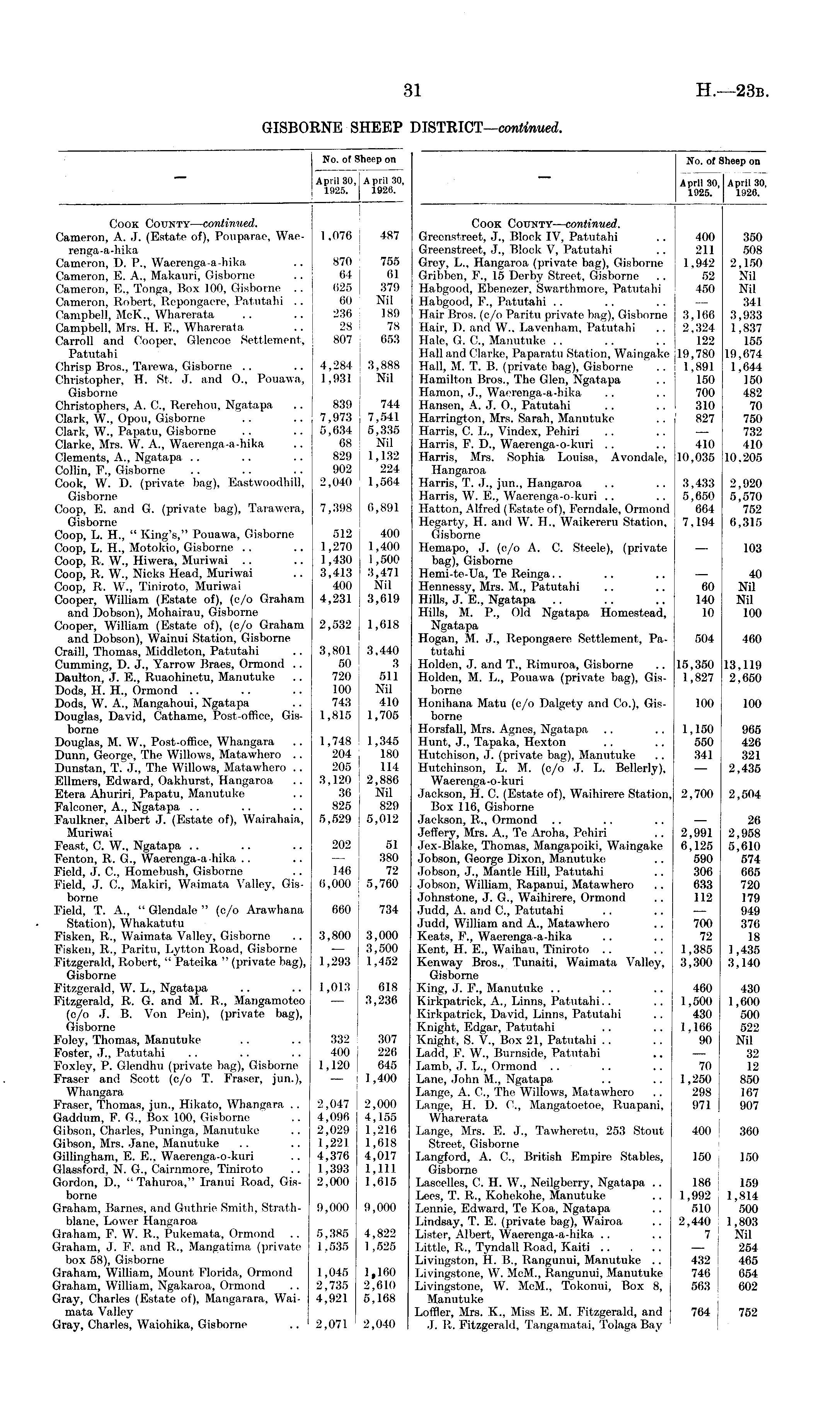 No. of Sheep on April 30, April 30, 1925. 1926. Cook County—continued. Greenstreet, J., Block IV, Patutahi .. 400 350 Greenstreet, J., Block V, Patutahi .. 211 508 Grey, L., Hangaroa (private bag), Gisborne 1,942 2,150 Gribben, F., 15 Derby Street, Gisborne .. 52 Nil Habgood, Ebenezer, Swarthmore, Patutahi 450 Nil Habgood, P., Patutahi .. .. .. — 341 Hair Bros, (o/o Paritu private bag), Gisborne 3,166 3,933 Hair, I>. and W., Lavenham, Patutahi .. 2,324 1,837 Hale, G. C., Manutuke .. .. .. 122 155 Hall and Clarke, Paparatu Station, Waingake 19,780 19,674 Hall, M. T. B. (private bag), Gisborne .. 1,891 1,644 Hamilton Bros., The Glen, Ngatapa .. 150 150 Hamon, J., Waerenga-a-hika .. .. 700 482 Hansen, A. J. O., Patutahi .. .. 310 70 Harrington, Mrs. Sarah, Manutuke .. 827 750 Harris, C. L., Vindex, Pehiri .. .. — 732 Harris, F. D., Waerenga-o-kuri .. .. 410 410 Harris, Mrs. Sophia Louisa, Avondale, 10,035 10,205 Hangaroa Harris, T. J., jun., Hangaroa .. .. 3,433 2,920 Harris, W. E., Waerenga-o-kuri .. .. 5,650 5,570 Hatton, Alfred (Estate of), Ferndale, Ormond 664 752 Hegarty, H. and W. H., Waikereru Station, 7,194 6,315 Gisborne Hemapo, J. (c/o A. C. Steele), (private — 103 bag), Gisborne Hemi-te-Ua, Te Reinga.. .. .. — 40 Hennessy, Mrs. M., Patutahi .. .. 60 Nil Hills, J. E., Ngatapa .. .. .. 140 Nil Hills, M. P., Old Ngatapa Homestead, 10 100 Ngatapa Hogan, M. J., Repongaere Settlement, Pa- 504 460 tutahi Holden, J. and T., Rimuroa, Gisborne .. 15,350 13,119 Holden, M. L., Pouawa (private bag), Gis- 1,827 2,650 borne Honihana Matu (c/o Dalgety and Co.), Gis- 100 100 borne Horsfall, Mrs. Agnes, Ngatapa .. .. 1,150 965 Hunt, J., Tapaka, Hexton .. .. 550 426 Hutchison, J. (private bag), Manutuke .. 341 321 Hutchinson, L. M. (o/o J. L. Bellerly), — 2,435 Waerenga-o-kuri Jackson, H. C. (Estate of), Waihirere Station, 2,700 2,504 Box 116, Gisborne Jackson, R., Ormond .. .. ., — 26 Jeffery, Mrs. A., Te Aroha, Pehiri .. 2,991 2,958 Jex-Blake, Thomas, Mangapoiki, Waingake 6,125 5,610 Jobson, George Dixon, Manutuke .. 590 574 Jobson, J., Mantle Hill, Patutahi .. 306 665 Jobson, William, Rapanui, Matawhero .. 633 720 Johnstone, J. G., Waihirere, Ormond .. 112 179 Judd, A. and C., Patutahi .. .. — 949 Judd, William and A., Matawhero .. 700 376 Keats, F., Waerenga-a-hika .. .. 72 18 Kent, H. E., Waihau, Tiniroto .. 1,385 1,435 Kenway Bros., Tunaiti, Waimata Valley, 3,300 3,140 Gisborne King, J. F., Manutuke .. .. .. 460 430 Kirkpatrick, A., Linns, Patutahi.. .. 1,500 1,600 Kirkpatrick, David, Linns, Patutahi .. 430 500 Knight, Edgar, Patutahi .. .. 1,166 522 Knight, S. V., Box 21, Patutahi .. .. 90 Nil Ladd, F. W., Burnside, Patutahi .. — 32 Lamb, J. L., Ormond .. .. .. 70 12 Lane, John M., Ngatapa .. .. 1,250 850 Lange, A. C., The Willows, Matawhero .. 298 167 Lange, H. D. C., Mangatoetoe, Ruapani, 971 907 Wharerata Lange, Mrs. E. J., Tawheretu, 253 Stout 400 j 360 Street, Gisborne Langford, A. C., British Empire Stables, 150 , 150 Gisborne Lascelles, C. H. W., Neilgberry, Ngatapa .. 186 | 159 Lees, T. R., Kohekohe, Manutuke .. 1,992 1,814 Lennie, Edward, Te Koa, Ngatapa .. 510 | 500 Lindsay, T. E. (private bag), Wairoa .. 2,440 j 1,803 Lister, Albert, Waerenga-a-hika .. .. 7 Nil Little, R., Tyndall Road, Kaiti — | 254 Livingston, H. B., Rangunui, Manutuke .. 432 1 465 Livingstone, W. McM., Rangunui, Manutuke 746 j 654 Livingstone, W. McM., Tokonui, Box 8, 563 602 Manutuke Loflfler, Mrs. K., Miss E. M. Fitzgerald, and 764 I 752 J. R. Fitzgerald, Tangamatai, Tolaga Bay