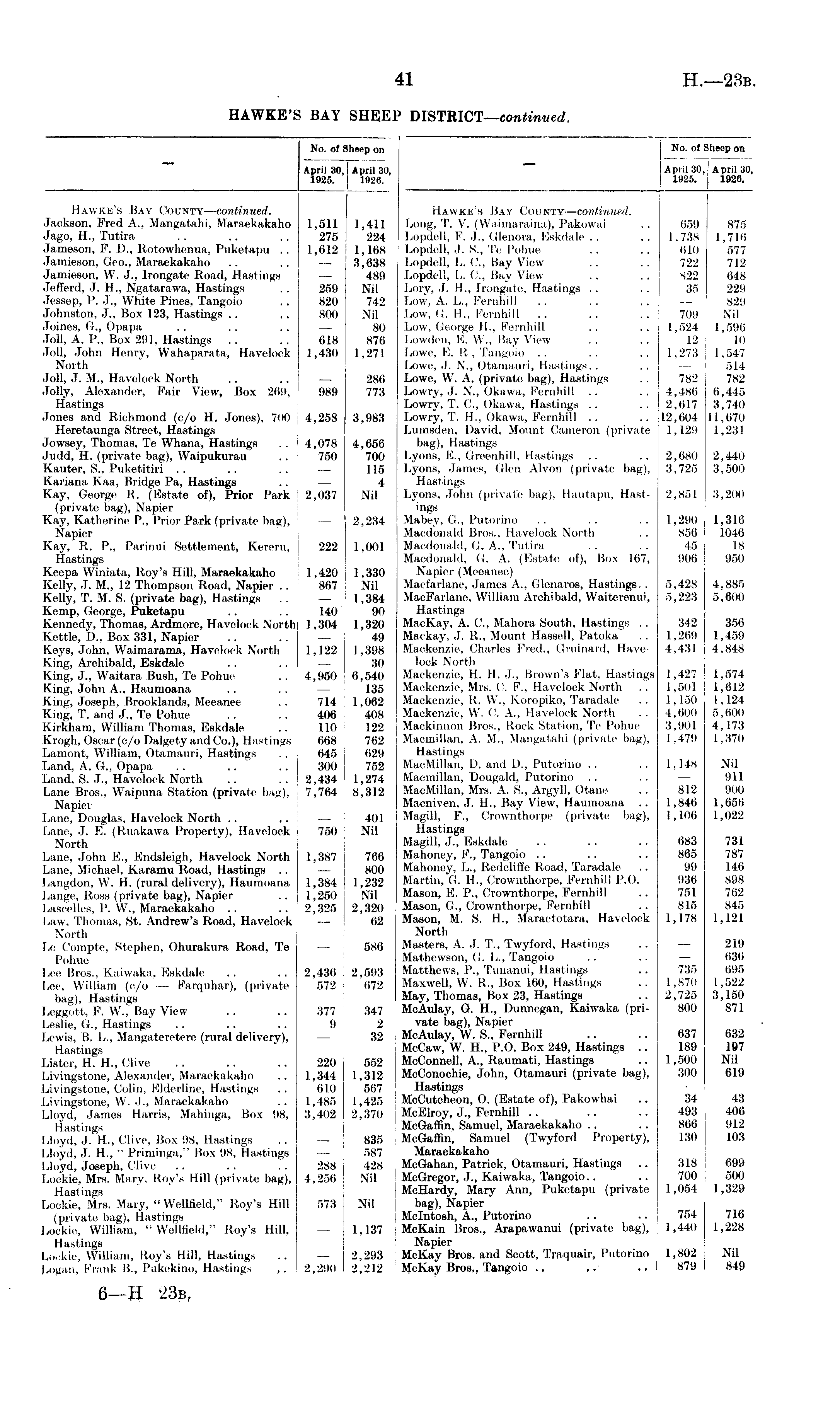 No. of Sheep on April 30, April 30, | 1925. 1926. Hawke's Bay County—continued. Long, T. V. (Waimaraina), Pakowai .. 659 875 Lopdell, F. J., Glenora, Eskdale .. .. 1.738 1,716 Lopdell, J. S., Te Pohue .. .. 610 577 Lopdell, L. C., Bay View .. .. 722 712 Lopdell, L. C., Bay View .. .. 822 648 Lory, J. H., Irongate, Hastings .. .. 35 229 Low, A. L., Fernhill .. .. .. — 829 Low, G. H., Fernhill .. .. .. 709 Nil Low, George H., .Fernhill .. .. 1,524 1,596 Lowden, E. W., Bay View .. .. 12 10 Lowe, E. R , Tangoio .. .. .. 1,273 1,547 Lowe, J. N., Otamauri, Hastings.. .. — 514 Lowe, W. A. (private bag), Hastings .. 782 782 Lowry, J. N., Okawa, Fernhill .. .. 4,486 6,445 Lowry, T. C., Okawa, Hastings .. .. 2,617 3,740 Lowry, T. IL, Okawa, Fernhill .. .. 12,604 11,670 Lumsden, David, Mount Cameron (private 1,129 1,231 bag), Hastings Lyons, E., Greenhill, Hastings .. .. 2,680 2,440 Lyons, James, Glen Alvon (private bag), 3,725 3,500 Hastings Lyons, John (private bag), Hautapu, Hast- 2,851 3,200 ings Mabey, G., Putorino .. .. .. 1,290 1,316 Macdonald Bros., Havelock North .. 856 1046 Macdonald, G. A., Tutira .. .. 45 18 Macdonald, G. A. (Estate of), Box 167, 906 950 Napier (Meeanee) Macfarlane, James A., Glenaros, Hastings. . 5,428 4,885 MacFarlane, William Archibald, Waiterenui, 5,223 5,600 Hastings MaeKay, A. C., Mahora South, Hastings .. 342 356 Mackay, J. R., Mount Hassell, Patoka .. 1,269 1,459 Mackenzie, Charles Fred., Gruinard, Have- 4,431 | 4,848 lock North Mackenzie, H. H. J., Brown's Flat, Hastings 1,427 1,574 Mackenzie, Mrs. C. F., Havelock North .. 1,501 1,612 Mackenzie, R. W., Koropiko, Taradale .. 1,150 1,124 Mackenzie, W. C. A., Havelock North .. 4,600 5,600 Mackinnon Bros., Rock Station, Te Pohue 3,901 4,173 Maemillan, A. M., Mangatahi (private bag), 1,479 1,370 Hastings MacMillan, D. and D., Putorino .. .. 1,148 Nil Maemillan, Dougald, Putorino .. .. — 911 MacMillan, Mrs. A. S., Argyll, Otane .. 812 900 Macniven, J. 11., Bay View, Haumoana .. 1,846 1,656 Magill, F., Crownthorpe (private bag), 1,106 1,022 Hastings Magill, J., Eskdale . . .. .. 683 731 Mahoney, F., Tangoio .. .. .. 865 787 Mahoney, L., Redcliffe Road, Taradale .. 99 146 Martin, G. IL, Crownthorpe, Fernhill P.O. 936 898 Mason, E. P., Crownthorpe, Fernhill .. 751 762 Mason, G., Crownthorpe, Fernhill .. 815 845 Mason, M. S. H., Maraetotara, Havelock 1,178 1,121 North Masters, A. J. T., Twyford, Hastings .. — 219 Mathewson, G. L., Tangoio .. .. — 636 Matthews, P., Tunanui, Hastings .. 735 695 Maxwell, W. R., Box 160, Hastings .. 1,870 1,522 May, Thomas, Box 23, Hastings .. 2,725 3,150 McAulav, G. H., Dunnegan, Kaiwaka (pri- 800 871 vate bag), Napier McAulay, W. S„ Fernhill .. .. 637 632 McCaw, W. H., P.O. Box 249, Hastings .. 189 197 McConnell, A., Raumati, Hastings .. 1,500 Nil McConochie, John, Otamauri (private bag), 300 619 Hastings McCutcheon, 0. (Estate of), Pakowhai .. 34 43 McElroy, J., Fernhill .. .. .. 493 406 McGaffin, Samuel, Maraekakaho .. .. 866 912 McGaffin, Samuel (Twyford Property), 130 103 Maraekakaho McGahan, Patrick, Otamauri, Hastings .. 318 699 McGregor, J., Kaiwaka, Tangoio.. .. 700 500 McHardy, Mary Ann, Puketapu (private 1,054 1,329 bag), Napier Mcintosh, A., Putorino .. .. 754 716 McKain Bros., Arapawanui (private bag), 1,440 1,228 Napier McKay Bros, and Scott, Traquair, Putorino 1,802 Nil McKay Bros,, Tangoio .. 879 849