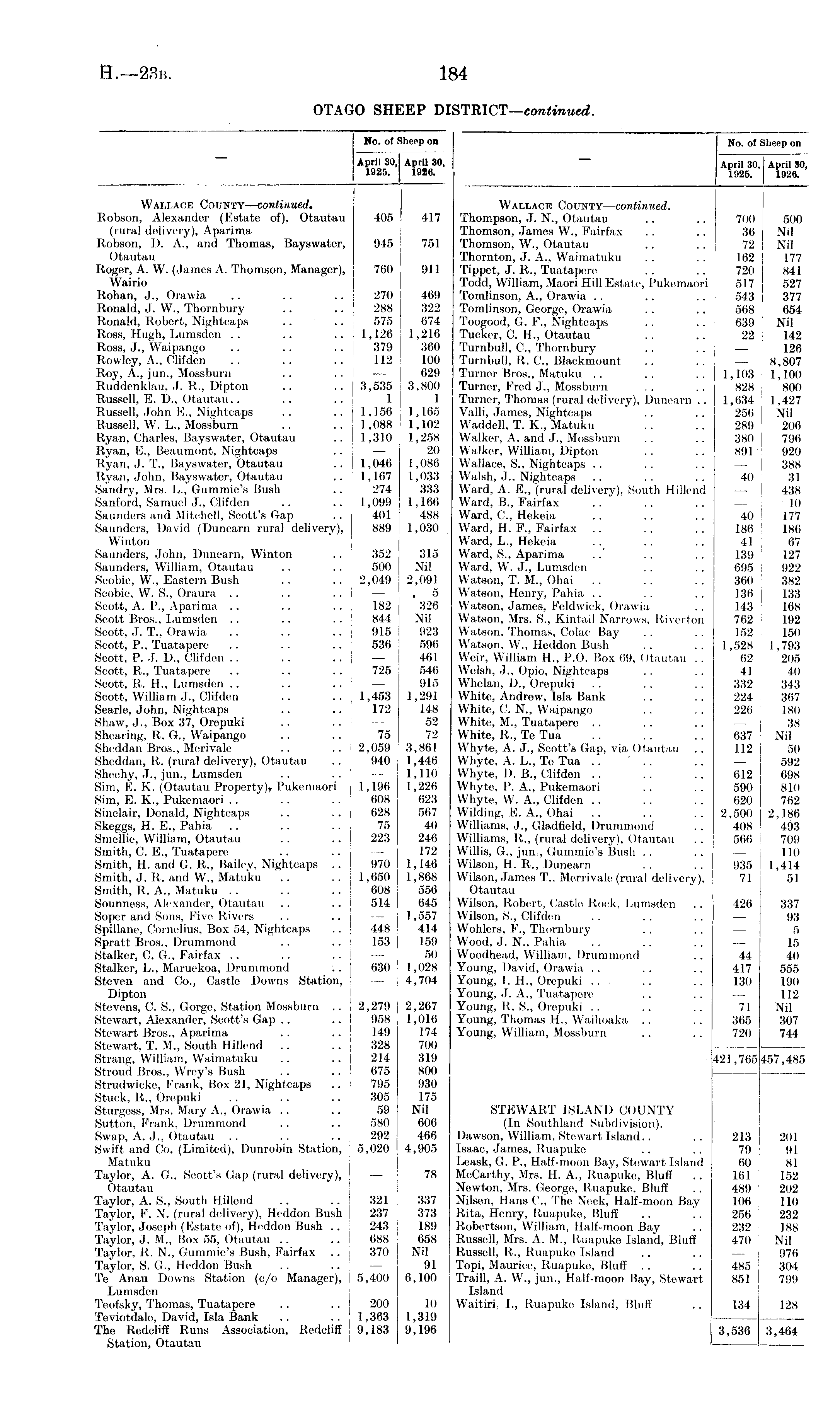 No. of Sheep on April 30, April 30, 1925. 1926. Wallace County—continued, Robson, Alexander (Estate of), Otautau 405 417 (rural delivery), Aparima Robson, I). A., and Thomas, Bays water, 945 751 Otautau Roger, A. W. (James A. Thomson, Manager), 760 . 911 Wairio Rohan, J., Orawia .. .. .. 270 469 Ronald, J. W., Thornbury .. .. 288 322 Ronald, Robert, Nightcaps .. .. 575 674 Ross, Hugh, Lumsden .. .. .. 1,126 1,216 Ross, J., Waipango .. .. .. 379 360 Rowley, A., Clifden .. .. .. 112 100 Roy, A., jun., Mossburn .. .. — 629 Ruddenklau, J. R., Dipton .. .. 3,535 3,800 Russell, E. D., Otautau.. .. .. 1 1 Russell, John E., Nightcaps .. .. 1,156 1,165 Russell, W. L., Mossburn . . .. 1,088 1,102 Ryan, Charles, Bayswater, Otautau .. 1,310 1,258 Ryan, E., Beaumont, Nightcaps .. — 20 Ryan, J. T., Bayswater, Otautau .. 1,046 1,086 Ryan, John, Bayswater, Otautau .. 1,167 1,033 Sandry, Mrs. L., Gummie's Bush .. 274 333 Sanford, Samuel J., Clifden . . . . 1,099 1,166 Saunders and Mitchell, Scott's Gap .. 401 488 Saunders, David (Dunearn rural delivery), 889 1,030 Winton Saunders, John, Dunearn, Winton .. 352 315 j Saunders, William, Otautau . . .. 500 Nil Scobie, W., Eastern Bush .. .. 2,049 2,091 Scobie, W. S., Oraura .. .. ' • • | — .5 Scott, A. P., Aparima .. .. .. j 182 326 Scott Bros., Lumsden .. .. .. 844 Nil Scott, J. T., Orawia .. .. .. 915 923 Scott, P., Tuatapere .. .. .. 536 596 Scott, P. J. D., Clifden .. .. .. j — 461 | Scott, R., Tuatapere .. .. .. 725 546 Scott, R. H., Lumsden .. .. .. — 915 Scott, William J., Clifden .. .. 1,453 1,291 Searle, John, Nightcaps .. .. 172 148 Shaw, J., Box 37, Orepuki . . . . — 52 Shearing, R. G., Waipango .. .. 75 72 Sheddan Bros., Merivale .. .. 2,059 3,861 Sheddan, R. (rural delivery), Otautau .. 940 1,446 Sheehy, J., jun., Lumsden .. .. — 1,110 Sim, E. K. (Otautau Property ) T Pukemaori 1,196 1,226 Sim, E. K., Pukemaori .. .. .. 608 623 Sinclair, Donald, Nightcaps .. .. 628 567 Skeggs, H. E., Pahia .. .. .. 75 40 Smellie, William, Otautau . . .. 223 246 Smith, C. E., Tuatapere .. .. — 172 Smith, H. and G. R., Bailey, Nightcaps .. 970 1,146 Smith, J. R. and W., Matuku .. .. 1,650 | 1,868 Smith, R. A., Matuku .. .. .. 608 j 556 Sounness, Alexander, Otautau .. .. 514 | 645 Soper and Sons, Five Rivers .. .. — j 1,557 Spillane, Cornelius, Box 54, Nightcaps .. 448 j 414 Spratt Bros., Drummond .. .. 153 159 Stalker, C. G., Fairfax .. . . .. — 50 Stalker, L., Maruekoa, Drummond . . 630 1,028 Steven and Co., Castle Downs Station, — 4,704 Dipton Stevens, C. S., Gorge, Station Mossburn .. 2,279 2,267 Stewart, Alexander, Scott's Gap .. .. 958 1,016 Stewart Bros., Aparima . . .. 149 I 174 Stewart, T. M., South Hillend .. .. 328 i 700 Strang, William, Waimatuku .. .. 214 319 Stroud Bros., Wrey's Bush .. .. 675 800 Strudwicke, Frank, Box 21, Nightcaps .. 795 930 Stuck, R., Orepuki .. .. .. 305 175 Sturgess, Mrs. Mary A., Orawia .. .. 59 Nil Sutton, Frank, Drummond .. .. 580 606 Swap, A. J., Otautau .. . . .. 292 466 Swift and Co. (Limited), Dunrobin Station, 5,020 4,905 Matuku Taylor, A. G., Scott's Gap (rural delivery), — 78 Otautau Taylor, A. S., South Hillend .. .. 321 337 Taylor, F. N. (rural delivery), Heddon Bush 237 373 Taylor, Joseph (Estate of), Heddon Bush .. 243 189 Taylor, J. M., Box 55, Otautau .. .. 688 658 Taylor, R. N., Gummie's Bush, Fairfax .. 370 Nil Taylor, S. G., Heddon Bush .. .. — 91 Te Anau Downs Station (c/o Manager), 5,400 6,100 Lumsden Teofsky, Thomas, Tuatapere .. .. 200 10 Teviotdale, David, Isla Bank .. .. 1,363 1,319 The Redcliff Runs Association, Redcliff 9,183 9,196 Station, Otautau