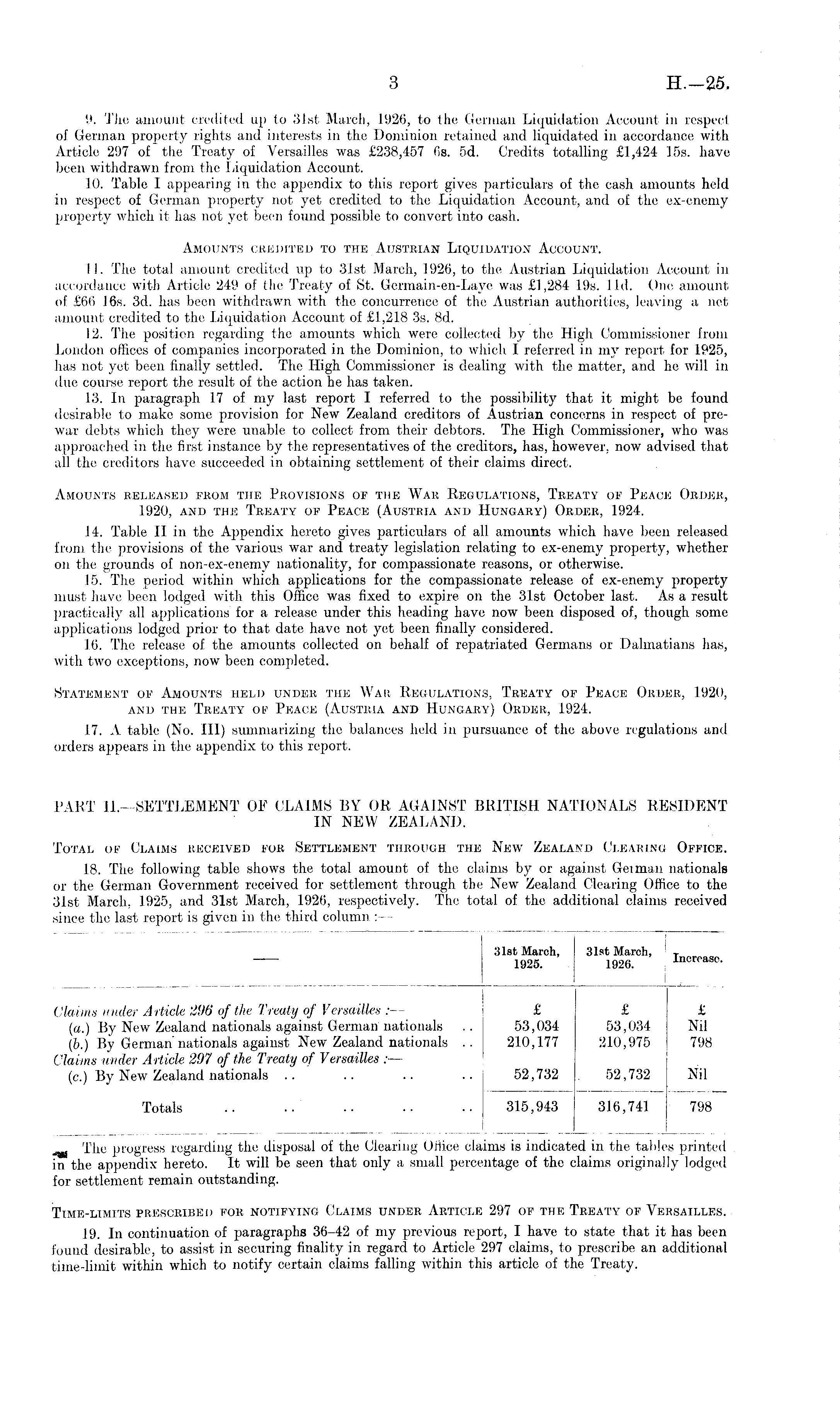 9. The amount credited up to 31st March, 1926, to the German Liquidation Account in respect of German property rights and interests in the Dominion retained and liquidated in accordance with Article 297 of the Treaty of Versailles was £238,457 (Is. sd. Credits totalling £1,424 15s. have been withdrawn from the Liquidation Account. 10. Table I appearing in the appendix to this report gives particulars of the cash amounts held in respect of German property not yet credited to the Liquidation Account, and of the ex-enemy property which it has not yet been found possible to convert into cash. Amounts credited to the Austrian Liquidation Account. 11. The total amount credited up to 31st March, 1926, to the Austrian Liquidation Account in accordance with Article 249 of the Treaty of St. Germain-en-Lave was £1,284 19s. lid. One amount of £66 16s. 3d. has been withdrawn with the concurrence of the Austrian authorities, leaving a net amount credited to the Liquidation Account of £1,218 3s. Bd. 12. The position regarding the amounts which were collected by the High Commissioner from London offices of companies incorporated in the Dominion, to which I referred in my report for 1925, has not yet been finally settled. The High Commissioner is dealing with the matter, and he will in due course report the result of the action he has taken. 13. In paragraph 17 of my last report I referred to the possibility that it might be found desirable to make some provision for New Zealand creditors of Austrian concerns in respect of prewar debts which they were unable to collect from their debtors. The High Commissioner, who was approached in the first instance by the representatives of the creditors, has, however, now advised that all the creditors have succeeded in obtaining settlement of their claims direct. Amounts released from the Provisions of the War Regulations, Treaty of Peace Order, 1920, and the Treaty of Peace (Austria and Hungary) Order, 1924. 14. Table II in the Appendix hereto gives particulars of all amounts which have been released from the provisions of the various war and treaty legislation relating to ex-enemy property, whether on the grounds of non-ex-enemv nationality, for compassionate reasons, or otherwise. 15. The period within which applications for the compassionate release of ex-enemy property must have been lodged with this Office was fixed to expire on the 31st October last. As a result practically all applications for a release under this heading have now been disposed of, though some applications lodged prior to that date have not yet been finally considered. 16. The release of the amounts collected on behalf of repatriated Germans or Dalmatians has, with two exceptions, now been completed. Statement of Amounts held under the War Regulations, Treaty of Peace Order, 1920, and the Treaty of Peace (Austria and Hungary) Order, 1924. 17. A table (No. Ill) summarizing the balances held in pursuance of the above regulations and orders appears in the appendix to this report. PART 11. SETTLEMENT OF CLAIMS BY OR AGAINST BRITISH NATIONALS RESIDENT IN NEW ZEALAND. Total of Claims received for Settlement through the New Zealand Clearing Office. 18. The following table shows the total amount of the claims by or against Geiman nationals or the German Government received for settlement through the New Zealand Clearing Office to the 31st March, 1925, and 31st March, 1926, respectively. The total of the additional claims received since the last report is given in the third column : —
