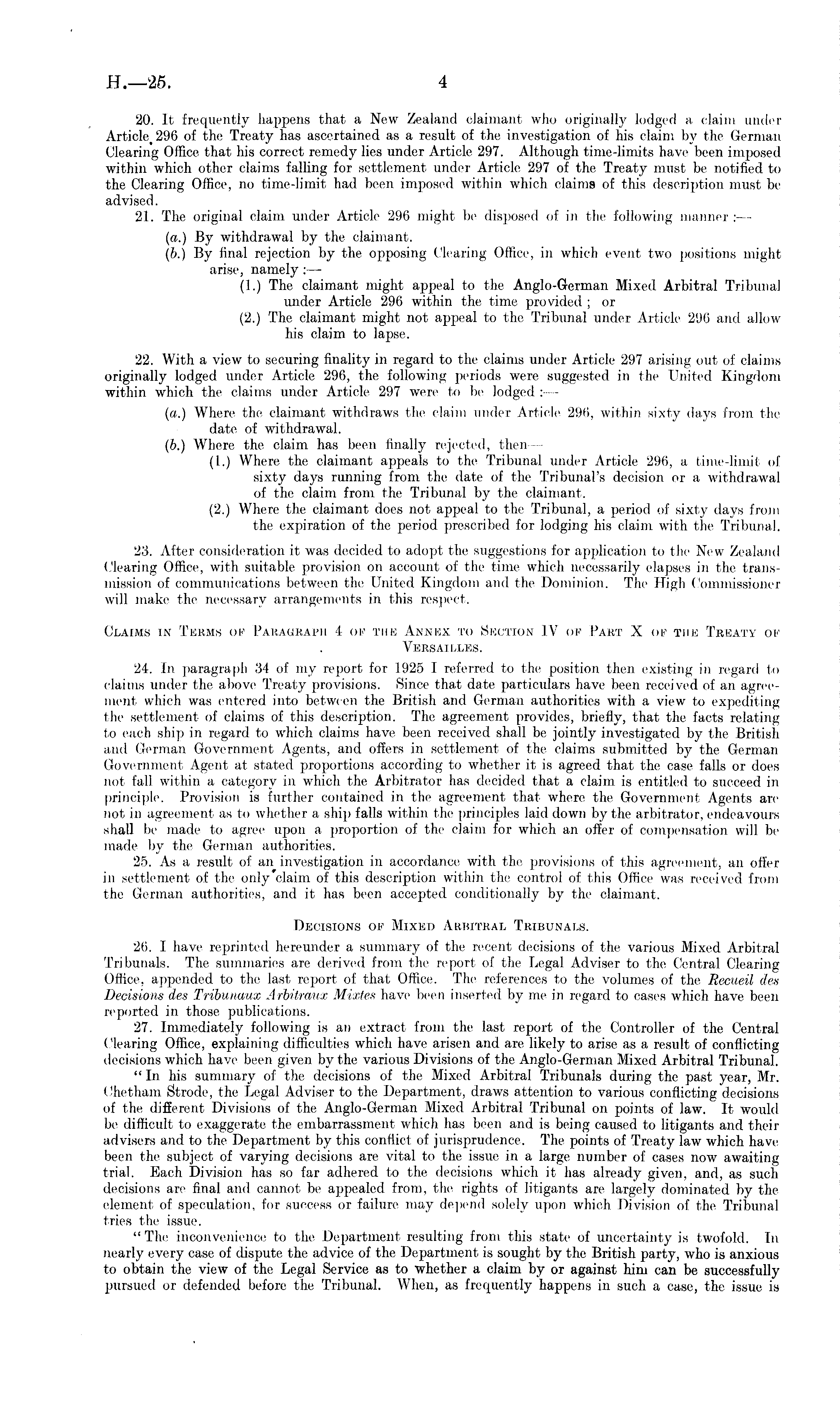 20. It frequently happens that a New Zealand claimant who originally lodged a claim under Article i 296 of the Treaty has ascertained as a result of the investigation of his claim by the German Clearing Office that his correct remedy lies under Article 297. Although time-limits have been imposed within which other claims falling for settlement under Article 297 of the Treaty must be notified to the Clearing Office, no time-limit had been imposed within which claims of this description must be advised. 21. The original claim under Article 296 might be disposed of in the following manner :— (a.) By withdrawal by the claimant. (b.) By final rejection by the opposing Clearing Office, in which event two positions might arise, namely (1.) The claimant might appeal to the Anglo-German Mixed Arbitral Tribunal under Article 296 within the time provided ; or (2.) The claimant might not appeal to the Tribunal under Article 296 and allow his claim to lapse. 22. With a view to securing finality in regard to the claims under Article 297 arising out of claims originally lodged under Article 296, the following periods were suggested in the United Kingdom within which the claims under Article 297 were to be lodged : —■ (a.) Where the claimant withdraws the claim under Article 296, within sixty days from the date of withdrawal. (b.) Where the claim has been finally rejected, then — (1.) Where the claimant appeals to the Tribunal under Article 296, a time-limit of sixty days running from the date of the Tribunal's decision or a withdrawal of the claim from the Tribunal by the claimant. (2.) Where the claimant does not appeal to the Tribunal, a period of sixty days from the expiration of the period prescribed for lodging his claim with the Tribunal. 23. After consideration it was decided to adopt the suggestions for application to the New Zealand Clearing Office, with suitable provision on account of the time which necessarily elapses in the transmission of communications between the United Kingdom and the Dominion. The High Commissioner will make the necessary arrangements in this respect. Claims in Terms of Paragraph 4 of the Annex to Section IV of Part X of the Treaty of Versailles. 24. In paragraph 34 of my report for 1925 I referred to the position then existing in regard to claims under the above Treaty provisions. Since that date particulars have been received of an agreement which was entered into between the British and German authorities with a view to expediting the settlement of claims of this description. The agreement provides, briefly, that the facts relating to each ship in regard to which claims have been received shall be jointly investigated by the British and German Government Agents, and offers in settlement of the claims submitted by the German Government Agent at stated proportions according to whether it is agreed that the case falls or does not fall within a category in which the Arbitrator has decided that a claim is entitled to succeed in principle. Provision is further contained in the agreement that where the Government Agents are not in agreement as to whether a ship falls within the principles laid down by the arbitrator, endeavours shall be made to agree upon a proportion of the claim for which an offer of compensation will be made by the German authorities. 25. As a result of an investigation in accordance with the provisions of this agreement, an offer in settlement of the only claim of this description within the control of this Office was received from the German authorities, and it has been accepted conditionally by the claimant. Decisions of Mixed Arbitral Tribunals. 26. I have reprinted hereunder a summary of the recent decisions of the various Mixed Arbitral Tribunals. The summaries are derived from the report of the Legal Adviser to the Central Clearing Office, appended to the last report of that Office. The references to the volumes of the Recueil des Decisions des Tribunaux Arbitraux Mixtes have been inserted by me in regard to cases which have been reported in those publications. 27. Immediately following is an extract from the last report of the Controller of the Central Clearing Office, explaining difficulties which have arisen and are likely to arise as a result of conflicting decisions which have been given by the various Divisions of the Anglo-German Mixed Arbitral Tribunal. "In his summary of the decisions of the Mixed Arbitral Tribunals during the past year, Mr. Chetham Strode, the Legal Adviser to the Department, draws attention to various conflicting decisions of the different Divisions of the Anglo-German Mixed Arbitral Tribunal on points of law. It would be difficult to exaggerate the embarrassment which has been and is being caused to litigants and their advisers and to the Department by this conflict of jurisprudence. The points of Treaty law which have been the subject of varying decisions are vital to the issue in a large number of cases now awaiting trial. Each Division has so far adhered to the decisions which it has already given, and, as such decisions are final and cannot be appealed from, the rights of litigants are largely dominated by the element of speculation, for success or failure may depend solely upon which Division of the Tribunal tries the issue. " The inconvenience to the Department resulting from this state of uncertainty is twofold. In nearly every case of dispute the advice of the Department is sought by the British party, who is anxious to obtain the view of the Legal Service as to whether a claim by or against him can be successfully pursued or defended before the Tribunal. When, as frequently happens in such a case, the issue is