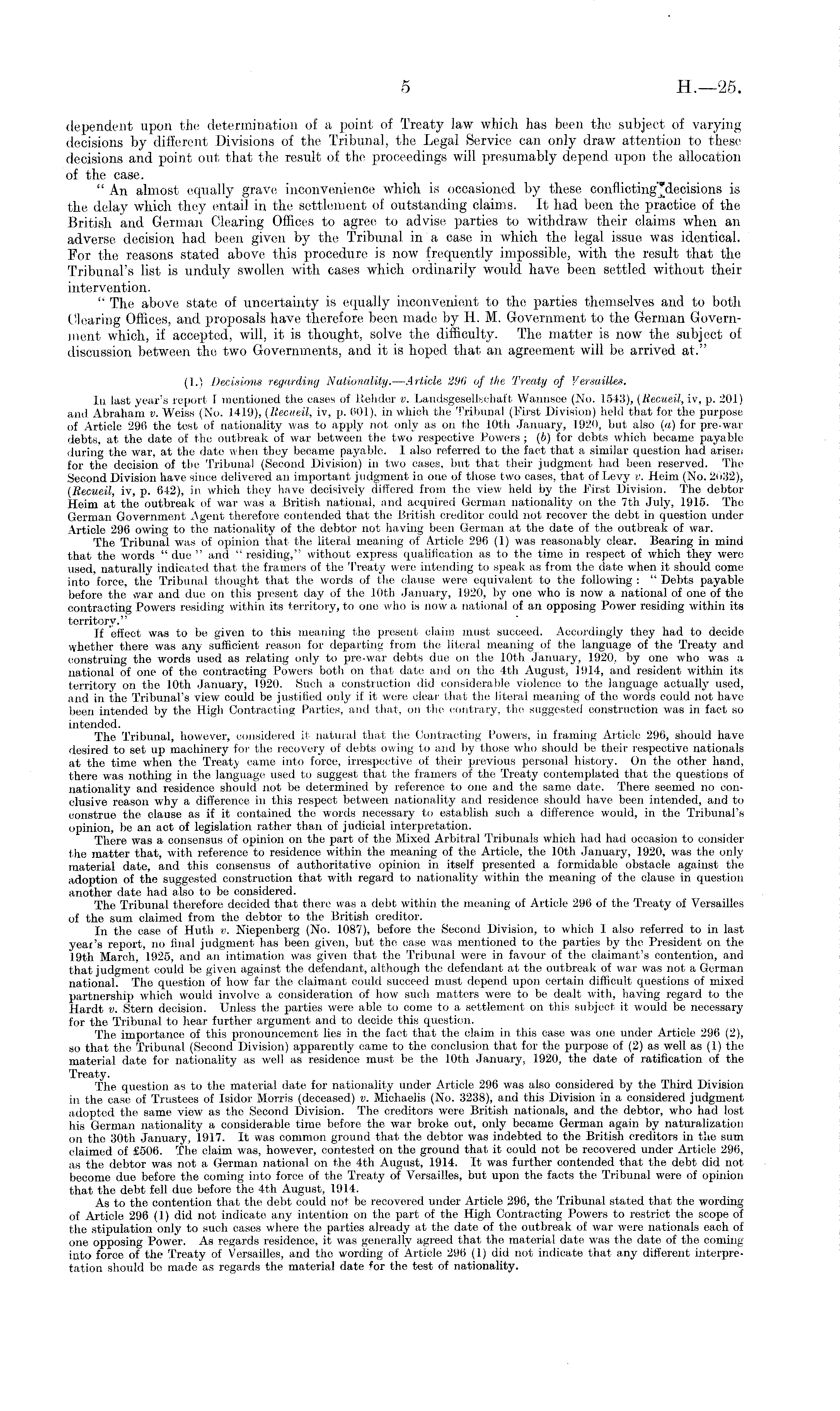 dependent upon the determination of a point of Treaty law which has been the subject of varying decisions by different Divisions of the Tribunal, the Legal Service can only draw attention to these decisions and point out that the result of the proceedings will presumably depend upon the allocation of the case. " An almost equally grave inconvenience which is occasioned by these is the delay which they entail in the settlement of outstanding claims. It had been the practice of the British and German Clearing Offices to agree to advise parties to withdraw their claims when an adverse decision had been given by the Tribunal in a case in which the legal issue was identical. For the reasons stated above this procedure is now frequently impossible, with the result that the Tribunal's list is unduly swollen with cases which ordinarily would have been settled without their intervention. " The above state of uncertainty is equally inconvenient to the parties themselves and to both Clearing Offices, and proposals have therefore been made by H. M. Government to the German Government which, if accepted, will, it is thought, solve the difficulty. The matter is now the subject of discussion between the two Governments, and it is hoped that an agreement will be arrived at." (1.1 Decisions regarding Nationality.—Article 296 uf the Treaty of Versailles. Iu last year's report I mentioned the eases of Hehder v. Landsgeselischaft Wamisee (No. 1543), (Recueil, iv, p. 201) and Abraham v. Weiss (No. 1419), (Recueil, iv, p. 601). in which the Tribunal (First Division) held that for the purpose of Article 296 the test of nationality was to apply not only as on the 10th January, 1920, but also (a) for pre-war debts, at the date of the outbreak of war between the two respective Powers ; (6) for debts which became payable during the war, at the date when they became payable. 1 also referred to the fact that a similar question had arisen for the decision of the Tribunal (Second Division) in two cases, but that their judgment had been reserved. The Second Division have since delivered an important judgment in one of those two cases, that of Levy v. Heim (No. 2032), (Recueil, iv, p. 642), in which they have decisively differed from the view held by the First Division. The debtor Heim at the outbreak of war was a British national, and acquired German nationality on the 7th July, 1915. The German Government Agent therefore contended that the British creditor could not recover the debt in question under Article 296 owing to the nationality of the debtor not having been German at the date of the outbreak of war. The Tribunal was of opinion that the literal meaning of Article 296 (1) was reasonably clear. Bearing in mind that the words " due " and " residing," without express qualification as to the time in respect of which they were used, naturally indicated that the framers of the Treaty were intending to speak as from the date when it should come into force, the Tribunal thought that the words of the clause were equivalent to the following : " Debts payable before the war and due on this present day of the 10th January, 1920, by one who is now a national of one of the contracting Powers residing within its territory, to one who is now a national of an opposing Power residing within its territory." If effect was to be given to this meaning the present claim must succeed. Accordingly they had to decide whether there was any sufficient reason for departing from the literal meaning of the language of the Treaty and construing the words used as relating only to pre-war debts due on the 10th January, 1920, by one who was a national of one of the contracting Powers both on that date and on the 4th August, 1914, and resident within its territory on the 10th January, 1920. Such a construction did considerable violence to the language actually used, and in the Tribunal's view could be justified only if it were clear that the literal meaning of the words could not have been intended by the High Contracting Parties, and that, on the contrary, the suggested construction was in fact so intended. The Tribunal, however, considered it natural that the Contracting Powers, in framing Article 296, should have desired to set up machinery for the recovery of debts owing to and by those who should be their respective nationals at the time when the Treaty came into force, irrespective of their previous personal history. On the other hand, there was nothing in the language used to suggest that the framers of the Treaty contemplated that the questions of nationality and residence should not be determined by reference to one and the same date. There seemed no conclusive reason why a difference in this respect between nationality and residence should have been intended, and to construe the clause as if it contained the words necessary to- establish such a difference would, in the Tribunal's opinion, be an act of legislation rather than of judicial interpretation. There was a consensus of opinion on the part of the Mixed Arbitral Tribunals which had had occasion to consider the matter that, with reference to residence within the meaning of the Article, the 10th January, 1920, was the only material date, and this consensus of authoritative opinion in itself presented a formidable obstacle against the adoption of the suggested construction that with regard to nationality within the meaning of the clause in question another date had also to be considered. The Tribunal therefore decided that there was a debt within the meaning of Article 296 of the Treaty of Versailles of the sum claimed from the debtor to the British creditor. In the case of Hutli v. Niepenberg (No. 1087), before the Second Division, to which 1 also referred to in last yeai's report, no final judgment has been given, but the ease was mentioned to the parties by the President on the 19th March, 1925, and an intimation was given that the Tribunal were in favour of the claimant's conte