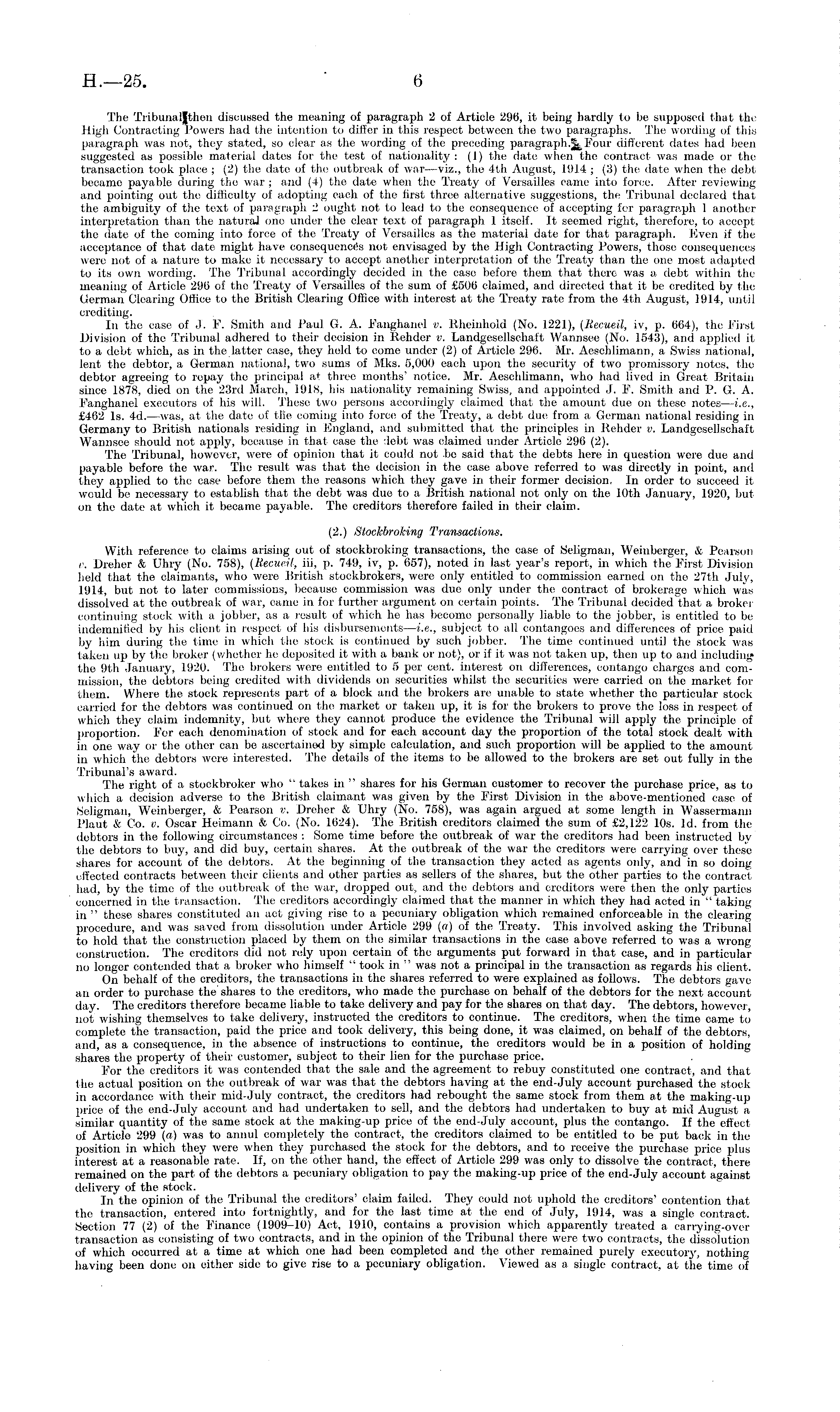 The Tribunaljfthen discussed the meaning of paragraph 2 of Article 296, it being hardly to be supposed that the High Contracting Powers had the intention to differ in this respect between the two paragraphs. The wording of this paragraph was not, they stated, so clear as the wording of the preceding paragraph.Four different dates had been suggested as possible material dates for the test of nationality : (1) the date when the contract was made or the transaction took place ; (2) the date of the outbreak of war—viz., the 4th August, 1914 ; (3) the date when the debt became payable during the war ; and (4) the date when the Treaty of Versailles came into force. After reviewing and pointing out the difficulty of adopting each of the first three alternative suggestions, the Tribunal declared that the ambiguity of the text of paragraph 2 ought not to lead to the consequence of accepting for paragraph 1 another interpretation than the natural one under the clear text of paragraph 1 itself. It seemed right, therefore, to accept the date of the coming into force of the Treaty of Versailles as the material date for that paragraph. Even if the acceptance of that date might have consequences not envisaged by the High Contracting Powers, those consequences were not of a nature to make it necessary to accept another interpretation of the Treaty than the one most adapted to its own wording. The Tribunal accordingly decided in the case before them that there was a debt within the meaning of Article 296 of the Treaty of Versailles of the sum of £506 claimed, and directed that it be credited by the German Clearing Office to the British Clearing Office with interest at the Treaty rate from the 4th August, 1914, until crediting. In the case of J. F. Smith and Paul G. A. Fanghanel v. Rheinhold (No. 1221), (Becueil, iv, p. 664), the First Division of the Tribunal adhered to their decision in Rehder v. Landgesellschaft Wannsee (No. 1543), and applied it to a debt which, as in the latter case, they held to come under (2) of Article 296. Mr. Aeschlimann, a Swiss national, lent the debtor, a German national, two sums of Mks. 5,000 each upon the security of two promissory notes, the debtor agreeing to repay the principal at three months' notice. Mr. Aeschlimann, who had lived in Great Britain since 1878, died on the 23rd March, 1918, his nationality remaining Swiss, and appointed J. F. Smith and P. G. A. Fanghanel executors of his will. These two persons accordingly claimed that the amount due on these notes—i.e., £462 Is. 4d. —was, at the date of the coming into force of the Treaty, a debt due from a German national residing in Germany to British nationals residing in England, and submitted that the principles in Rehder v. Landgesellschaft Wannsee should not apply, because in that case the debt was claimed under Article 296 (2). The Tribunal, however, were of opinion that it could not be said that the debts here in question were due and payable before the war. The result was that the decision in the case above referred to was directly in point, and they applied to the case before them the reasons which they gave in their former decision, In order to succeed it would be necessary to establish that the debt was due to a British national not only on the 10th January, 1920, but on the date at which it became payable. The creditors therefore failed in their claim. (2.) Stoclcbroking Transactions. With reference to claims arising out of stockbroking transactions, the ease of Seligman, Weinberger, & Pearson v. Dreher & Uhry (No. 758), (Recueil, iii, p. 749, iv, p. 657), noted in last year's report, in which the First Division held that the claimants, who were British stockbrokers, were only entitled to commission earned on the 27th July, 1914, but not to later commissions, because commission was due only under the contract of brokerage which was dissolved at the outbreak of war, came in for further argument on certain points. The Tribunal decided that a broker continuing stock with a jobber, as a result of which he has become personally liable to the jobber, is entitled to be indemnitied by his client in respect of his disbursements—i.e., subject to all contangoes and differences of price paid by him during the time in which the stock is continued by such jobber. The time continued until the stock was taken up by the broker (whether he deposited it with a bank or not), or if it was not taken up, then up to and including the 9th January, 1920. The brokers were entitled to 5 per cent, interest on differences, contango charges and commission, the debtors being credited with dividends on securities whilst the securities were carried on the market for them. Where the stock represents part of a block and the brokers are unable to state whether the particular stock carried for the debtors was continued on the market or taken up, it is for the brokers to prove the loss in respect of which they claim indemnity, but where they cannot produce the evidence the Tribunal will apply the principle of proportion. For each denomination of stock and for each account day the proportion of the total stock dealt with in one way or the other can be ascertained by simple calculation, and such proportion will be applied to the amount in which the debtors were interested. The details of the items to be allowed to the brokers are set out fully in the Tribunal's award. The right of a stockbroker who " takes in " shares for his German customer to recover the purchase price, as to which a decision adverse to the British claimant was given by the First Division in the above-mentioned case of Seligman, Weinberger, & Pearson v. Dreher & Uhry (No. 758), was again argued at some length in Wassermann Plaut & Co. v. Oscar Heimann & Co. (No. 1624). The British creditors claimed the sum of £2,122 10s. Id. from the debtors in the following circumstances : Some time before the outbreak of war the creditors had been instructed by the debtors to Imy,