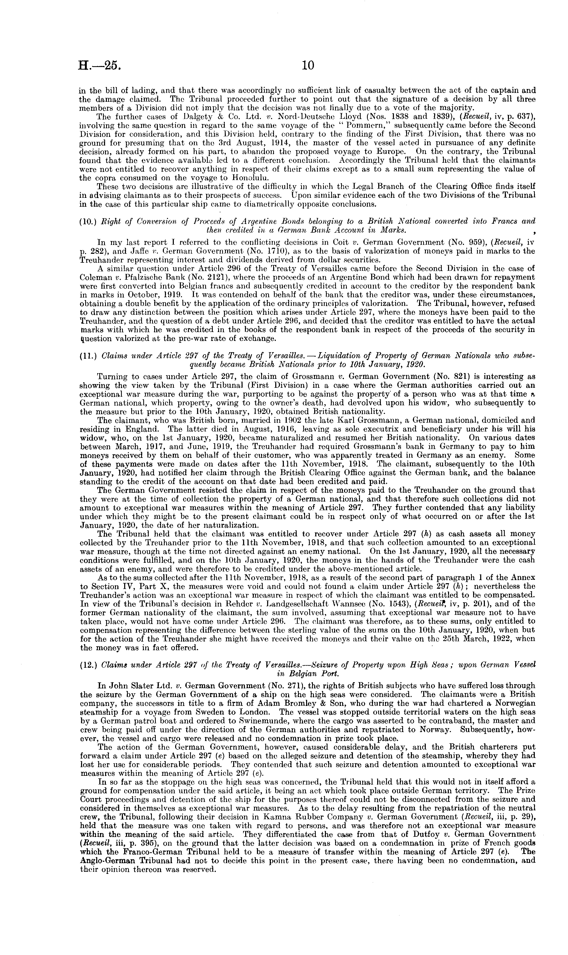 in the bill of lading, and that there was accordingly no sufficient link of casualty between the act of the captain and the damage claimed. The Tribunal proceeded further to point out that the signature of a decision by all three members of a Division did not imply that the decision was not finally due to a vote of the majority. The further cases of Dalgety & Co. Ltd. v. Nord-Deutsche Lloyd (Nos. 1838 and 1839), (Recueil, iv, p. 637), involving the same question in regard to the same voyage of the " Pommern," subsequently came before the Second Division for consideration, and this Division held, contrary to the finding of the First Division, that there was no ground for presuming that on the 3rd August, 1914, the master of the vessel acted in pursuance of any definite decision, already formed on his part, to abandon the proposed voyage to Europe. On the contrary, the Tribunal found that the evidence available led to a different conclusion. Accordingly the Tribunal held that the claimants were not entitled to recover anything in respect of their claims except as to a small sum representing the value of the copra consumed on the voyage to Honolulu. These two decisions are illustrative of the difficulty in which the Legal Branch of the Clearing Office finds itself in advising claimants as to their prospects of success. Upon similar evidence each of the two Divisions of the Tribunal in the case of this particular ship came to diametrically opposite conclusions. (10.) Right of Conversion of Proceeds of Argentine Bonds belonging to a British National converted into Francs and. then credited in a German Bank Account in Marks. , In my last report I referred to the conflicting decisions in Coit v. German Government (No. 959), (Recueil, iv p. 282), and Jaffe v. German Government (No. 1710), as to the basis of valorization of moneys paid in marks to the Treuhander representing interest and dividends derived from dollar securities. A similar question under Article 290 of the Treaty of Versailles came before the Second Division in the case of Coleman v. Pfalzische Bank (No. 2121), where the proceeds of an Argentine Bond which had been drawn for repayment were first converted into Belgian francs and subsequently credited in account to the creditor by the respondent bank in marks in October, 1919. It was contended on behalf of the bank that the creditor was, under these circumstances, obtaining a double benefit by the application of the ordinary principles of valorization. The Tribunal, however, refused to draw any distinction between the position which arises under Article 297, where the moneys have been paid to the Treuhander, and the question of a debt under Article 296, and decided that the creditor was entitled to have the actual ftiarks with which he was credited in the books of the respondent bank in respect of the proceeds of the security in question valorized at the pre-war rate of exchange. (11.) Claims under Article 297 of the Treaty of Versailles. — Liquidation of Property of German Nationals who subsequently became British Nationals prior to 10th January, 1920. Turning to cases under Article 297, the claim of Grossmann v. German Government (No. 821) is interesting as showing the view taken by the Tribunal (First Division) in a case where the German authorities carried out an exceptional war measure during the war, purporting to be against the property of a person who was at that time a German national, which property, owing to the owner's death, had devolved upon his widow, who subsequently to the measure but prior to the 10th January, 1920, obtained British nationality. The claimant, who was British born, married in 1902 the late Karl Grossmann, a German national, domiciled and residing in England. The latter died in August, 1916, leaving as sole executrix and beneficiary under his will his widow, who, on the Ist January, 1920, became naturalized and resumed her British nationality. On various dates between March, 1917, and June, 1919, the Treuhander had required Grossmann's bank in Germany to pay to him moneys received by them on behalf of their customer, who was apparently treated in Germany as an enemy. Some of these payments were made on dates after the 11th November, 1918. The claimant, subsequently to the 10th January, 1920, had notified her claim through the British Clearing Office against the German bank, and the balance standing to the credit of the account on that date had been credited and paid. The German Government resisted the claim in respect of the moneys paid to the Treuhander on the ground that they were at the time of collection the property of a German national, and that therefore such collections did not amount to exceptional war measures within the meaning of Article 297. They further contended that any liability under which they might be to the present claimant could be in respect only of what occurred on or after the Ist January, 1920, the date of her naturalization. The Tribunal held that the claimant was entitled to recover under Article 297 (h) as cash assets all money collected by the Treuhander prior to the 11th November, 1918, and that such collection amounted to an exceptional war measure, though at the time not directed against an enemy national. On the Ist January, 1920, all the necessary conditions were fulfilled, and on the 10th January, 1920, the moneys in the hands of the Treuhander were the cash assets of an enemy, and were therefore to be credited under the above-mentioned article. As to the sums collected after the 11th November, 1918, as a result of the second part of paragraph 1 of the Annex to Section IV, Part X, the measures were void and could not found a claim under Article 297 (h); nevertheless the Treuhander's action was an exceptional war measure in respect of which the claimant was entitled to be compensated. In view of the Tribunal's decision in Rehder v. Landgesellschaft Wannsee (No. 1543), (Recueit, iv, p. 201), and of the former Germ