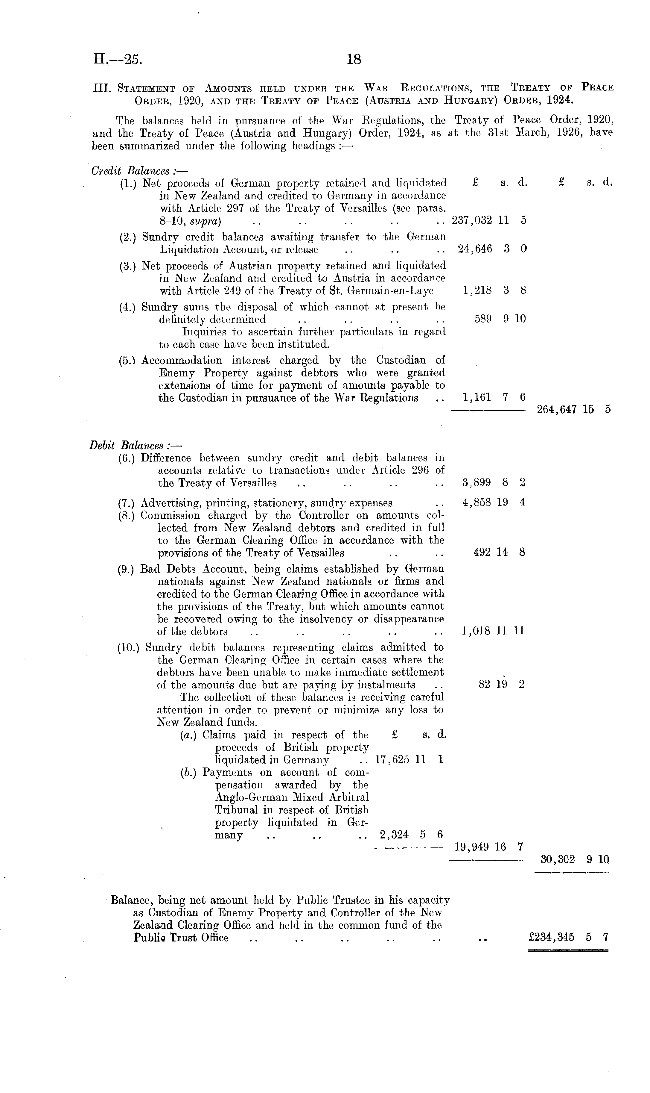 111. Statement of Amounts held under the War Regulations, the Treaty oe Peace Order, 1920, and the Treaty oe Peace (Austria and Hungary) Order, 1924. The balances held in pursuance of the War Regulations, the Treaty of Peace Order, 1920, and the Treaty of Peace (Austria and Hungary) Order, 1924, as at the 31st March, 1926, have been summarized under the following headings : — Credit Balances :—■ (1.) Net proceeds of German property retained and liquidated £ s. d. £ s. d. in New Zealand and credited to Germany in accordance with Article 297 of the Treaty of Versailles (see paras. 8-10, supra) .. .. .. .. .. 237,032 11 5 (2.) Sundry credit balances awaiting transfer to the German Liquidation Account, or release .. .. .. 24,646 3 0 (3.) Net proceeds of Austrian property retained and liquidated in New Zealand and credited to Austria in accordance with Article 249 of the Treaty of St. Germain-en-Laye 1,218 3 8 (4.) Sundry sums the disposal of which cannot at present be definitely determined .. .. .. .. 589 9 10 Inquiries to ascertain further particulars in regard to each case have been instituted. (5.i Accommodation interest charged by the Custodian of Enemy Property against debtors who were granted extensions of time for payment of amounts payable to the Custodian in pursuance of the War Regulations .. 1,161 7 6 — 264,647 15 5 Debit Balances: — (6.) Difference between sundry credit and debit balances in accounts relative to transactions under Article 296 of the Treaty of Versailles .. .. .. .. 3,899 8 2 (7.) Advertising, printing, stationery, sundry expenses .. 4,858 19 4 (8.) Commission charged by the Controller on amounts collected from New Zealand debtors and credited in full to the German Clearing Office in accordance with the provisions of the Treaty of Versailles .. .. 492 14 8 (9.) Bad Debts Account, being claims established by German nationals against New Zealand nationals or firms and credited to the German Clearing Office in accordance with the provisions of the Treaty, but which amounts cannot be recovered owing to the insolvency or disappearance of the debtors .. .. .. .. .. 1,018 11 11 (10.) Sundry debit balances representing claims admitted to the German Clearing Office in certain cases where the debtors have been unable to make immediate settlement of the amounts due but are paying by instalments .. 82 19 2 The collection of these balances is receiving careful attention in order to prevent or minimize any loss to New Zealand funds. (a.) Claims paid in respect of the £ s. d. proceeds of British property liquidated in Germany .. 17,625 11 1 (b.) Payments on account of compensation awarded by the Anglo-German Mixed Arbitral Tribunal in respect of British property liquidated in Germany .. .. 2,324 5 6 — 19,949 16 7 — 30,302 9 10 Balance, being net amount held by Public Trustee in his capacity as Custodian of Enemy Property and Controller of the New Zealand Clearing Office and held in the common fund of the Publk Trust Office £234,345 5 7