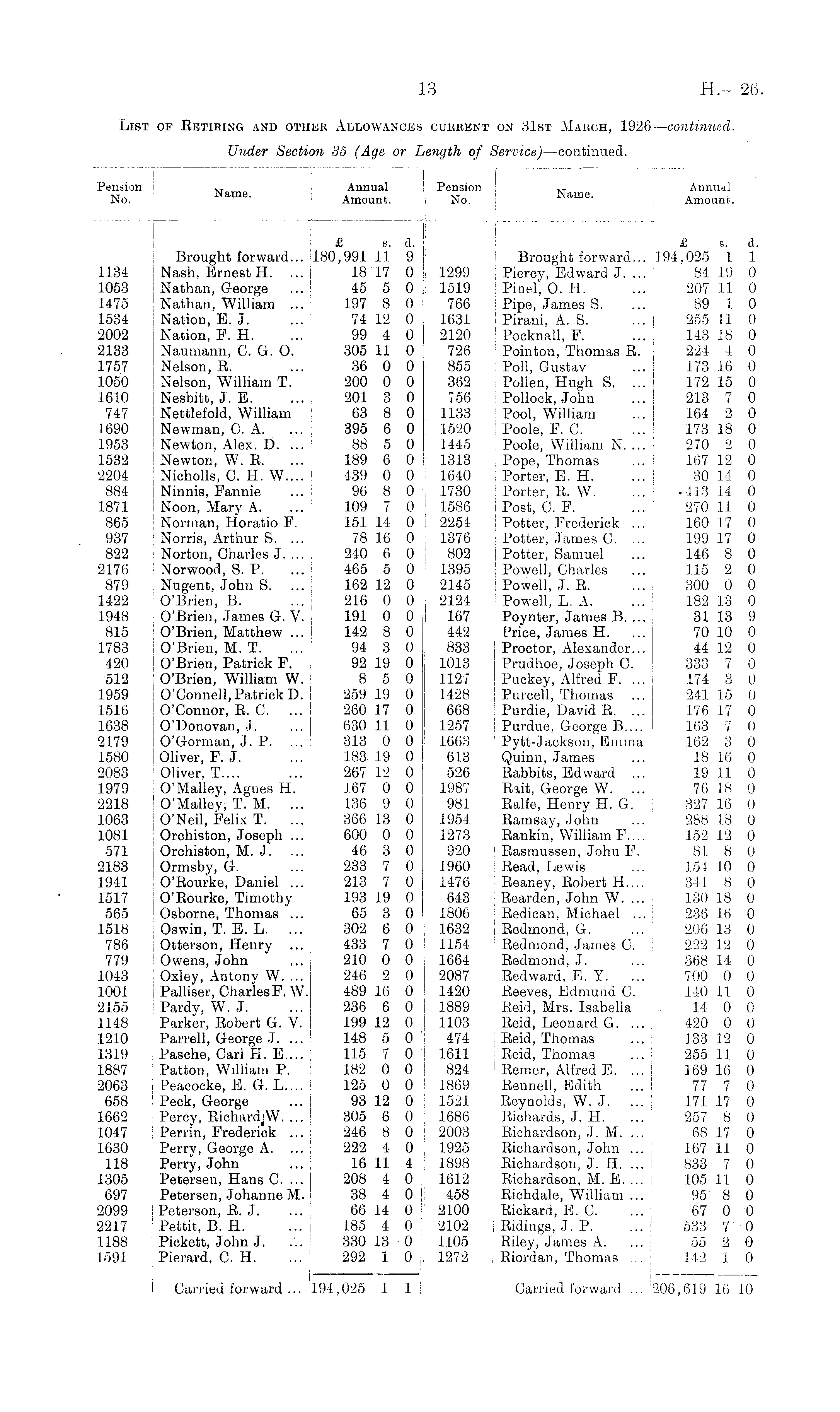 Pension t. t Annual No. Name " Amount. I ! £ a. d. Brought forward... 194,025 1 1 1299 Piercy, Edward J. ... 84 19 0 1519 Pinel, 0. H. ... 207 11 0 '766 Pipe, James S. ... 89 10 1631 Pirani, A. S. ... 255 11 0 2120 Pocknall, F. ... 14-3 18 0 726 Pointon, Thomas R. 224 4 0 855 Poll, Gustav ... 173 16 0 362 Pollen, Hugh S. ... 172 15 0 756 Pollock, John ... 213 7 0 1133 Pool, William ... 164 2 0 1520 Poole, P. C. ... 173 18 0 1445 Poole, William N. ... 270 2 0 1313 Pope, Thomas ... 167 12 0 1640 Porter, B. H. ... 30 14 0 1730 Porter, E. W. ... -413 14 0 1586 Post, C. B. ... 270 11 0 2254 Potter, Frederick ... 160 17 0 1376 Potter, James C. ... I 199 17 0 802 Potter, Samuel ... 146 8 0 1395 Powell, Charles ... 115 2 0 2145 Powell, J. E. ... 300 0 0 2124 Powell, L. A. ... ! 182 .13 0 167 Poynter, James B. ... : 31 13 9 442 Price, James H. ... 70 10 0 833 Proctor, Alexander... 44 12 0 1013 Prudhoe, Joseph C. 333 7 0 1127 Puckey, Alfred F. ... 174 3 0 1428 Purcell, Thomas ... 241 15 0 668 Purdie, David E. ... 176 17 0 1257 Purdue, George B.... 163 7 0 1663 Pytt-Jackson, Emma 162 3 0 613 Quinn, James ... 18 16 0 526 Babbits, Edward ... 19 11 0 1987 i Bait, George W. ... 76 18 0 981 Ealfe, Henry H. G. 327 16 0 1954. Ramsay, John ... 288 .18 0 1273 Eankin, William F.... 152 12 0 920 i Basmussen, John F. 818 0 1960 Bead, Lewis ... 15i 10 0 1476 Eeaney, Bobert H.... 341 8 0 643 '■ Bearden, John W. ... 130 18 0 1806 | Bedican, Michael ... | 236 16 0 1632 ! Redmond, G. ... 206 13 0 1154 : Redmond, James C. 222 12 0 1664 Redmond, J. ... 368 14 0 2087 Redward, E. Y. ... 700 0 0 1420 Reeves, Edmund C. 140 11 0 1889 Reid, Mrs. Isabella 14 0 0 1103 Reid, Leonard G. ... 420 0 0 474 Reid, Thomas ... 133 12 0 1611 j Reid, Thomas ... 255 11 0 824 ' Remer, Alfred E. ... 169 16 0 1869 Rennell, Edith ... 77 7 0 1521 Reynolds, W. J. ... 171 17 0 1686 Richards, J. H. : 257 8 0 2003 Richardson, J. M. ... 68 17 0 1925 Richardson, John ... 167 11 0 1898 Richardson, J. H. ... | 833 7 0 i 1612 Richardson, M. E. ... 105 11 0 458 Richdale, William .i. 95' 8 0 2100 Rickard, E. C. ... 67 0 0 2102 Ridings, J. P. ... 533 7 0 1105 ; Riley, James A. ... 55 2 0 1272 | Riordan, Thomas ... 142 1 0 Carried forward ... 206,619 16 10