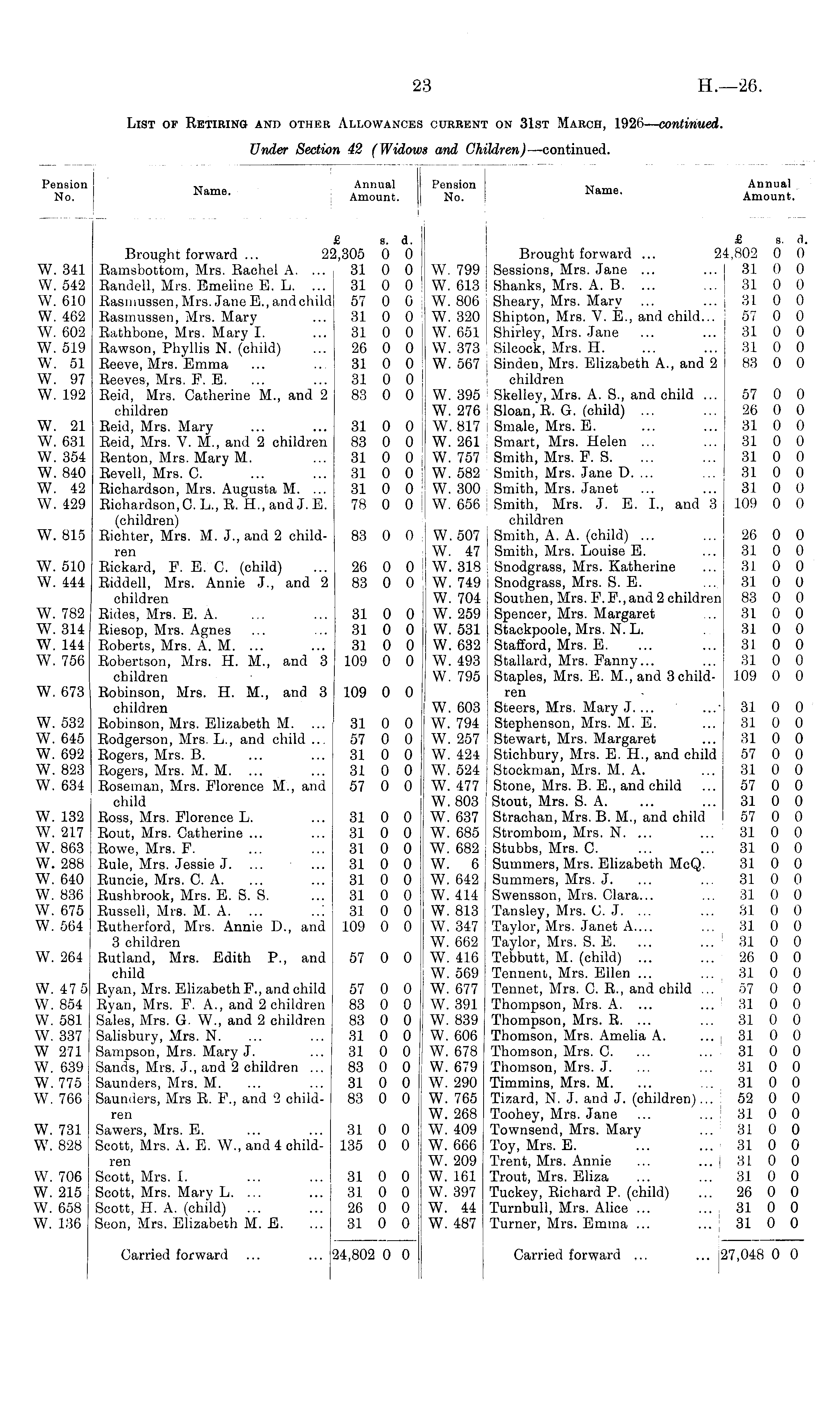 Pension , T Annual No. Name - Amount. j £ s. a. Brought forward ... 22,305 0 0 W. 341 Ramsbottom, Mrs. Eachel A. ... 31 0 0 W. 542 Randell, Mrs. Bmeline E. L. ... 31 0 0 W. 610 Rasmussen, Mrs. Jane E., and child 57 0 0 j W. 462 Rasmussen, Mrs. Mary ... 31 0 0 j W. 602 Rathbone, Mrs. Mary I. ... 31 0 0 W. 519 Rawson, Phyllis N. (child) ... 26 0 0 W. 51 Reeve, Mrs. Emma ... ... 31 0 0 W. 97 Reeves, Mrs. P. E. ... ... 31 0 0 W. 192 Reid, Mrs. Catherine M., and 2 83 0 0 children W. 21 Reid, Mrs. Mary ... ... 31 0 0 W. 631 Reid, Mrs. Y. M., and 2 children 83 0 0 W. 354 Renton, Mrs. Mary M. ... 31 0 0 j W. 840 Revell, Mrs. C. ... ... 31 0 0 W. 42 Richardson, Mrs. Augusta M. ... 31 0 0 | W. 429 Richardson, C. L., R. H., and J. E. 78 0 0 (children) W. 815 Richter, Mrs. M. J., and 2 child- 83 0 0 ren W. 510 Rickard, P. E. C. (child) ... 26 0 0 W. 444 Riddell, Mrs. Annie J., and 2 83 0 0 children W. 782 Rides, Mrs. E. A. ... ... 31 0 0 W. 314 Riesop, Mrs. Agnes ... ... 31 0 0 W. 144 Roberts, Mrs. A. M. ... ... 31 0 0 W. 756 Robertson, Mrs. H. M., and 3 109 0 0 children W. 673 Robinson, Mrs. H. M., and 3 109 0 0 | children W. 532 Robinson, Mrs. Elizabeth M. ... 31 0 0 W. 645 Rodgerson, Mrs. L., and child ... 57 0 0 W. 692 Rogers, Mrs. B. ... ... 31 0 0 W. 823 Rogers, Mrs. M. M. ... ... 31 0 0 W. 634 Roseman, Mrs. Florence M., and 57 0 0 child W. 132 Ross, Mrs. Florence L. ... 31 0 0 W. 217 Rout, Mrs. Catherine ... ... 31 0 0 W. 863 Rowe, Mrs. F. ... ... 31 0 0 W. 288 Rule, Mrs. Jessie J. ... ... 31 0 0 W. 640 Runcie, Mrs. C. A. ... ... 31 0 0 W. 836 Rushbrook, Mrs. E. S. S. ... 31 0 0 W. 675 Russell, Mrs. M. A. ... ..i 31 0 0 W. 564 Rutherford, Mrs. Annie D., and 109 0 0 3 children W. 264 Rutland, Mrs. Edith P., and 57 0 0 child W. 47 5 Ryan, Mrs. Elizabeth F., and child 57 0 0 W. 854 Ryan, Mrs. F. A., and 2 children 83 0 0 W. 581 Sales, Mrs. G. W., and 2 children 83 0 0 ( W. 337 Salisbury, Mrs. N. ... ... 31 0 0 W 271 Sampson, Mrs. Mary J. ... 31 0 0 W. 639 Sands, Mrs. J., and 2 children ... 83 0 0 I W. 775 Saunders, Mrs. M. ... ... 31 0 0 | W. 766 Saunders, Mrs R. F., and 2 child- 83 0 0 I ren W. 731 Sawers, Mrs. E. ... ... 31 0 0 W. 828 Scott, Mrs. A. E. W„ and 4 child- 135 0 0 ren W. 706 Scott, Mrs. I. ... ... 31 0 0 W. 215 Scott, Mrs. Mary L. ... ... 31 0 0 W. 658 Scott, H. A. (child) ... ... 26 0 0 W. 136 Seon, Mrs. Elizabeth M. E. ... 31 0 0 Carried forward ... ... 124,802 0 0