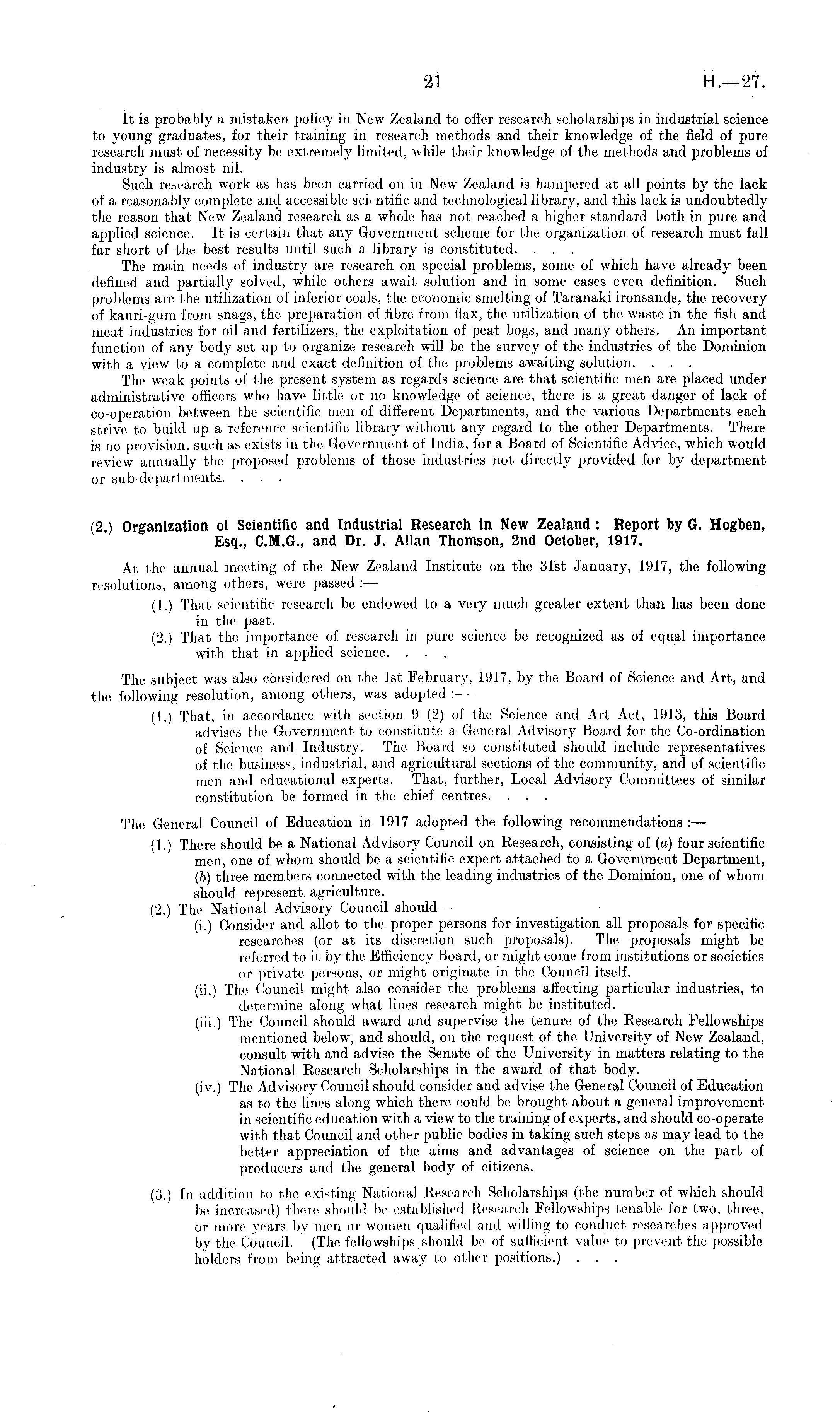 it is probably a mistaken policy in New Zealand to offer research scholarships in industrial science to young graduates, for their training in research methods and their knowledge of the field of pure research must of necessity be extremely limited, while their knowledge of the methods and problems of industry is almost nil. Such research work as has been carried on in New Zealand is hampered at all points by the lack of a reasonably complete and accessible sci( ntific and technological library, and this lack is undoubtedly the reason that New Zealand research as a whole has not reached a higher standard both in pure and applied science. It is certain that any Government scheme for the organization of research must fall far short of the best results until such a library is constituted. . . . The main needs of industry are research on special problems, some of which have already been defined and partially solved, while others await solution and in some cases even definition. Such problems are the utilization of inferior coals, the economic smelting of Taranaki ironsands, the recovery of kauri-gum from snags, the preparation of fibre from flax, the utilization of the waste in the fish and meat industries for oil and fertilizers, the exploitation of peat bogs, and many others. An important function of any body set up to organize research will be the survey of the industries of the Dominion with a view to a complete and exact definition of the problems awaiting solution. . . . The weak points of the present system as regards science are that scientific men are placed under administrative officers who have little or no knowledge of science, there is a great danger of lack of co-operation between the scientific men of different Departments, and the various Departments each strive to build up a reference scientific library without any regard to the other Departments. There is no provision, such as exists in the Government of India, for a Board of Scientific Advice, which would review annually the proposed problems of those industries not directly provided for by department or sub-departments. . . . (2.) Organization of Scientifie and Industrial Research in New Zealand : Report by G. Hogben, Esq., C.M.G., and Dr. J. Allan Thomson, 2nd October, 1917. At the annual meeting of the New Zealand Institute on the 31st January, 1917, the following resolutions, among others, were passed : — (1.) That scientific research be endowed to a very much greater extent than has been done in the past. (2.) That the importance of research in pure science be recognized as of equal importance with that in applied science. . . . The subject was also considered on the Ist February, 1917, by the Board of Science and Art, and the following resolution, among others, was adopted :• — (1.) That, in accordance with section 9 (2) of the Science and Art Act, 1913, this Board advises the Government to constitute a General Advisory Board for the Co-ordination of Science and Industry. The Board so constituted should include representatives of the business, industrial, and agricultural sections of the community, and of scientific men and educational experts. That, further, Local Advisory Committees of similar constitution be formed in the chief centres. . . . The General Council of Education in 1917 adopted the following recommendations:— (1.) There should be a National Advisory Council on Research, consisting of (a) four scientific men, one of whom should be a scientific expert attached to a Government Department, (b) three members connected with the leading industries of the Dominion, one of whom should represent, agriculture. (2.) The National Advisory Council should — (i.) Consider and allot to the proper persons for investigation all proposals for specific researches (or at its discretion such proposals). The proposals might be referred to it by the Efficiency Board, or might come from institutions or societies or private persons, or might originate in the Council itself. (ii.) The Council might also consider the problems affecting particular industries, to determine along what lines research might be instituted. (iii.) The Council should award and supervise the tenure of the Research Fellowships mentioned below, and should, on the request of the University of New Zealand, consult with and advise the Senate of the University in matters relating to the National Research Scholarships in the award of that body. (iv.) The Advisory Council should consider and advise the General Council of Education as to the lines along which there could be brought about a general improvement in scientific education with a view to the training of experts, and should co-operate with that Council and other public bodies in taking such steps as may lead to the better appreciation of the aims and advantages of science on the part of producers and the general body of citizens. (3.) In addition to the existing National Research Scholarships (the number of which should be increased) there should be established Research Fellowships tenable for two, three, or more years by men or women qualified and willing to conduct researches approved by the Council. (The fellowships should be of sufficient value to prevent the possible holders from being attracted away to other positions.) . . .