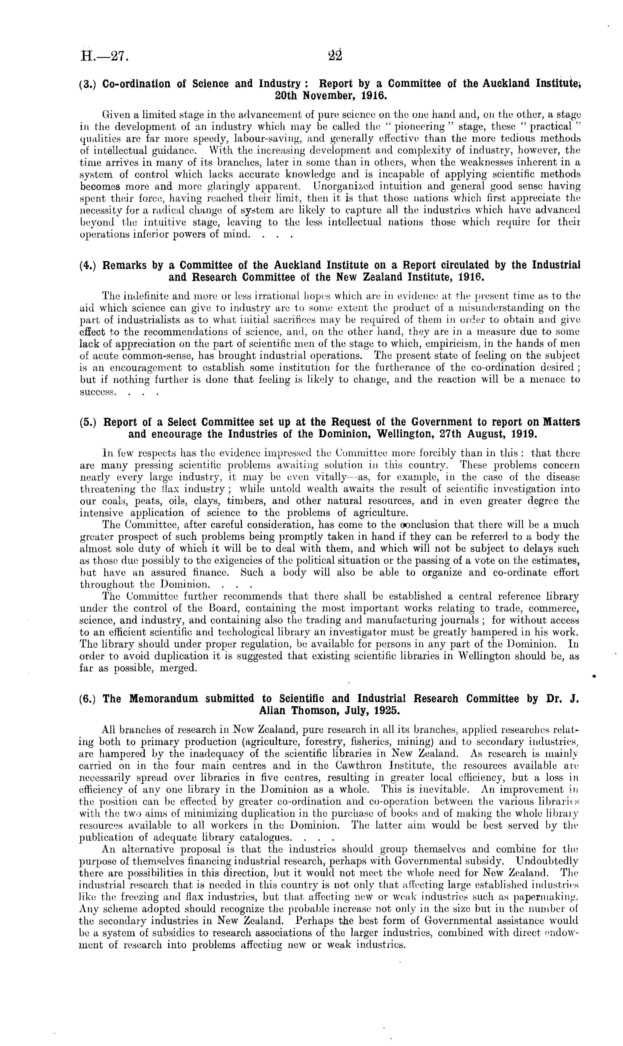 (3.) Co-ordination of Science and Industry : Report by a Committee of the Auckland Institute; 20th November, 1916. Given a limited stage in the advancement of pure science on the one hand and, on the other, a stage in the development of an industry which may be called the " pioneering " stage, these " practical " qualities are far more speedy, labour-saving, and generally effective than the more tedious methods of intellectual guidance. With the increasing development and complexity of industry, however, the time arrives in many of its branches, later in some than in others, when the weaknesses inherent in a system of control which lacks accurate knowledge and is incapable of applying scientific methods becomes more and more glaringly apparent. Unorganized intuition and general good sense having spent their force, having reached their limit, then it is that those nations which first appreciate the necessity for a radical change of system are likely to capture all the industries which have advanced beyond the intuitive stage, leaving to the less intellectual nations those which require for their operations inferior powers of mind. . . . (4.) Remarks by a Committee of the Auckland Institute on a Report circulated by the Industrial and Research Committee of the New Zealand Institute, 1916. The indefinite and more or less irrational hopes which are in evidence at the present time as to the aid which science can give to industry are to some extent the product of a misunderstanding on the part of industrialists as to what initial sacrifices may be required of them in order to obtain and give effect to the recommendations of science, and, on the other hand, they are in a measure due to some lack of appreciation on the part of scientific men of the stage to which, empiricism, in the hands of men of acute common-sense, has brought industrial operations. The present state of feeling on the subject is an encouragement to establish some institution for the furtherance of the co-ordination desired ; but if nothing further is done that feeling is likely to change, and the reaction will be a menace to success. . . . (5.) Report of a Seleet Committee set up at the Request of the Government to report on Matters and encourage the Industries of the Dominion, Wellington, 27th August, 1919. In few respects has the evidence impressed the Committee more forcibly than in this : that there are many pressing scientific problems awaiting solution in this country. These problems concern nearly every large industry, it may be even vitally —as, for example, in the case of the disease threatening the flax industry ; while untold wealth awaits the result of scientific investigation into our coals, peats, oils, clays, timbers, and other natural resources, and in even greater degree the intensive application of science to the problems of agriculture. The Committee, after careful consideration, has come to the oonclusion that there will be a much greater prospect of such problems being promptly taken in hand if they can be referred to a body the almost sole duty of which it will be to deal with them, and which will not be subject to delays such as those due possibly to the exigencies of the political situation or the passing of a vote on the estimates, but have an assured finance. Such a body will also be able to organize and co-ordinate effort throughout the Dominion. . . . The Committee further recommends that there shall be established a central reference library Under the control of the Board, containing the most important works relating to trade, commerce, science, and industry, and containing also the trading and manufacturing journals ; for without access to an efficient scientific and techological library an investigator must be greatly hampered in his work. The library should under proper regulation, be available for persons in any part of the Dominion. In order to avoid duplication it is suggested that existing scientific libraries in Wellington should be, as far as possible, merged. (6.) The Memorandum submitted to Scientific and Industrial Research Committee by Dr. J. Alian Thomson, July, 1925. All branches of research in New Zealand, pure research in all its branches, applied.researches relating both to primary production (agriculture, forestry, fisheries, mining) and to secondary industries, are hampered by the inadequacy of the scientific libraries in New Zealand. As research is mainly carried on in the four main centres and in the Cawthron Institute, the resources available are necessarily spread over libraries in five centres, resulting in greater local efficiency, but a loss in efficiency of any one library in the Dominion as a whole. This is inevitable. An improvement in the position can be effected by greater co-ordination and co-operation between the various libraries with the two aims of minimizing duplication in the purchase of books and of making the whole li brary resources available to all workers in the Dominion. The latter aim would be best served by the publication of adequate library catalogues. . . . An alternative proposal is that the industries should group themselves and combine for the purpose of themselves financing industrial research, perhaps with Governmental subsidy. Undoubtedly there are possibilities in this direction, but it would not meet the whole need for New Zealand. The industrial research that is needed in this country is not only that affecting large established industries like the freezing and flax industries, but that affecting new or weak industries such as papermaking. Any scheme adopted should recognize the probable increase not only in the size but in the number of the secondary industries in New Zealand. Perhaps the best form of Governmental assistance would be a system of subsidies to research associations of the larger industries, combined with direct endowment of research into problems affecting new or weak industries.