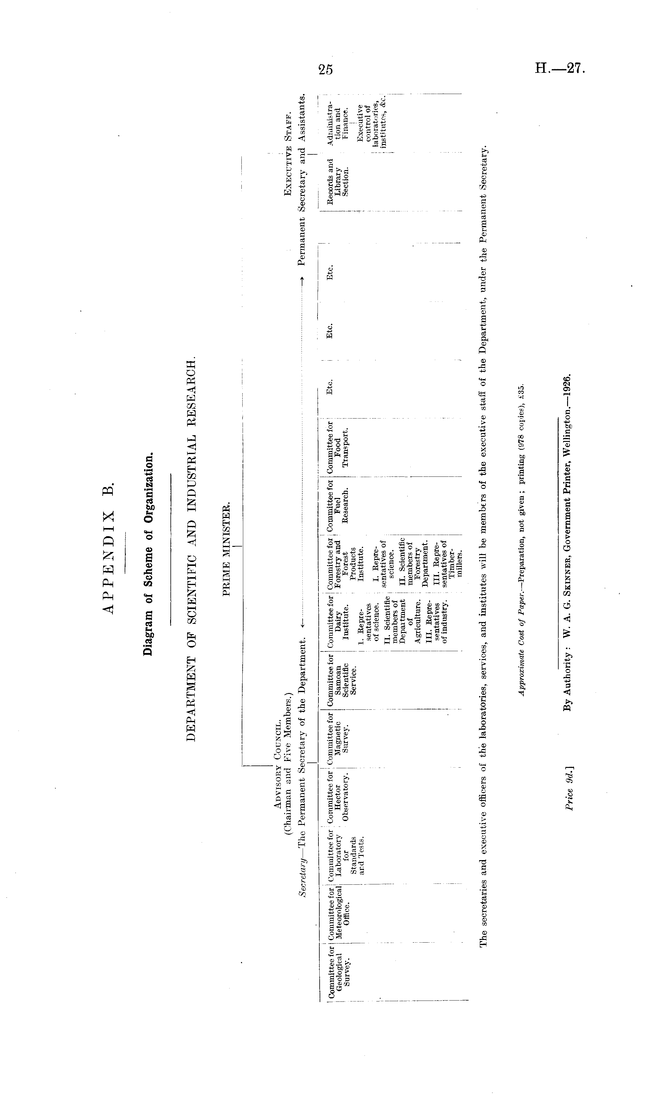 PRIME MINISTER. : I Advisory Council. (Chairman and Five Members.) Executive Staff. Secretary —The Permanent Secretary of the Department. — > Permanent Secretary and Assistants. : ~ f I I r - i I ~ ~ ■ j I 1 Committee for Committee for Committee for Committee for Committee for Committee for Committee for ! Committee for Committee for Committee for Etc. Etc. Etc. Records and AdministraGeological Meteorological Laboratory Hector i Magnetic Samoan Dairy Forestry and Fuel Food Library tion and Survey. Office. for Observatory. ; Survey. Scientific Institute. Forest Research. Transport. Section. Finance. Standards Service. Products ar.d Tests. 1. Repre- Institute. j Executive sentatives control of of science. I. Repre- ; laboratories, tt sentatives of I institutes, &c. II. Scientific o ripnop members of science. Department II. Scientific of members of Agriculture. Forestry III. Itepre- Department. sentatives III. Repreof industry. sentatives of Timbermillers. J I . The secretaries and executive officers of the laboratories, services, and institutes will be members of the executive staff of the Department, under the Permanent Secretary.